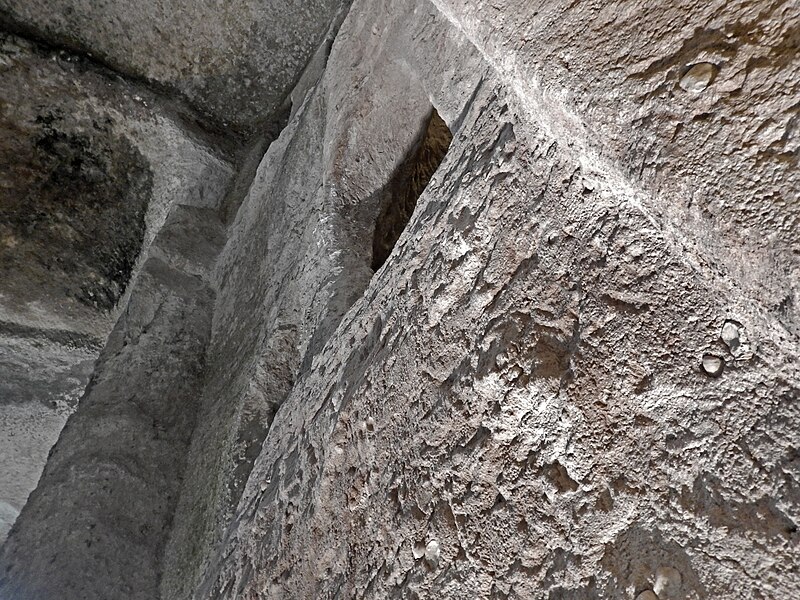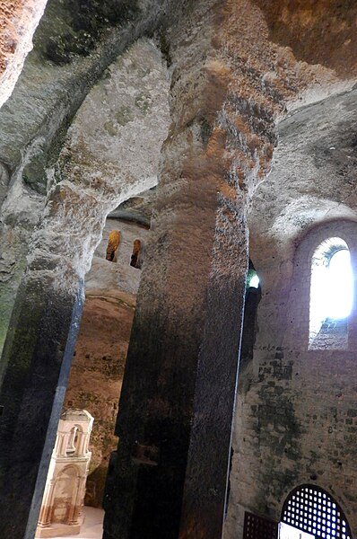 L’église monolithe s’inscrit dans un rectangle d’environ vingt‑sept mètres de long sur seize mètres de large, dimensions qui en font l’une des plus vastes de ce type en Europe. Elle se compose d’une abside hémicylindrique voûtée en cul-de-four précédée d’une large nef, séparée d’un unique bas-côté par une série de piliers massifs qui passent du plan octogonal à la base au plan carré au sommet, et d’un long vestibule voûté en berceau parabolique bordé d’enfeus. Les voûtes, taillées en plein cintre, s’élèvent à près de vingt mètres. À environ quinze mètres, l’église est entourée sur trois côtés d’une galerie — une sorte de triforium accessible par un escalier creusé dans le roc et, autrefois, aussi depuis l’extérieur — et un passage la reliait au château situé au‑dessus, sur une éminence calcaire dominant la vallée de la Dronne. Le mur opposé, épais d’un mètre quatre‑vingts, est percé de trois grandes baies en plein cintre qui éclairent directement le sanctuaire.