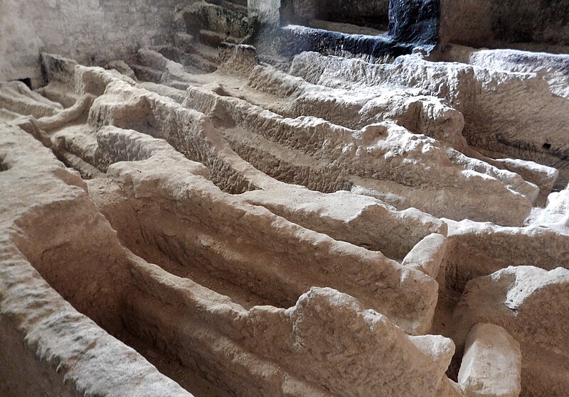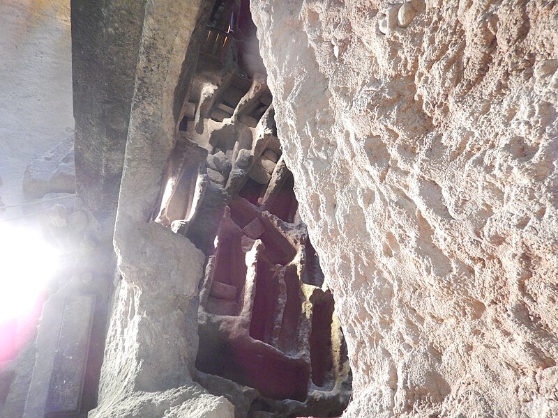 L’intérieur renferme un ensemble remarquable : un imposant reliquaire en pierre de six mètres de hauteur, une fosse à reliques, une cuve baptismale paléochrétienne ornée d’une croix grecque et une crypte antérieure à l’époque chrétienne où subsistent des stalles médiévales. Le reliquaire, placé au centre de l’abside, est un monument à deux étages orné de colonnettes et d’archivoltes dans la tradition romane, inspiré du Saint-Sépulcre tel que l’ont décrit les premiers croisés ; des dépouilles extraites en 1848 ont été identifiées comme appartenant à d’anciens seigneurs d’Aubeterre. À l’ouest s’étend une nécropole composée d’environ quatre‑vingts sarcophages à épaulement. L’église partage des traits architecturaux avec l’église monolithe de Saint‑Émilion et la modeste chapelle de l’ermitage Saint‑Martial à Mortagne‑sur‑Gironde. Enfin, si l’on parle d’église monolithe, le terme d’église troglodyte ou souterraine reste sans doute plus précis.