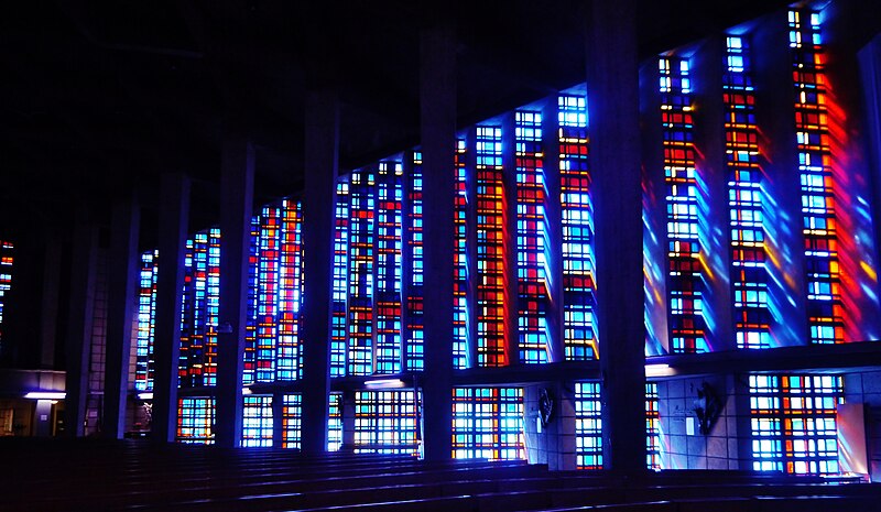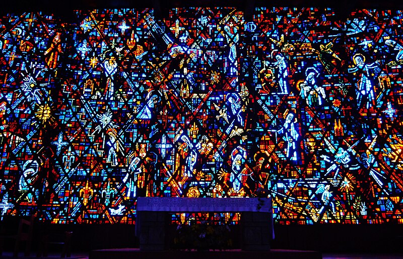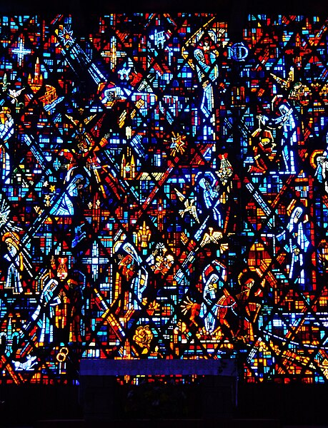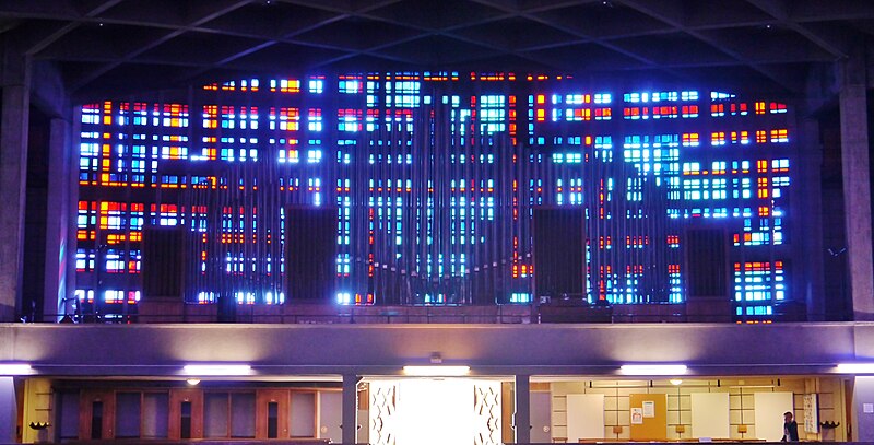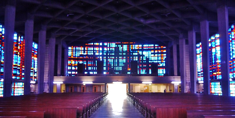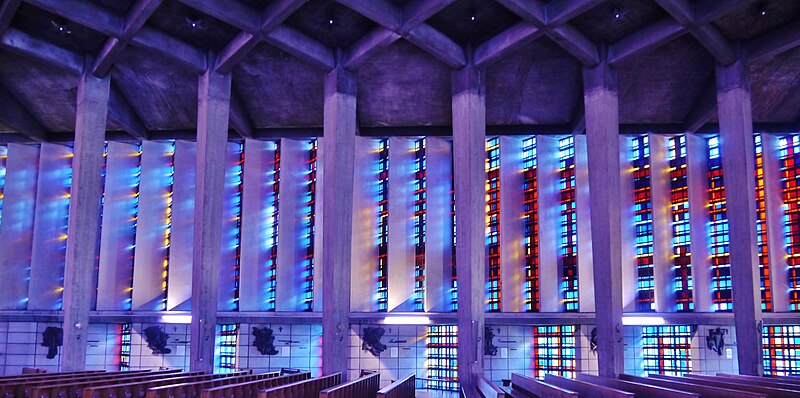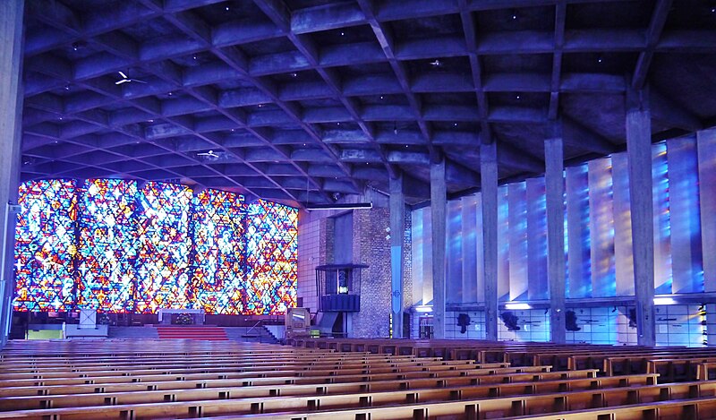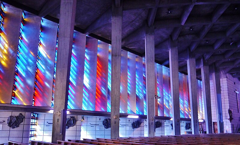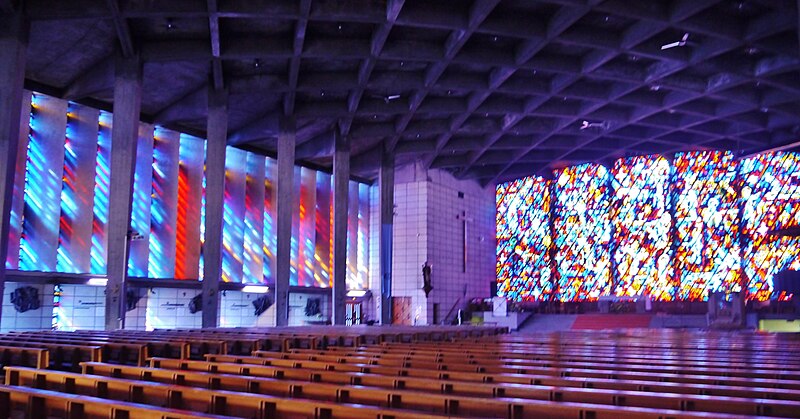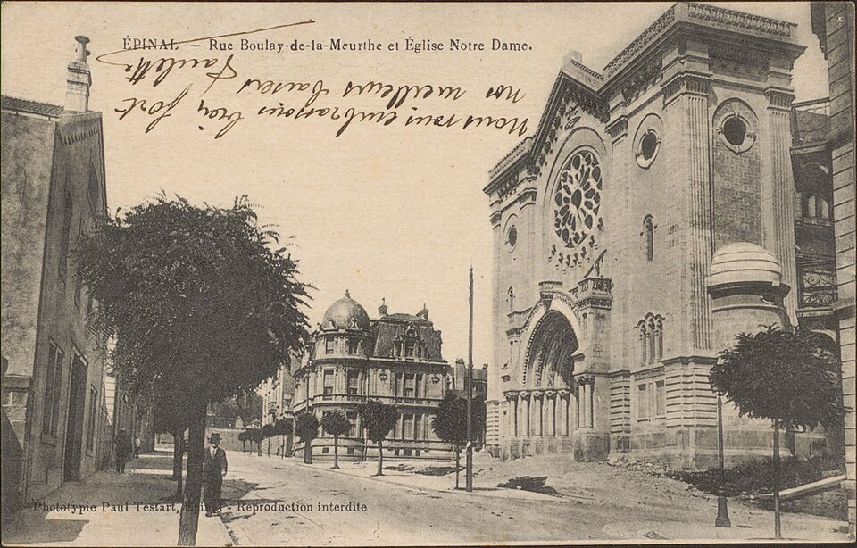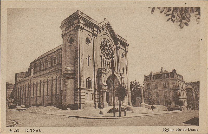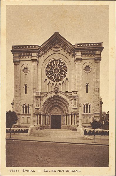 L'église Notre‑Dame‑au‑Cierge d'Épinal se dresse dans le quartier reconstruit du Boudiou et remplace la première église, construite en 1900 et détruite par les bombardements de 1944. La nouvelle église date de 1956 ; elle a été conçue par l'architecte Jean Crouzillard et consacrée le 12 octobre 1958. L'édifice, représentatif du renouveau de l'architecture religieuse, a reçu le label XXe siècle et est classé monument historique depuis 2011. Implantée sur l'axe nord‑sud du nouveau quartier, elle répond aux orientations de reconstruction et d'urbanisme qui ont redéfini la liaison entre la gare et le centre‑ville. Le plan forme un rectangle cantonné aux angles de quatre massifs de maçonnerie : celui du nord‑ouest abrite les sacristies sur quatre niveaux, celui du nord‑est sert de base à la tour du clocher et contient le baptistère. Le clocher hors‑œuvre, de plan circulaire, intègre le baptistère dans sa partie basse. La couverture est une lame de béton raidie par des poutres en béton armé, matériau choisi conformément aux recommandations de reconstruction. La façade, organisée en deux niveaux, présente au rez‑de‑chaussée un mur en moellon centré sur le portail et, au‑dessus, une verrière non figurative ; un auvent incurvé en béton surplombe le portail. Le portail, composé de deux vantaux coulissants en cuivre recouverts de plaques d'émail par Léon Leyritz en 1958, représente le Christ rayonnant et intègre de nombreux symboles ; il a été restauré et rendu à l'église en 2019. L'abside au nord est fermée par une vaste verrière figurative de Gabriel Loire qui occupe presque toute la hauteur du mur. Les façades latérales alternent en dents de scie des pans de béton et des vitraux, laissant largement passer la lumière. L'édifice mesure environ 55 m de long sur 32 m de large, pour une surface totale proche de 1 560 m2. À l'intérieur, seize colonnes délimitent la nef et les bas‑côtés ; au plafond, des poutres forment une série de losanges qui rappellent la structure de la verrière. Les vitraux latéraux, peu visibles depuis l'entrée, se révèlent progressivement en approchant du chœur, transformant l'espace de béton en une salle colorée et lumineuse. Le baptistère, installé à la base du clocher, comprend une vasque en pierre blanche coiffée d'un couvercle conique métallique manœuvrable par des poulies ; Léon Leyritz a réalisé sa décoration, qui comporte des scènes bibliques liées au baptême. La crypte, située sous le chœur, sert aux cérémonies de petite envergure ; son autel monolithique en marbre blanc est conservé depuis la création tandis que le reste du mobilier a été renouvelé en 1974 ; la statue de la Vierge du XVIIIe siècle a été déplacée de la crypte à l'entrée du chœur. La lumière constitue un élément majeur du décor : Gabriel Loire a réalisé l'ensemble des vitraux, principalement abstraits et dominés par des teintes de bleu et de rouge. La grande verrière du chœur, en un seul tenant et d'une surface de 180 m2, est la plus grande de France ; ses 396 panneaux losangés représentent la vie de la Vierge en dix‑sept scènes regroupées en trois cycles, lisibles de haut en bas en diagonale. Parmi les autres œuvres de Léon Leyritz figurent le chemin de croix en plomb, composé de quatorze stations où seules la première et la dernière figurent le Christ, ainsi que des appliques et la décoration du baptistère.