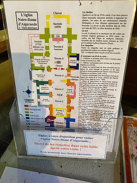 L'église Notre-Dame d'Aigurande, située dans la commune d'Aigurande (Indre, Centre-Val de Loire) dans la région naturelle du Boischaut Sud, dépend de l'archidiocèse de Bourges, du doyenné du Boischaut Sud et de la paroisse d'Aigurande. L'édifice a été construit entre le XIe et le XVIe siècle et a été inscrit au titre des monuments historiques le 12 juin 1926. Certaines portions des murs datent du XIe siècle et du milieu du XIIIe siècle; la tour-clocher appartient au XVe siècle, tandis que les parties hautes du clocher et les chapelles latérales datent du XVIe siècle. Le clocher a été surélevé à la fin du XVIe siècle et pourvu d'une charpente destinée à supporter les cloches; les écussons portent les noms des constructeurs Antoine Defaugères et Jean Moreau. La cloche la plus ancienne date de 1584, une autre de 1823 et deux datent de 1946. La nef unique comprend quatre travées suivies d'un chœur et d'un sanctuaire sur deux travées; les quatre premières travées sont les plus anciennes, les deux dernières sont plus récentes et le sanctuaire présente un chevet plat. L'ensemble de la nef, du chœur, des chapelles latérales et du sanctuaire a été voûté sur croisée d'ogives au XIVe siècle; ces voûtes ont fait l'objet de restaurations successives. Sur le flanc nord, quatre des six travées sont pourvues d'une chapelle latérale; sur le flanc sud se trouvent deux chapelles, dont l'une est fermée. Le mobilier comprend un maître-autel d'époque Régence (début du XVIIIe siècle) et plusieurs vitraux de la fin du XIXe siècle réalisés par l'atelier Lobin, notamment dans la chapelle Sainte-Germaine et la chapelle Sainte-Thérèse; la même chapelle abrite un petit vitrail contemporain de Nathalie Desnoyers (2008). Six tableaux représentant Saint Jacques fils d'Alphée, Saint Mathias, Saint Simon, Saint André, Saint Matthieu et Saint Barthélémy sont répertoriés dans la base Palissy. Parmi les éléments intérieurs signalés figurent une plaque à la mémoire des soldats morts en 1914-1918, une statue de Saint-Michel, la verrière de Nathalie Desnoyers et la chaire.