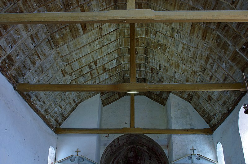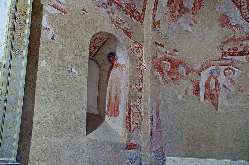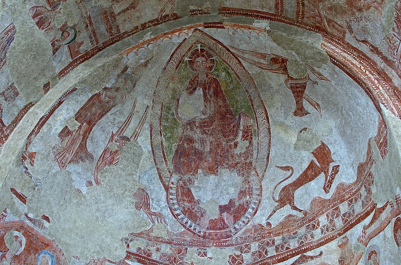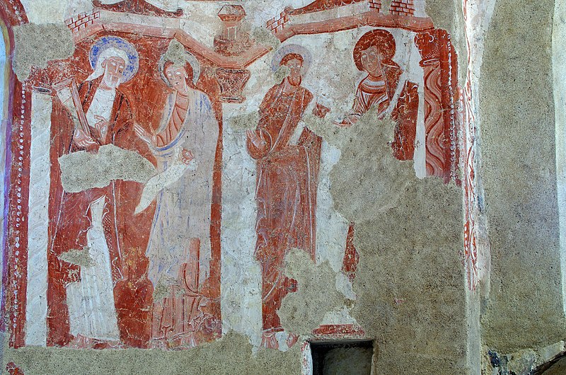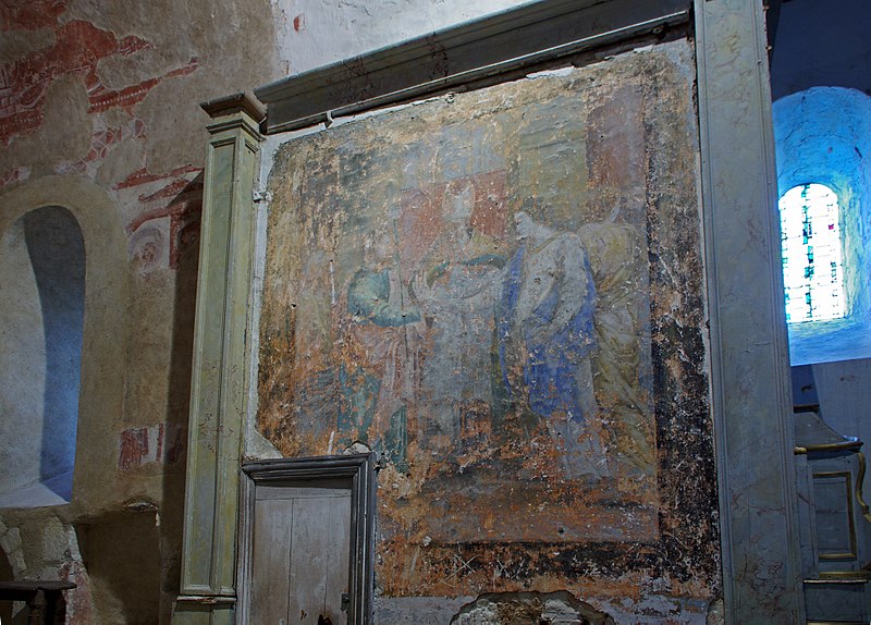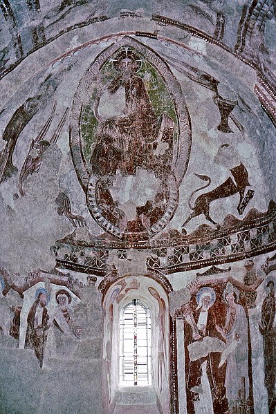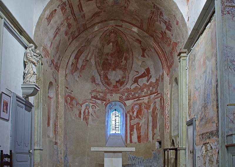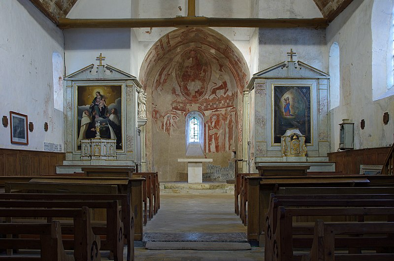Les murs intérieurs sont ornés de peintures murales, dont celles du chœur et de l'abside, datées du milieu du XIIe siècle. La restauration de ces décors a mis au jour des scènes figurant le Christ en majesté, l'Agneau nimbé, l'Annonciation, la Visitation, la Nativité, ainsi que des saints et des apôtres. Certaines peintures primitives ont été recouvertes par des campagnes picturales des XVe, XVIe et XVIIIe siècles et le décor original fut redécouvert en 1931 sous plusieurs couches d'enduit et de peinture à l'huile par Suzanne Trocmé. Les peintures du XIIe siècle ornent le chœur voûté en cul‑de‑four et sont réalisées en fresco pour les couches préparatoires et a secco pour les couches terminales et les rehauts. Sur le cul‑de‑four de l'abside, le Christ en gloire est entouré d'une double gloire, en amande et circulaire, et encadré par le tétramorphe dont un symbole a disparu ; sous le Christ se trouvent deux groupes de quatre apôtres.