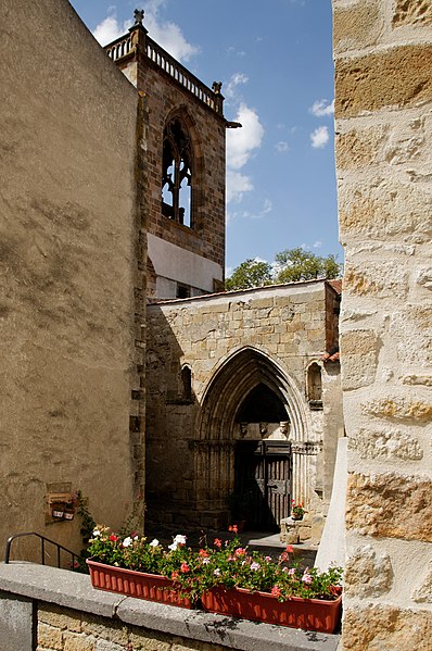 L'église Notre‑Dame d'Authezat est mentionnée dans une bulle de 1190 et, avant 1789, le culte marial y attirait un important pèlerinage. Elle résulte de la transformation, à partir du XIVe siècle, d'un édifice roman et présente des éléments romans et gothiques. De plan rectangulaire, l'édifice comporte trois nefs séparées par des piliers massifs. Les deux premières travées de la nef centrale forment le chœur ; elles sont voûtées d'ogives dont les clés sont rondes. Les ogives des trois travées orientales retombent sur des faisceaux de colonnettes engagées surmontées d'une frise de chapiteaux sculptés. Selon les travées, les ogives s'appuient soit sur des culots sculptés, généralement figurant des têtes humaines, soit sur des chapiteaux‑frises sans ornement. Le porche, de plan carré et voûté d'ogives, porte le clocher ; celui-ci ne comportait à l'origine que le premier niveau actuel, qui abrite une pièce voûtée d'arêtes. Le second étage, d'époque moderne et conçu dans un vocabulaire Renaissance, renferme les cloches ; chaque face s'ouvre sur une large baie à meneau perpendiculaire et le niveau est couronné d'une balustrade ornée, chaque angle étant décoré d'un fleuron. Le portail sud s'ouvre en arc brisé à trois voussures qui retombent sur un chapiteau‑frise sculpté appuyé sur des colonnettes rondes reposant sur des bases prismatiques. Un linteau porte trois têtes couronnées sculptées en relief et le tympan a été remplacé par un vitrail. De part et d'autre de l'arc supérieur se situent deux niches à arc tréflé, elles aussi retombant sur de petits chapiteaux sculptés et des colonnettes rondes à base prismatique posées sur des appuis saillants ornés de motifs sculptés. Le portail conserve ses vantaux anciens, munis de pentures ouvragées typiques de l'Auvergne. L'édifice, daté essentiellement du XIVe siècle, a été classé au titre des monuments historiques en 1980.