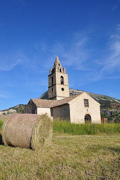 L'église Notre-Dame d'Entraigues se situe sur la commune de Tartonne, dans les Alpes-de-Haute-Provence ; l'édifice a été inscrit au titre des monuments historiques en 1972. La morphologie et le décor sculpté indiquent que la nef et le chœur datent du XIIIe siècle. Le clocher, fidèle au modèle alpin dont le prototype est le clocher de la cathédrale d'Embrun, porte la date 1564 mais n'a été achevé qu'en 1621 par les maçons dignois Jean Roubaud et Pierre Lavigne. Aux XVIIe siècle ont été édifiées les chapelles latérales. La voûte de la nef a été partiellement reconstruite en 1830. Entre 1863 et 1865, l'agent-voyer Arnaud fit surélever le clocher d'un étage. En 1891-1892, une importante campagne de travaux conduite par l'entrepreneur Jules-André Roux sous la direction de Joseph Cressy, maître maçon assurant la fonction d'architecte, remplaça la couverture en lauses par un toit en tuiles creuses sur charpente, démolit la petite nef formée par les deux chapelles latérales sud et supprima la cloison isolant une petite sacristie au fond de l'abside. En 1931, le clocher, lézardé par la foudre, fit l'objet de travaux de restauration dirigés par l'ingénieur des Travaux publics Parat ; l'entrepreneur Étienne Arniaud procéda à la démolition puis à la reconstruction à l'identique de la partie supérieure de la flèche et des pyramidions. Une nouvelle campagne de restauration fut menée en 1976 par l'architecte en chef J.-P. Ehrmann.