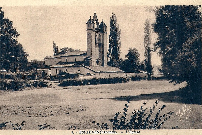 L'église Notre-Dame d'Escaudes est une église catholique située au centre du bourg d'Escaudes, en Gironde, avec son cimetière jouxtant l'édifice. Elle a été édifiée vers le XIe ou le XIIe siècle, réaménagée au XVIe siècle — période au cours de laquelle le clocher‑mur a été construit — puis agrandie au XVIIe siècle. L'ensemble de l'édifice a été inscrit au titre des monuments historiques par arrêté du 24 décembre 1925. Parmi ses éléments caractéristiques figurent le clocher‑mur, le portail à une voussure avec piliers simples et le chœur, visibles sur des photographies datées de juillet 2011 et sur une gravure de Léo Drouyn (1884). L'église est documentée dans les bases et observatoires du patrimoine, notamment Mérimée et Palissy, et fait l'objet de notices et de ressources disponibles sur le site de la commune, sur Wikimedia Commons et dans la presse locale.