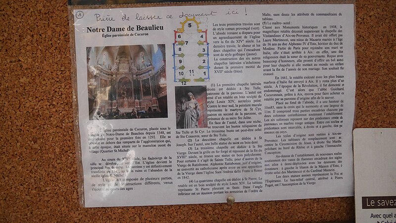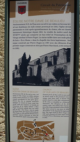 L'église paroissiale Notre-Dame-de-Beaulieu de Cucuron présente des origines médiévales dont la datation précise reste incertaine : la nef est attribuée à une première construction du milieu ou de la seconde moitié du XIIIe siècle. Au cours de la première moitié du XIVe siècle furent ajoutées la quatrième travée, deux chapelles, le chœur et le portail d'entrée. Le chevet pentagonal et la voûte de la quatrième travée correspondent à une reconstruction gothique effectuée à cette période. Le bourg de Cucuron, mentionné dès 1017 comme castrum, s'est étendu au pied de la colline et de nouveaux faubourgs se sont développés vers l'est au XIVe siècle, entraînant la construction d'une église pour ce quartier ; l'édifice est cité en 1292 puis en 1348 sous le nom ecclesia beate Maria de pulchro loco, Notre-Dame-de-Beaulieu. La paroisse y fut transférée en 1541 après la ruine de l'église Saint-Michel, et la même année les consuls décidèrent d'englober les nouveaux faubourgs et l'église dans une nouvelle enceinte pour se prémunir contre de nouvelles invasions. La seigneurie locale passa notamment entre les mains des Sabran, dont Rainier (1160-1224) puis Guillaume (1200-1259) et leurs descendants, cités dans les sources médiévales. Aucun texte ne permet de préciser finement toutes les phases de construction antérieures au XVIIe siècle ; c'est l'étude archéologique du monument qui a permis de reconstituer ces campagnes de travaux. L'église est à nef unique de quatre travées : les trois premières, de style roman provençal, sont couvertes en berceau brisé, tandis que la quatrième est voûtée selon des formes gothiques. Le clocher fit l'objet d'un projet après l'effondrement du clocher de Saint-Michel en 1588 ; la construction fut interrompue en 1596 et, relevée par la suite, resta longtemps inachevée avant d'être finalisée en 1624, les travaux ayant été commencés par Rolland Jacomin puis achevés par ses fils Pascal et Claude. L'interruption entre 1588 et 1620 tient à une malfaçon qui provoqua un effondrement du chantier. Les chapelles latérales ont été édifiées par des confréries successives, de la quatrième travée vers l'entrée : celles de la quatrième travée, de style gothique, datent probablement du milieu du XIVe siècle ; les chapelles flanquant la troisième travée, dédiées à saint Blaise au nord et au Rosaire au sud, étaient en place en 1620 ; les autres chapelles datent du XVIIe siècle. L'église a fait l'objet d'une réfection complète de la toiture en dalles de pierre et d'un décapage des enduits intérieurs en 1961. Classée au titre des monuments historiques le 25 septembre 1961, elle conserve un mobilier principalement daté des XVIe et XVIIIe siècles. Un maître-autel de 1517 a disparu entre 1789 et 1795 ; en 1801 la paroisse mit en place un nouveau retable initialement commandé en 1661 pour la chapelle de la Visitation d'Aix-en-Provence par Laure Martinozzi. Les tableaux originaux de Reynaud Levieux qui décoraient ce retable se trouvent aujourd'hui dans l'église de la Madeleine à Aix ; ils ont été remplacés par des peintures du XVIIIe siècle représentant la Circoncision au centre, l'Immaculée Conception ainsi que sainte Marthe et sainte Marguerite. L'orgue a une longue histoire : un premier instrument fut construit vers 1614 par Pierre Marchand ; l'orgue actuel situé sur la tribune d'entrée a été réalisé entre 1786 et 1788 par Pierre Duges. De l'orgue de Pierre Marchand subsistent un peu plus de quatre jeux, le reste relevant du XVIIIe siècle ; l'instrument a été modifié en 1810 par François Borme, en 1835 par un facteur italien (Giovanni Mentasti ?), puis au XXe siècle, avant d'être restauré dans son état d'origine entre 1975 et 1983 par Patrice Bellet. Le buffet, simple et composé de trois tourelles encadrant deux plates-faces, a été exécuté par le menuisier Augustin Moutonnet.
