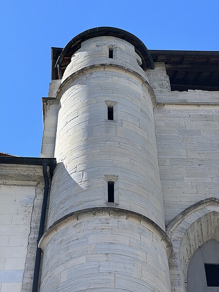 L'édifice conserve des éléments romans : il ne comportait pas de voûte à l'origine et des murs de style roman subsistent sur les flancs de la nef, où trois chapiteaux du XIe siècle sont encore visibles. Remanié à plusieurs reprises, le bâtiment adopta sa façade actuelle conçue et élevée en 1720 par l'architecte Jean‑Pierre Galezot. À droite de cette façade se trouve un portail de style gothique flamboyant construit en 1525 à la demande de l'abbé Antoine de Montécut, premier abbé commendataire et aumônier de Marguerite d'Autriche ; selon la tradition, sa sculpture serait l'œuvre d'artisans franc-comtois ou d'artisans ayant travaillé en Franche‑Comté après la fermeture du chantier de Brou.