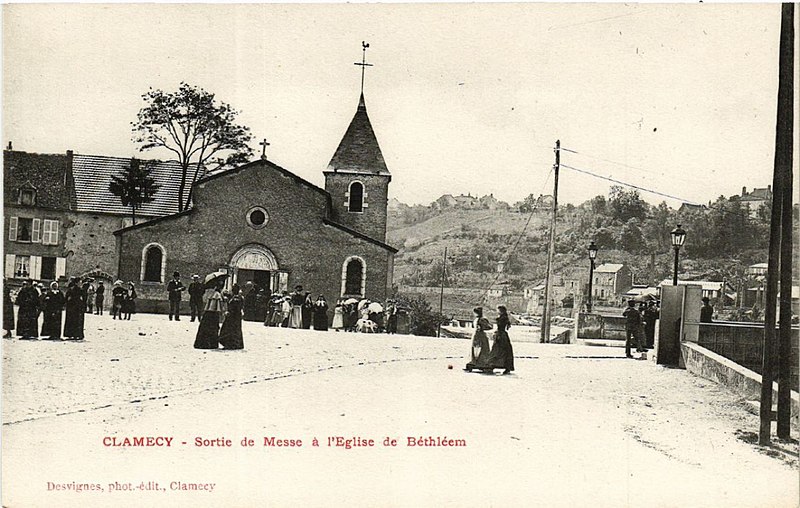 L'église Notre-Dame-de-Bethléem se situe à Clamecy (Nièvre), entre le quai de Bethléem et la route d'Armes, le long du canal du Nivernais. Son nom rappelle l'installation à Clamecy des évêques de Bethléem, venus en exil de Palestine et présents dans la ville de 1225 à 1793. L'édifice actuel, construit en ciment armé par l'architecte Georges Théodore Renaud en 1926-1927, s'élève sur l'emplacement d'implantations religieuses antérieures, notamment d'une église provisoire construite vers 1823 puis d'une église dédiée à Notre‑Dame‑de‑Bethléem édifiée en 1869 et démolie dans les années 1920. La nouvelle construction, consacrée le 23 avril 1927 par l'évêque de Nevers, monseigneur Pierre Chatelus, adopte un parti stylistique orientalisant évoquant la Terre Sainte et l'ancienne tradition épiscopale de Bethléem ; son inspiration romano-byzantine se manifeste notamment par une coupole plate. L'édifice est présenté comme la troisième église en béton armé édifiée en France ; une partie importante du mobilier, y compris celui du chœur, est également réalisée en ciment armé. Sous le chœur, la crypte est ornée de peintures murales exécutées à la fin des années 1940 et dans les années 1950 par l'abbé Nicolas Boon, vicaire de la paroisse, en collaboration avec le peintre Robert Pouyaud. La dernière cérémonie religieuse dite dans l'église remonte à 1966 ; par la suite, seules des messes et des catéchismes ont continué à se tenir dans la crypte. L'édifice a été inscrit au titre des monuments historiques le 14 janvier 2000 et acquis par la ville de Clamecy en 2002 auprès de l'association diocésaine de Nevers.