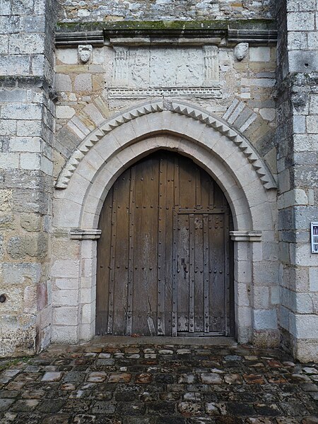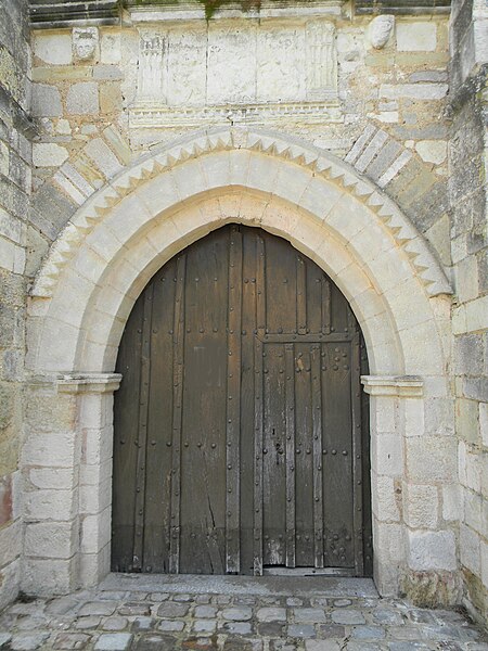 La façade, datée du XIIe siècle, est soutenue par quatre contreforts rapportés et présente un jeu de pierres de teintes variées et de réemplois ; le portail à double rouleau conserve l’arc de décharge d’origine, le reste ayant été restauré récemment. Le mélange de lignes courbes et droites a été qualifié de romano‑grec. Sur le côté nord extérieur, la zone dite « le tripot » était autrefois occupée par une buvette en bois vers 1900 ; ce secteur a aussi accueilli, antérieurement, un cimetière d’enfants non baptisés.