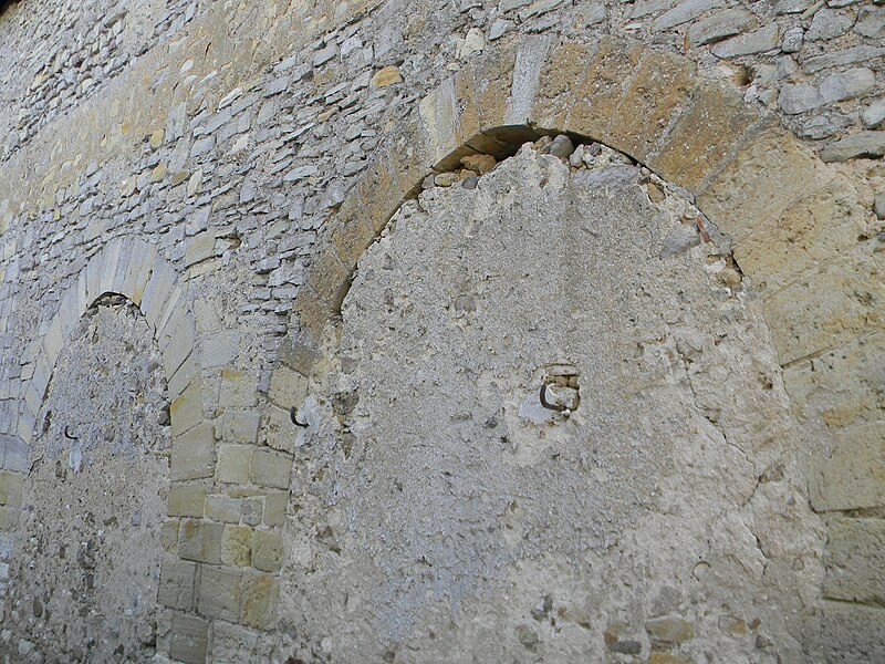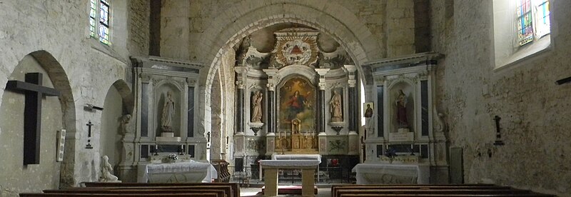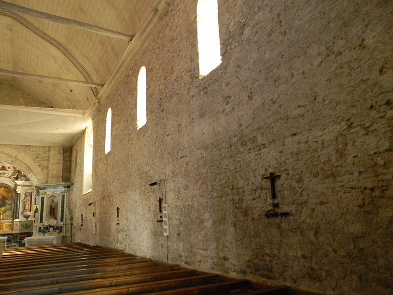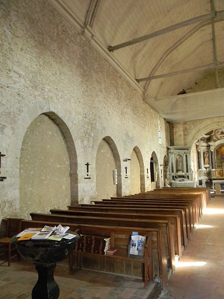 La nef, large de 9,20 m et longue de 24,20 m, offre une impression d’austérité soutenue par des contreforts sur le mur sud ; elle conserve trois petites fenêtres ébrasées, sans doute d’origine romane, et un grand vitrail plus récent. Le mur nord comporte six arcades murées dont les intrados montrent qu’elles étaient destinées à être ouvertes, peut‑être pour une galerie latérale débouchant dans le bras gauche du transept ; on y remarque une litre et deux blasons ornés d’une croix pattée. Des remplois de sarcophages mérovingiens figurent dans la croisée du transept et sous certains éléments de l’arcature.