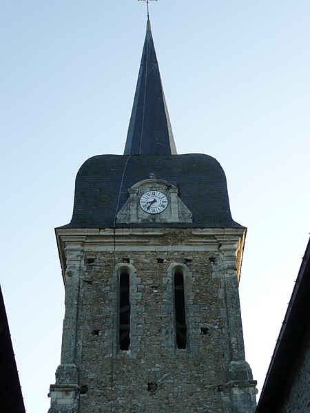 Le clocher a fait l’objet d’un récit local indiquant qu’il fut frappé par la foudre autour de 1730 et reconstruit ensuite ; le nouveau massif, cantonné de contreforts épais, est couvert d’une toiture d’ardoises en forme de « casque » et dominé par une flèche en « bec d’hirondelle ». Un témoignage du XIXe siècle attribue la prise en charge d’une partie des frais de reconstruction à une dame de la paroisse, Anne Amat, et rapporte une anecdote concernant l’allongement finalement non réalisé de la flèche.