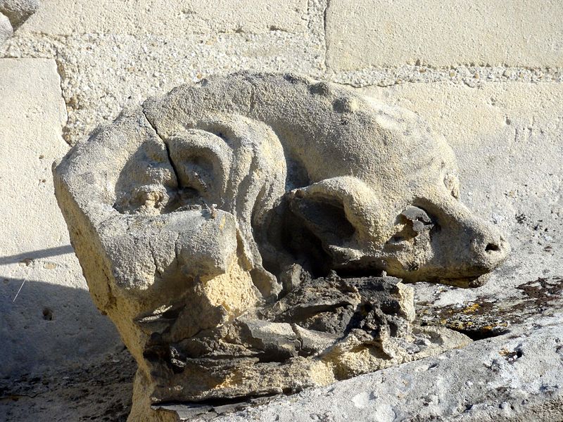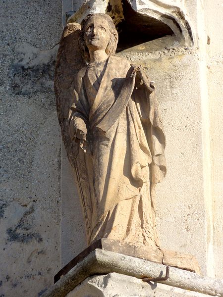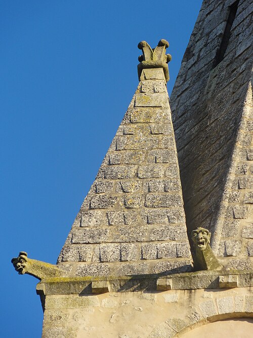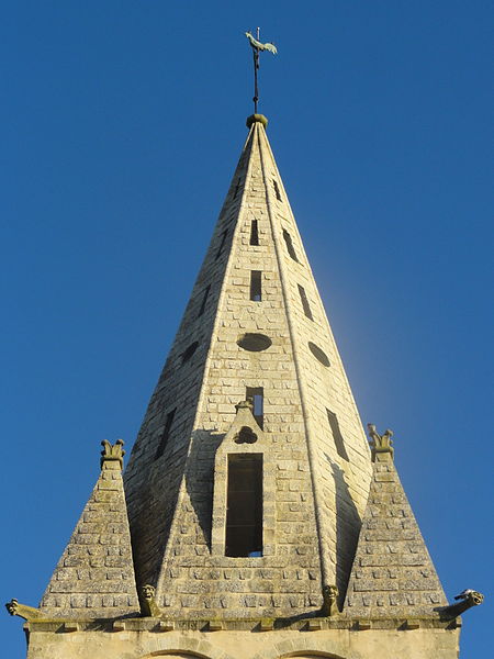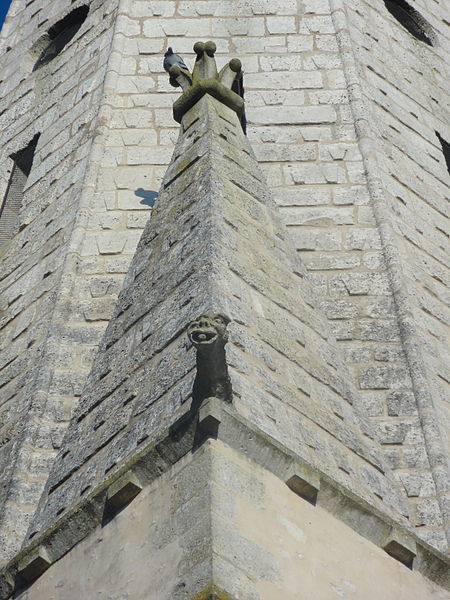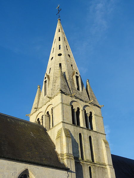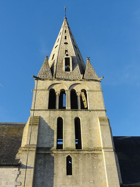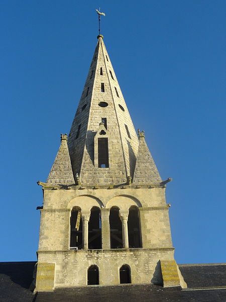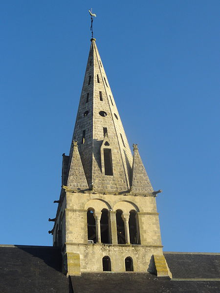 L'élévation extérieure montre un clocher à trois étages, un étage de beffroi sobre percé de baies gémelées et une flèche octogonale agrémentée de lucarnes et de pyramidons; les murs sont en moellons enduits avec emploi de pierre de taille pour chaînages, entourages des baies et contreforts, et le portail méridional, en anse de panier, conserve des niches à statues et des vantaux sculptés. L'édifice a été endommagé par les bombardements lors des combats de la Libération en août 1944 ; le portail méridional a été restauré en 1979 par un artisan local et les vitraux ont été remis en état grâce aux reliquats des dommages de guerre alloués à la commune.