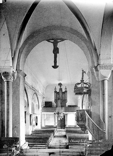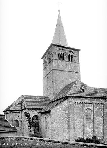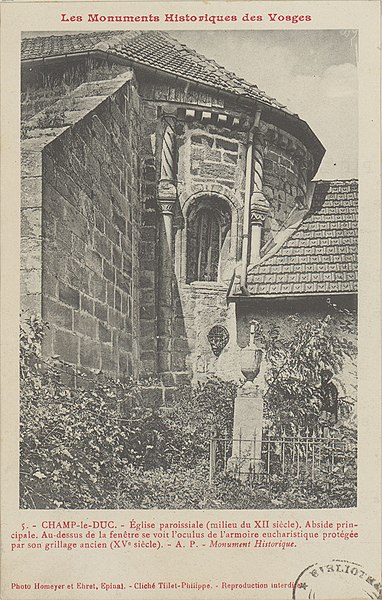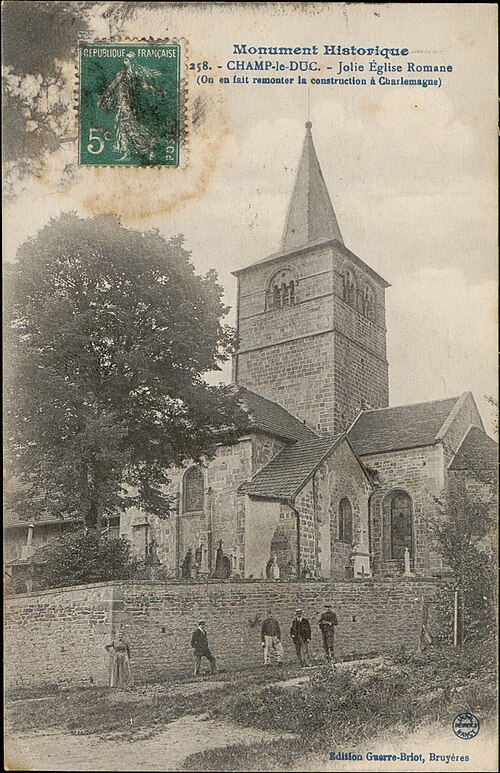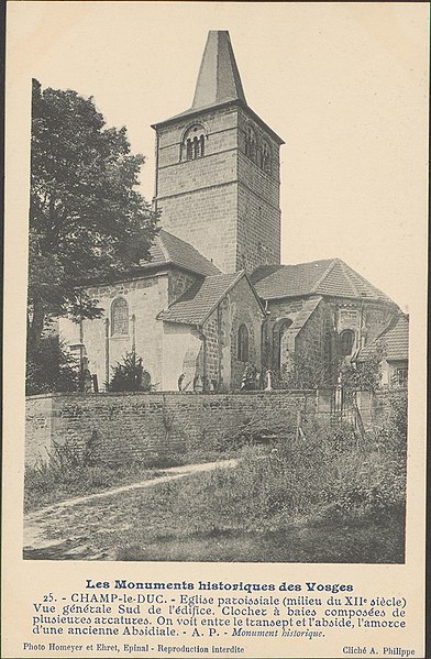 L'église de l'Assomption-de-Notre-Dame de Champ-le-Duc, située dans les Vosges, est un édifice de style roman. Datée du XIIe siècle, sa construction est parfois avancée au XIe siècle sans preuve ; d'autres sources la situent vraisemblablement dans le troisième quart du XIIe siècle. Elle a été édifiée sur le site d'une prétendue villa du IXe siècle dont la fondation est attribuée, selon la tradition, à Charlemagne, qui venait chasser dans la région. L'église fut l'une des premières et la plus importante de la vallée de la Vologne ; le village préexistait à la ville de Bruyères et formait le centre d'une paroisse qui a compté jusqu'à 34 villages ou communautés et sept églises annexes. Le pape aurait accordé l'édifice comme principauté ecclésiastique à Jean‑Claude Sommier, archevêque de Césarée. L'église a connu plusieurs campagnes de restauration, notamment au XVIIIe siècle, après la Seconde Guerre mondiale et à la fin du XXe siècle à la suite d'un incendie. Classée au titre des monuments historiques depuis le 7 mars 1908, elle présente des éléments remarquables tels que le chevet, la façade avec son porche moderne à arc en anse de panier, et un chœur rénové. L'orgue de tribune, attribué à Nicolas Dupont et construit en 1781, a été transformé par Jacquot Jeanpierre en 1871 puis restauré en 1990 par Bernard Dargassies ; sa partie instrumentale est classée au titre des objets des monuments historiques depuis le 6 décembre 1965 et le buffet depuis le 9 juillet 1975. L'autel‑tombeau en forme de console pleine, orné d'un médaillon central, et le tabernacle, datés du XVIIIe siècle, sont classés au titre des immeubles depuis 1840, et les fonts baptismaux du XVIe siècle sont protégés au titre des objets depuis le 7 mars 1908. Parmi les curés de Champ‑le‑Duc se succédèrent, entre autres, Jean Perpignan ; Jean Genaz (mai 1676–janvier 1694) ; Jean Philbert Estienne (janvier 1694–15 mars 1696) ; Jean‑Claude Sommier (27 mars 1696–1737) ; Claude Joseph, baron de La Marre (1737–1756) ; Charles Melchior Mathiot (1756–1772) ; Lambert Flageollet (1772–1782) ; Dominique de Saint‑Privé (1782–1797) ; Lucien Foucher ; René Simon (1910–1923) ; Albert Mercier (1925–1945) ; Villaume ; et Pierre Delagoutte.