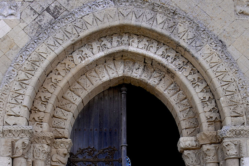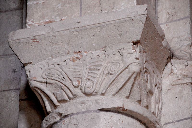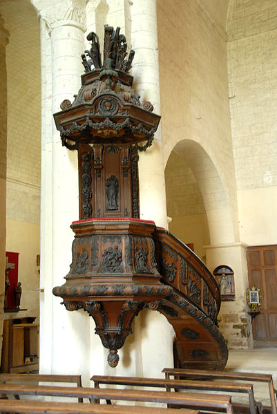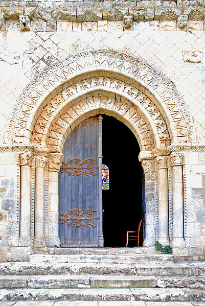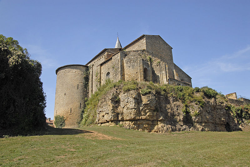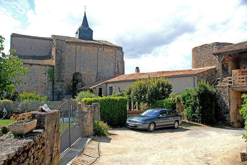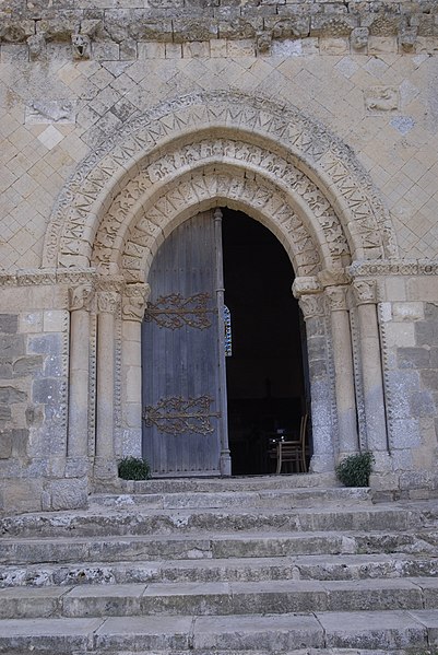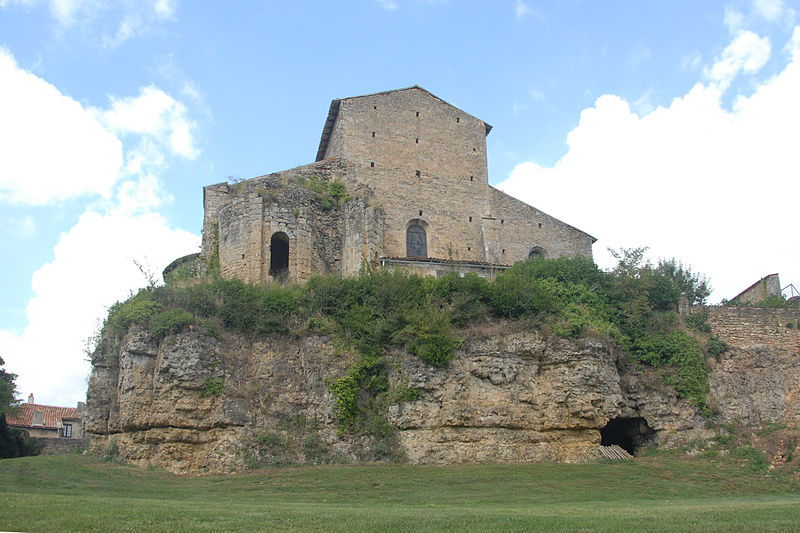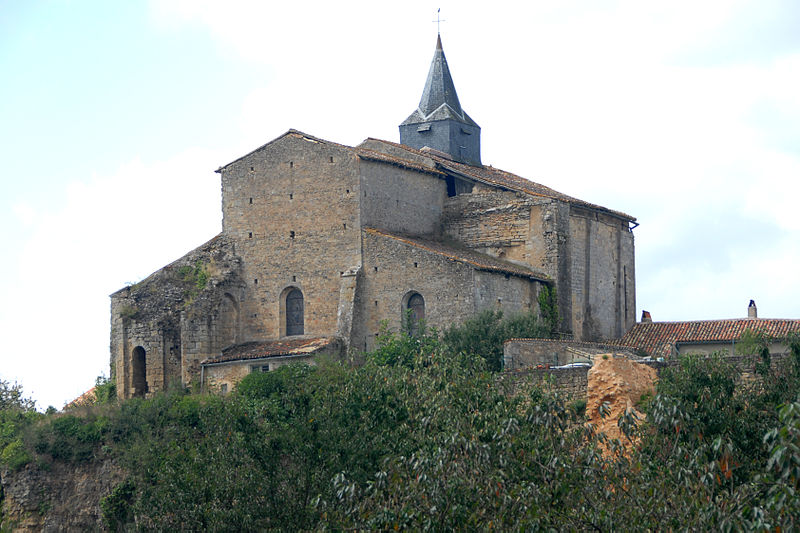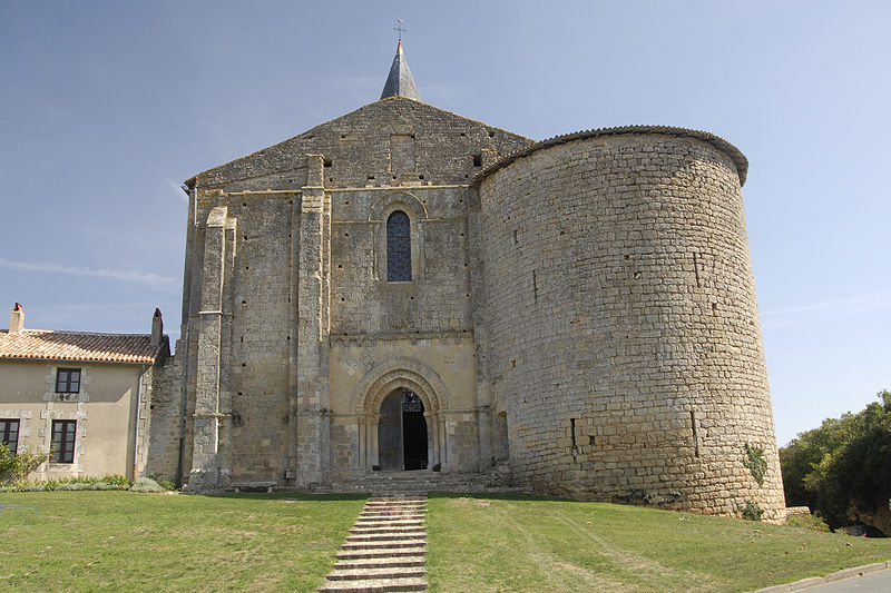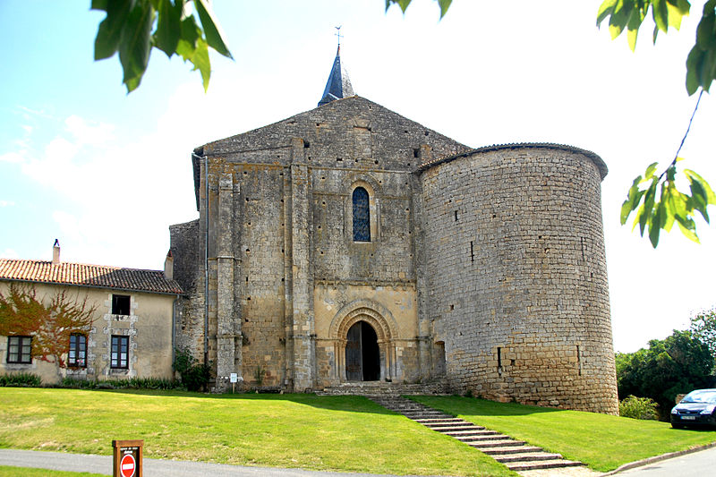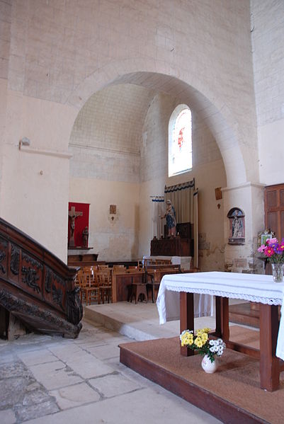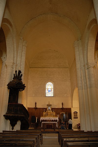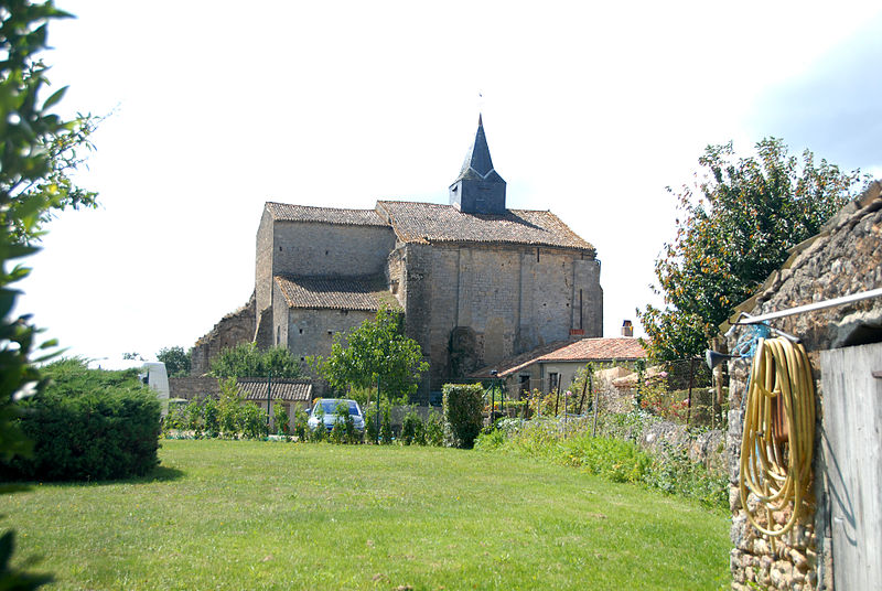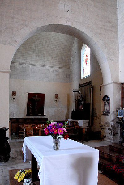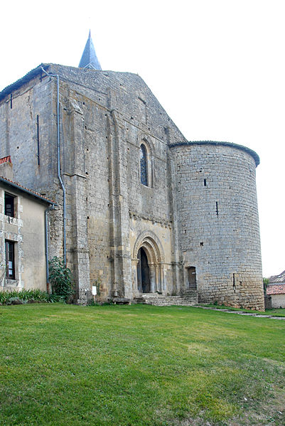 L’église est pour l’essentiel du XIIe siècle. Les murs latéraux conservent des pilastres du XIe siècle. Les trois travées originelles de la nef semblent avoir été réduites à deux, peut‑être au XIIIe siècle. Le chœur et les absides des bras du transept ont disparu pendant les guerres de Religion et ont été remplacés par un mur droit qui barre le transept. Les doubleaux des voûtes, en arcs brisés, datent du XIIe siècle, tandis que les voûtes elles‑mêmes, en plein cintre, ont probablement été refaites au XIVe siècle. Le clocher s’est effondré en 1668; il a été remplacé par un simple beffroi qui s’élève au‑dessus de la nef. Le portail, en arc brisé et composé de trois voussures, est surmonté d’une corniche à modillons; l’appareil présente un décor en losange et deux pierres sculptées.