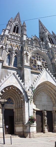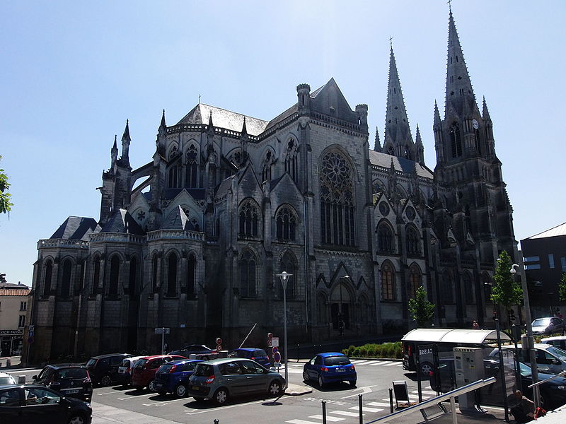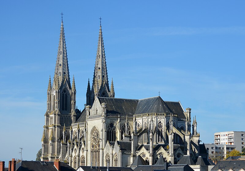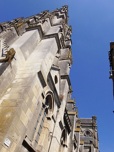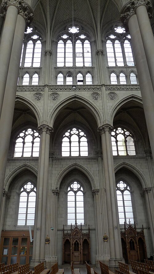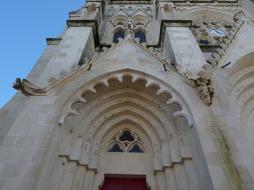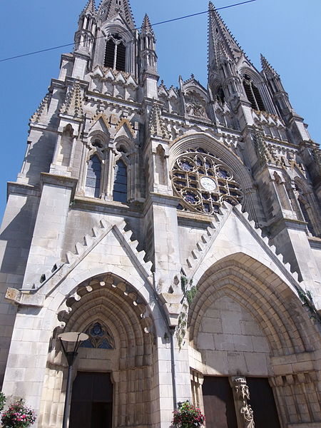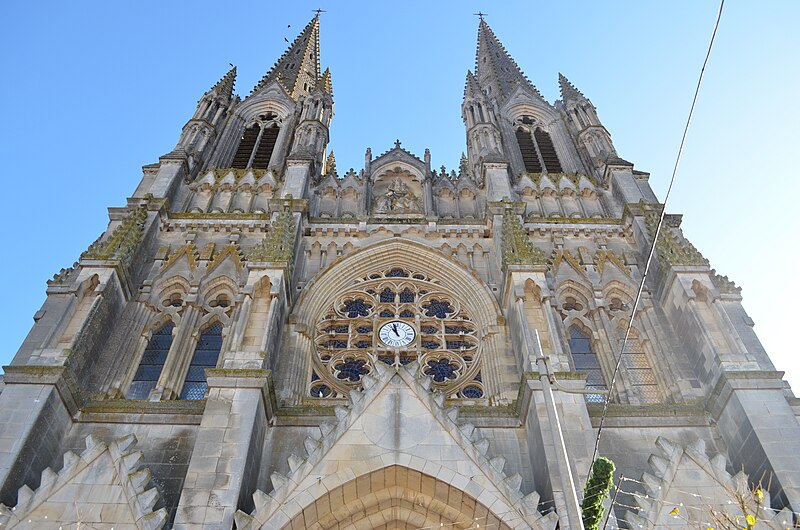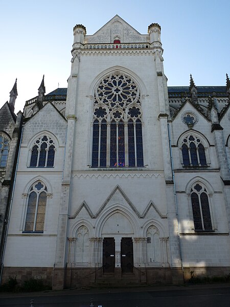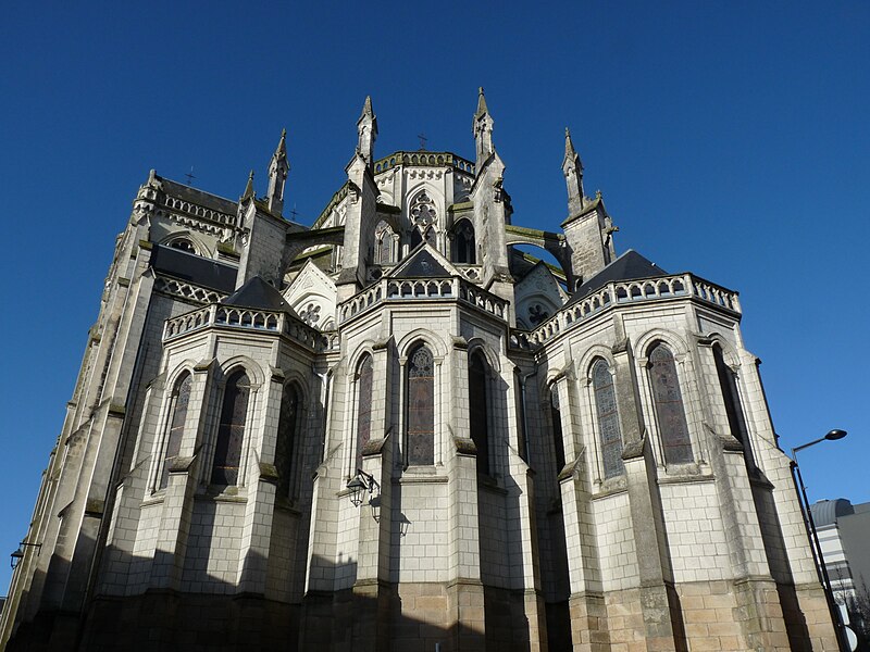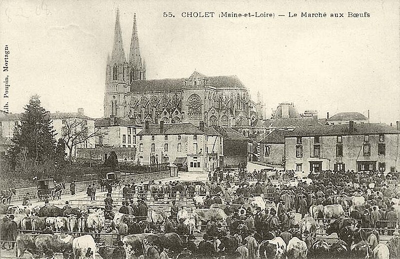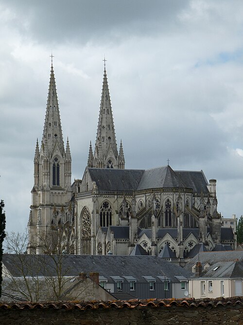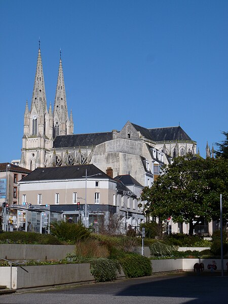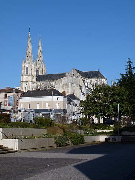 L'église Notre‑Dame se situe au cœur du centre historique de Cholet, sur le parvis Saint‑Jean‑Paul‑II près de la place Travot, dans le diocèse d'Angers (Maine‑et‑Loire). Elle occupe l'emplacement d'une priorale médiévale fondée par des religieux de l'abbaye de Saint‑Michel‑en‑l'Herm et devenue paroissiale vers 1185 sous le premier curé, Guillaume de Bland. Au XVe siècle, la chapelle du prieuré fut reconstruite en une petite église non voûtée, pourvue de bas‑côtés étroits et d'une horloge extérieure. Durant la Révolution, l'édifice échappa à la destruction en servant de magasin de fourrage, d'écurie puis de prison, mais il s'est délabré rapidement et fut fermé en 1812 pour danger d'effondrement. Démolie en 1814, elle fut remplacée par une nouvelle église achevée en 1820 grâce au curé Élie Beurier, mais celle‑ci devint bientôt insuffisante pour la population. Une quatrième construction, conduite d'après les plans de l'architecte Alfred Tessier, se déroula entre les années 1854 et 1887, marquant la transformation néo‑gothique de l'édifice. Dès les années 1850, la reconstruction s'inspira des modèles du XIIIe siècle et incorpora des éléments tels que la nef avec bas‑côtés, des chapelles latérales, un chœur à déambulatoire et chapelles rayonnantes, ainsi qu'une charpente métallique de type Polonceau. En 1872, Auguste Turpault fit don de l'autel, initialement accompagné de six bougeoirs, et d'un vitrail placé au‑dessus de la porte d'entrée, et à partir de 1883 la réalisation des deux clochers et flèches fut menée sous l'autorité de Louis‑Joseph Luçon. Propriété de la commune, l'église est inscrite au titre des monuments historiques depuis 1999. De style néo‑gothique et réalisée en pierre, elle présente un chœur à cinq absidioles, un transept et deux clochers surmontés chacun d'une flèche élancée terminée par une croix en fer forgé ; ces flèches atteignent 65 mètres au‑dessus du parvis. Ses dimensions en font la deuxième plus vaste église du diocèse, après la cathédrale Saint‑Maurice d'Angers. La façade est ornée d'une statue de la Vierge due au sculpteur choletais Stanislas Biron. L'intérieur conserve un tableau intitulé Le Triomphe de la Vierge, une peinture à l'huile du XVIIe siècle, ainsi qu'un autel du XIXe siècle pourvu d'une croix et de six chandeliers. On y trouve également deux groupes en marbre du sculpteur Hippolyte Maindron : Sainte Geneviève par ses prières désarme Attila (1857) et Le Baptême de Clovis par Saint Rémi (1865). Quatre cloches composent le carillon installé dans le beffroi nord depuis 1885 : Marie‑Joseph, bourdon de 1 500 kg baptisé en 1848 (do dièse) ; Agathe, 1 200 kg baptisée en 1847 (ré dièse) ; Magdeleine, 750 kg fondue en 1837 et sonnant l'Angélus en mi ; et Henriette, fondue en 1837 (sol dièse). Ces quatre cloches produisent les notes correspondant à la troisième octave du piano. L'orgue actuel a été construit par Joseph Beuchet entre 1965 et 1969 en intégrant l'ancien instrument de Louis Debierre, installé en 1903, et il comprend trois claviers manuels et un pédalier ; l'ancien orgue a été successivement placé au fond du chœur puis dans le transept droit, emplacement actuel de l'instrument. Des travaux de restauration portant sur les pointes de flèches, les ceintures métalliques, les contreforts et les vitraux ont été programmés pour 2016. Les représentations visuelles disponibles montrent l'édifice sous divers angles extérieurs et intérieurs, notamment la vue d'ensemble en ville, les clochers, la rosace et l'horloge Bodet, la sculpture entre les clochers, la nef, les vitraux, la chaire, les orgues et la chapelle de la Vierge. Parmi les curés successifs figurent François Rabin (1770‑1790), Élie Beurier (1802‑1824), François‑Augustin Coutant (1854‑1882), Louis‑Joseph Luçon (1882‑1888), Eugène Grellier (1888‑1893), Jean‑Baptiste Dubillot (1893‑1928), Paul Gallard (1928‑1940), Pierre Douillard (1941‑1947) et Joseph Amiot.