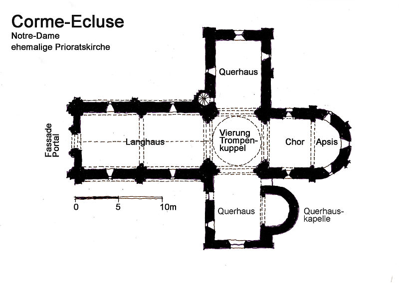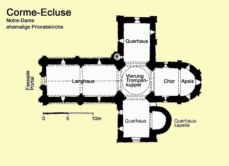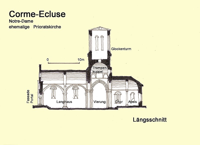 L'église Notre-Dame de Corme-Écluse est un édifice roman saintongeais situé en Charente-Maritime, ancien siège d'un prieuré bénédictin dépendant de l'abbaye royale de Saint-Jean-d'Angély. Elle a été donnée vers 1104 par l'évêque de Saintes à cette abbaye, qui a commandité la reconstruction du sanctuaire au milieu du XIIe siècle. Une plaque apposée sur le mur sud de la nef conserve des mentions évoquant l'achèvement et l'ornementation en 1200, une visite en 1327, l'établissement d'un pèlerinage en 1628 et la mutilation ultérieure d'une statue. Le plan de l'église est en croix latine légèrement asymétrique, le bras nord du transept étant plus long que le bras sud. La nef, composée de deux travées voûtées en berceau, est éclairée par des fenêtres refaites au XIIIe siècle ; l'abside en cul-de-four, éclairée par trois baies symboliques, a été restaurée au XIIe siècle. La croisée du transept, sous le clocher, est couverte d'une coupole sur trompes et le bras sud s'ouvre sur une absidiole voûtée ; le croisillon nord, rebâti au XVIIe siècle dans un style roman, est de plan rectangulaire et possède un portail à colonnes et rouleaux toriques. La façade occidentale, tripartite au rez-de-chaussée, présente une porte centrale flanquée de deux fausses portes, des arcatures aveugles et un pignon ; ses voussures et archivoltes sont ornées d'entrelacs mêlés de figures humaines et animales, et la sculpture de la façade est datée de la période 1130-1140. Le portail central porte une voussure externe décorée d'une série d'oiseaux et d'un personnage assis à la clé du cintre, motif dont les bras ont été en partie détruits. Parmi les huit chapiteaux du rez-de-chaussée, deux sont authentiquement romans tandis que les six autres résultent de la restauration de 1860. La corniche du deuxième niveau repose sur dix modillons, dont cinq romans, qui développent des thèmes moralisateurs mettant en garde contre les péchés, notamment la luxure et la vanité ; d'autres modillons datent de la restauration du XIXe siècle. Le clocher, de plan carré, conserve un premier étage roman à arcature portée par hautes colonnes ; l'étage supérieur a été refait au XVe siècle, il est ajouré par des baies en lancette et accessible par un escalier logé dans une tourelle. À l'intérieur, la nef présente des colonnes engagées soutenant arcs et voûtes, des baies hautes qui diffusent la lumière et des chapiteaux sobrement décorés, en contraste avec la richesse sculptée de la façade. Le carré du clocher est délimité par quatre massifs de colonnes qui portent la coupole sur trompes ; quelques têtes d'animaux ornent la naissance des trompes, plusieurs ayant été mutilées. L'arc triomphal et les chapiteaux du transept offrent les principales sculptures intérieures, dont des motifs de vannerie et d'entrelacs. L'édifice a connu peu de dommages pendant la guerre de Cent Ans et les guerres de Religion, et a fait l'objet de travaux d'entretien et de restauration réguliers, parmi lesquels la reconstruction de la charpente du clocher en 1822, la reprise de la façade en 1852, des interventions vers 1860, des réfections de couvertures à partir de 1880, le déplacement du cimetière à la fin du XIXe siècle, des travaux de couverture et d'étanchéité dans les années 1920, des opérations d'assainissement et de démolition de constructions masquantes en 1971, le remplacement de la porte principale en chêne en 1990 et des réparations et mises en lumière au début des années 2000. L'église abrite des vestiges de peintures murales, une plaque résumant son histoire, un monument aux morts et un cadran canonial sur le mur sud de la nef. Classée au titre des monuments historiques depuis le 19 novembre 1910, elle conserve un décor extérieur principalement concentré sur la façade, le clocher et la corniche de l'abside, tandis que l'intérieur privilégie la lisibilité architecturale et quelques ensembles sculptés remarquables.