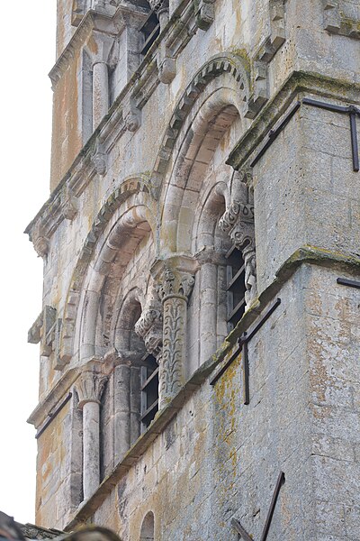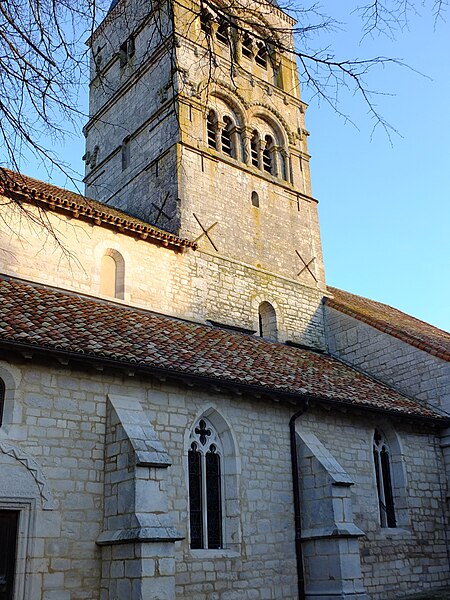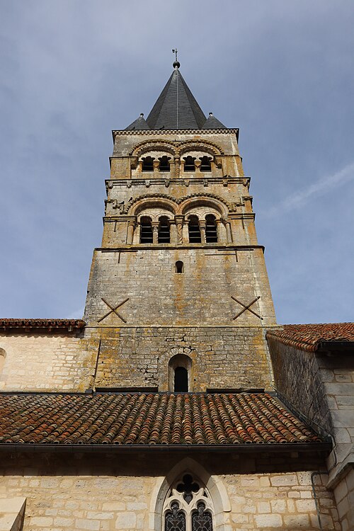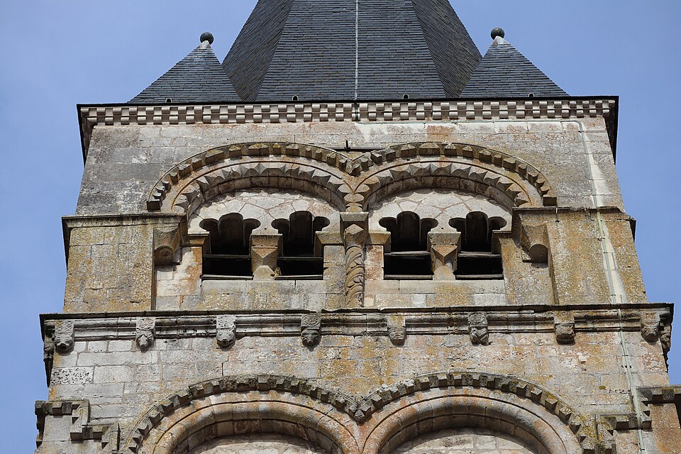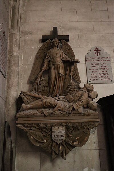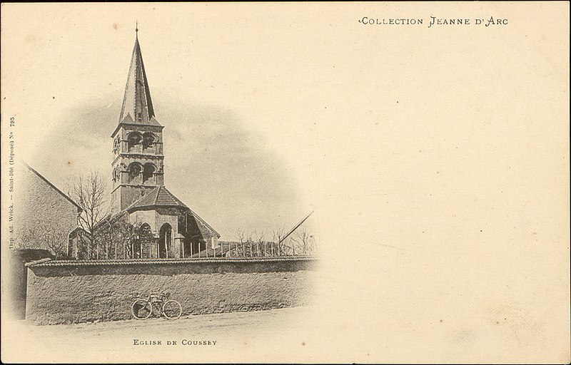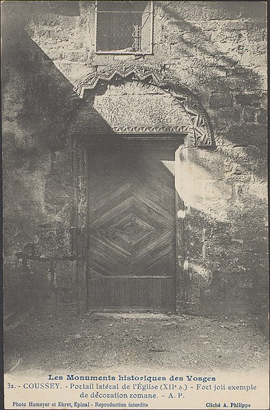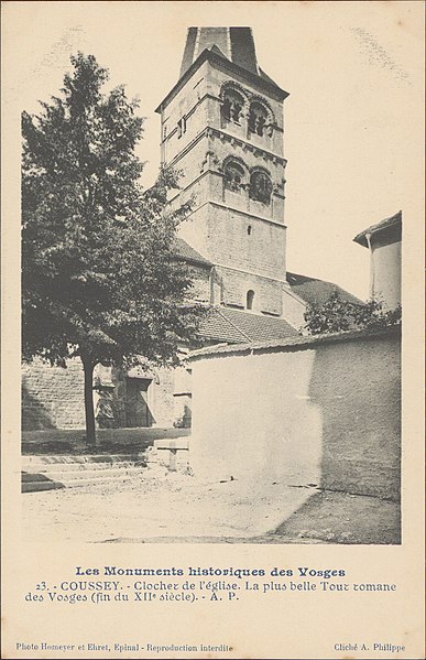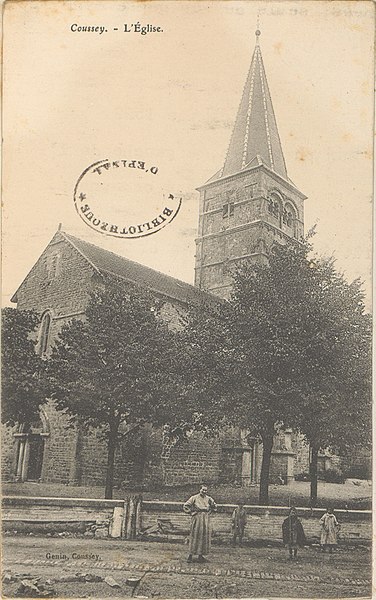 L'église Notre-Dame-de-l'Assomption de Coussey (Vosges) combine des éléments romans et gothiques, avec une nef datée du début ou du deuxième quart du XIIe siècle. Coussey apparaît pour la première fois dans une bulle du pape Pascal II en 1106, parmi les biens de l'abbaye de Saint-Mihiel. La nef, initialement plafonnée et soutenue par des piliers quadrangulaires, comprend trois vaisseaux et présente encore des traces du lambris primitif. En 1475, des travaux importants ont transformé la voûte : la nef et les bas-côtés ont été couverts en croisées d'ogives et de grosses demi-colonnes ont été adossées aux piliers romans pour reprendre les nervures. Le clocher, élevé sur la travée qui sépare la nef du chœur, a été édifié à la fin du XIIe siècle ; il compte quatre niveaux dont les deux derniers s'ouvrent par des baies géminées richement décorées. Le chevet a été reconstruit au XVIe siècle ; la flèche n'est pas datée avec certitude, mais un dessin la représente en 1583. La façade occidentale est un exemple typique de roman sobre, composée d'un mur central et de murs latéraux en retrait, avec un portail roman à trois cintres et un décor en zigzag à l'extrados ; le tympan, aujourd'hui lisse, a peut-être perdu une sculpture au cours des révolutions. Les colonnettes d'origine du portail ont disparu et les colonnettes actuelles ont été ajoutées au début du XXe siècle, tandis que les vantaux en bois et les pentures en fer forgé paraissent anciens. Une porte murée, ornée d'un cintre en zigzag, se situe sur la face nord au niveau de la seconde travée. L'intérieur, largement gothique, comprend un chœur polygonal sans transept attribué au XVe siècle et des baies d'éclairage datées du XVe siècle. L'ornementation du clocher se distingue par des motifs variés — billettes, tores, créneaux, feuillages, têtes d'animaux et figures grotesques — ainsi que par des colonnettes et tympans sculptés aux étages supérieurs. L'église renferme de nombreuses pierres tombales et épitaphes, et son mobilier provient principalement du XVIIIe siècle. Le clocher a fait l'objet de plusieurs restaurations au XIXe siècle. Le transept, le chœur, le clocher et le portail ont été classés au titre des monuments historiques le 3 juin 1908 ; la nef a été classée le 27 novembre 1942.