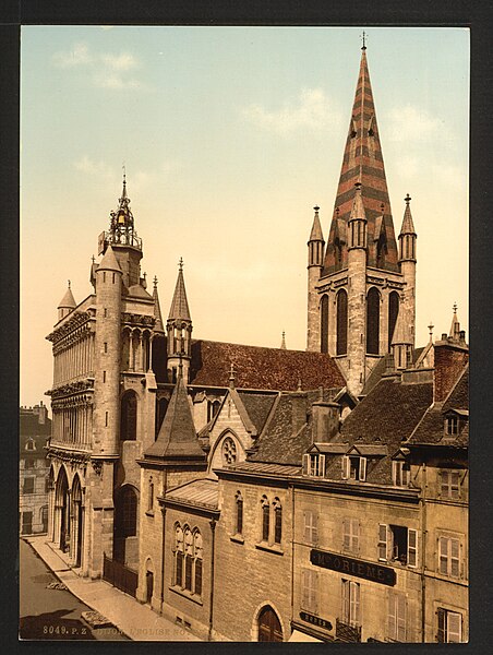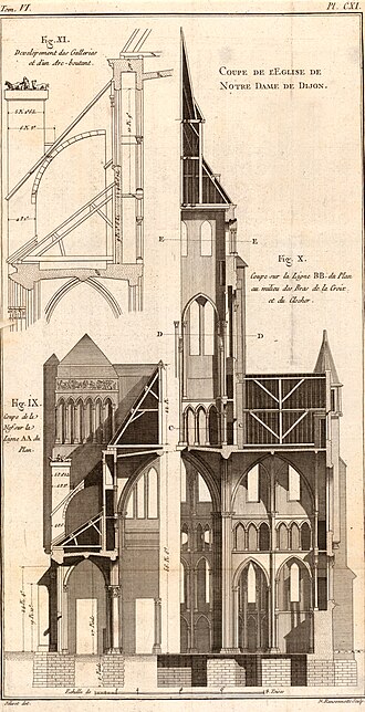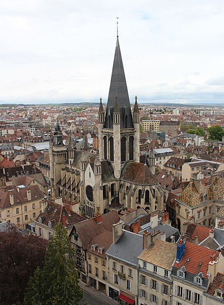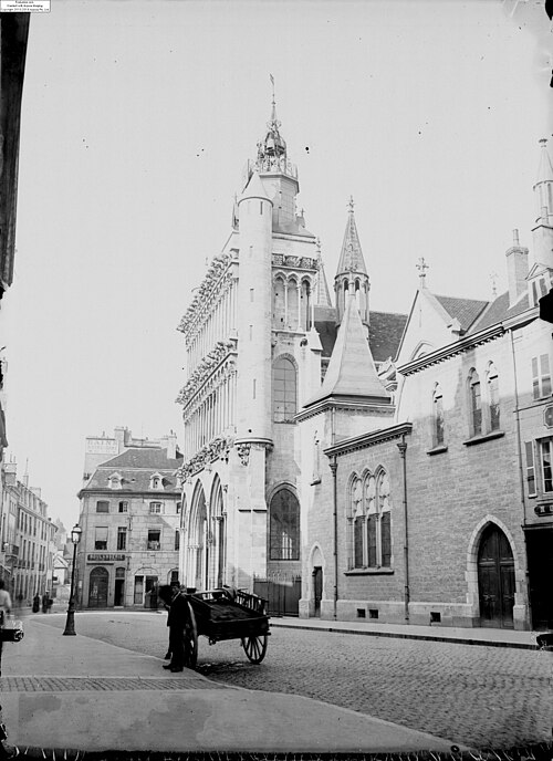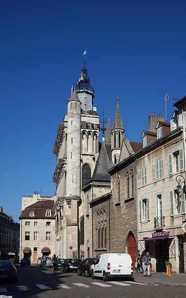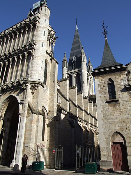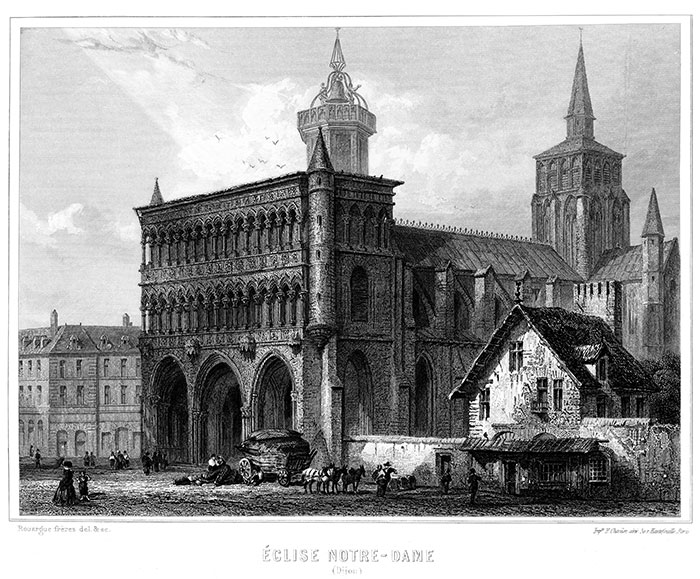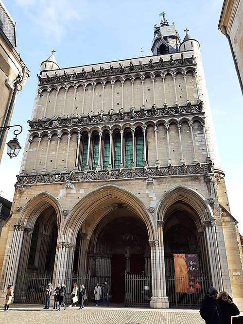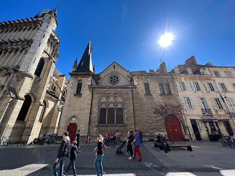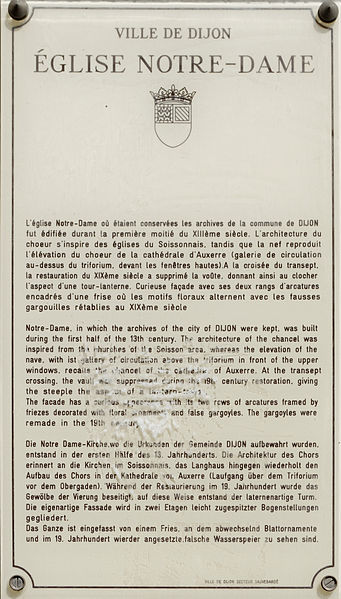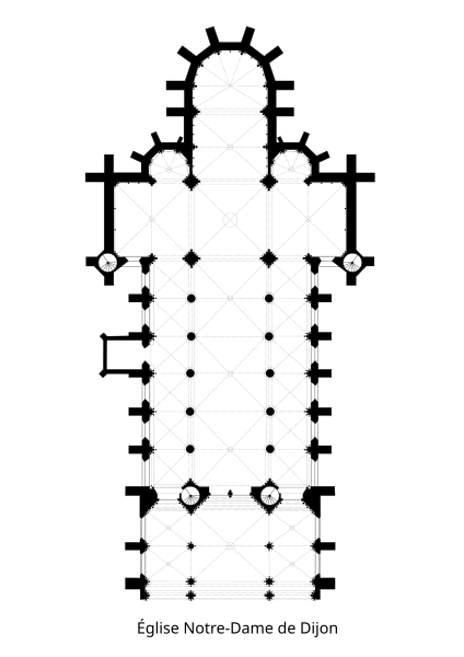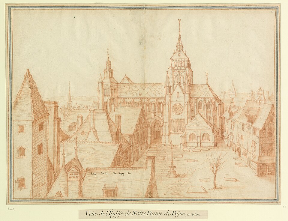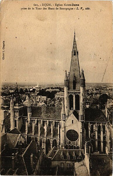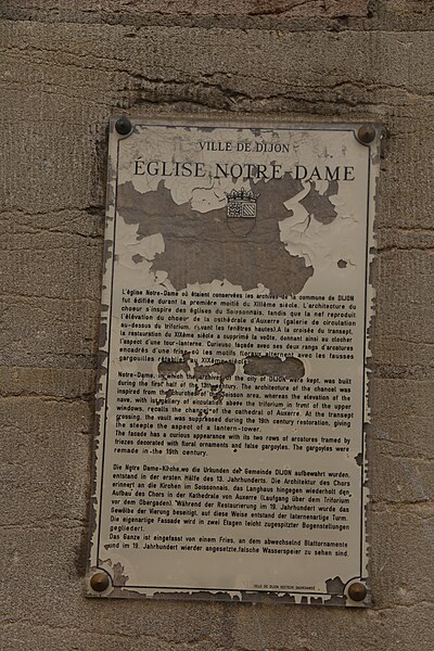 L'église Notre‑Dame de Dijon, chef-d'œuvre de l'architecture gothique du XIIIe siècle, s'élève place Notre‑Dame, face à la rue Musette et près du Palais des ducs et des États de Bourgogne ; elle se trouve au cœur du secteur sauvegardé inscrit au patrimoine mondial de l'UNESCO. Classée au titre des monuments historiques depuis la liste de 1840, l'édifice actuel a été construit aux alentours des années 1220‑1250. À l'origine se dressait sur ce site une chapelle Sainte‑Marie, devenue paroisse intra‑muros en 1137, puis reconstruite en style roman vers 1150 ; elle prit une place importante dans la vie municipale dijonnaise dès l'octroi du statut communal. Les Dijonnais élevèrent à partir des années 1220 l'église gothique que l'on connaît, l'architecte restant inconnu ; pour gagner de la surface au sol dans un quartier dense, tout le poids de la charpente et de la toiture repose sur les piliers et non sur des arcs-boutants. Admirée dès le XVIIIe siècle, l'édifice a fait l'objet d'une restauration menée de 1865 à 1884 par Émile Boeswillwald, Eugène Millet et Charles Laisné, qui supprimèrent les constructions adventices, rétablirent la tour-lanterne et refirent les sculptures abîmées ; la flèche fut ensuite restaurée en 1969‑1970. La chapelle de l'Assomption, construite de 1877 à 1882 par Édouard Mairet en style néo‑gothique pour servir d'annexe et accueillir le culte pendant les travaux, conserve l'ancien autel majeur de 1684 et le tableau de l'Assomption de 1694 par Jean Dubois, venus du chœur après la « débaroquisation » de l'église ; quatre baies hautes de cette chapelle abritent des vitraux du XVIe siècle provenant de la Sainte‑Chapelle de Dijon. La sacristie, réalisée en 1845 par Pierre Paul Petit en néo‑gothique à partir d'éléments du XVe siècle, s'appuie contre l'emplacement d'une ancienne sacristie détruite en 1867 ; la chapelle, la sacristie et la galerie qui les relie à l'église sont inscrites au titre des monuments historiques depuis le 5 juillet 2002.