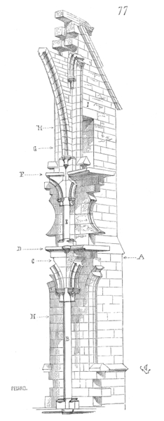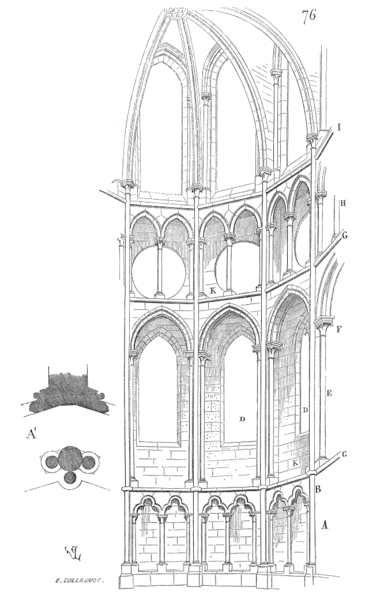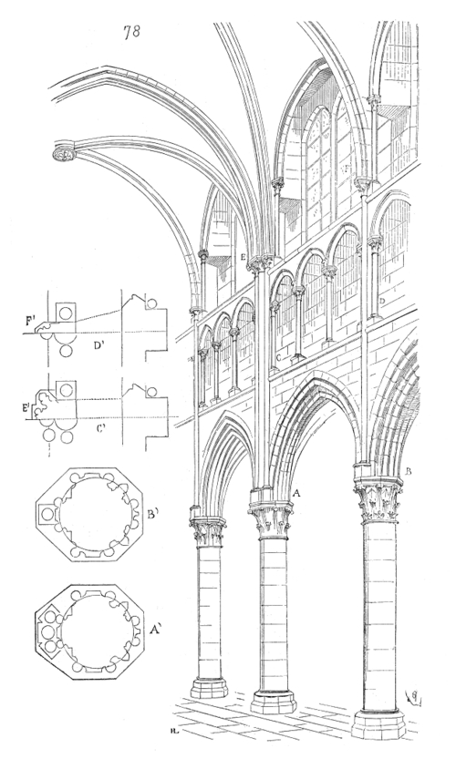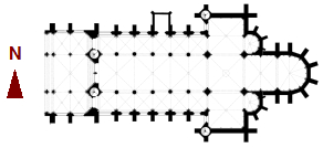 L'édifice mesure au total 65 mètres de longueur ; la façade occidentale fait 19,5 mètres de large et 28,6 mètres de haut, tandis que la tour-lanterne s'élève à 83,6 mètres ; l'intérieur présente une longueur utile de 46,7 mètres, une largeur intérieure de 17,2 mètres, une largeur à la croisée du transept de 27,3 mètres, une hauteur sous voûte de la nef et du chœur de 18,5 mètres et de 8,7 mètres pour les bas-côtés. Le plan est une croix latine orientée : un porche précède la nef, surmonté d'une vaste tribune ; le vaisseau central, flanqué de collatéraux, présente trois niveaux — grandes arcades soutenues par des piles cylindriques, triforium et fenêtres hautes — le triforium formant une galerie de circulation devant les fenêtres hautes. Le transept, marqué, présente des pignons avec lancettes et roses, et la croisée s'ouvre sur une tour-lanterne comportant un triforium et huit grandes fenêtres ; le chœur comprend quatre étages, le triforium ayant été percé au XVIIe siècle de sept grands oculi. L'usage de voûtes sexpartites et l'équilibre entre vides et pleins contribuent à donner une impression monumentale à un espace de dimensions modestes.