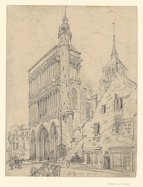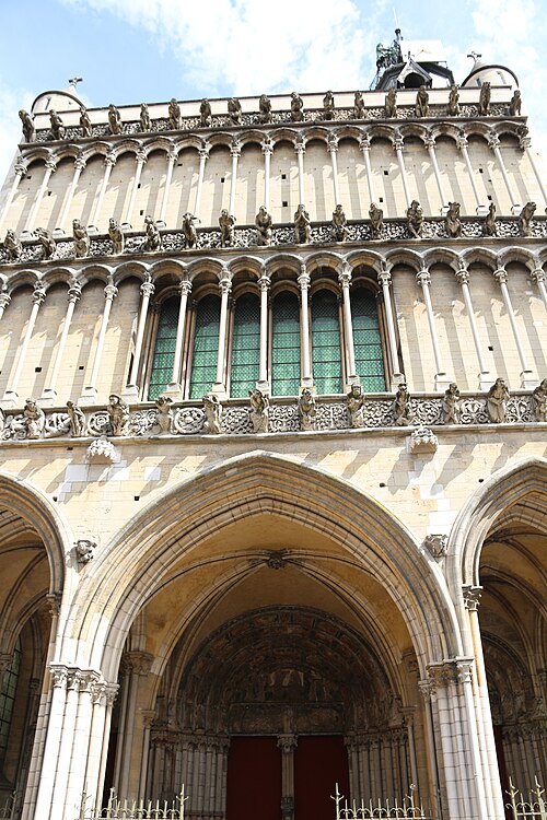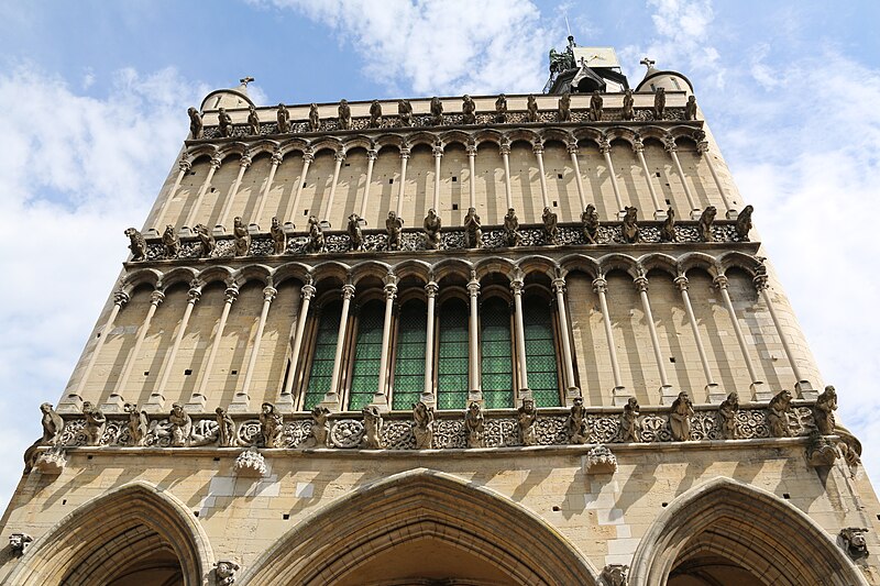 La façade occidentale, d'une planéité singulière et unique en architecture gothique française, forme un écran masquant l'organisation intérieure ; elle s'ouvre par trois grandes arcades formant un porche aux voûtes soutenues par deux rangs de piliers, et se surmonte de deux galeries d'arcatures superposées reposant sur dix‑sept colonnettes chacune, soulignées par des bandeaux ornés de fausses gargouilles et de métopes ; les voussures et sculptures du porche ont été détruites en janvier 1794. Sur la souche de la tour sud de la façade, un campanile supporte le Jacquemart ; les deux tours prévues n'ont été élevées que partiellement.