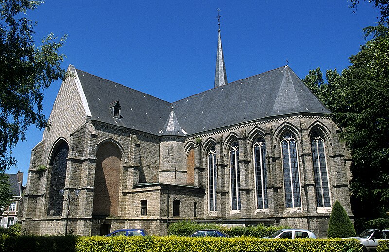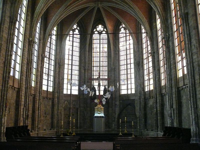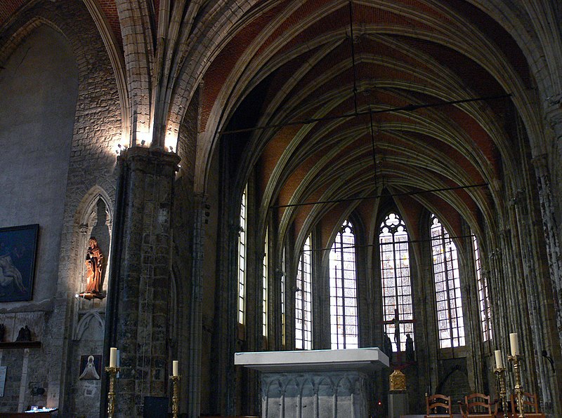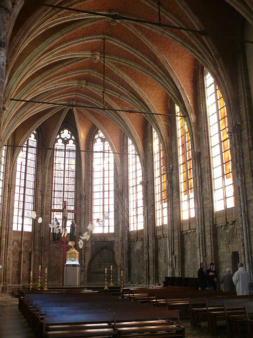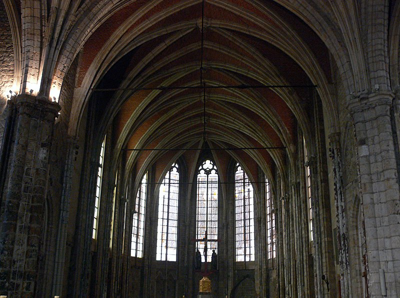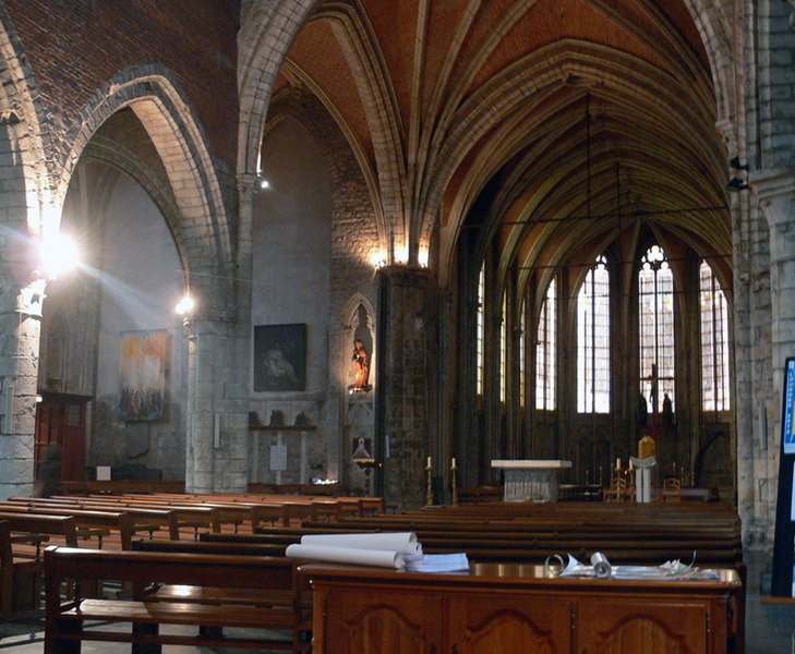 Le chœur n'est pas aligné sur le transept ; ce décalage est une imperfection architecturale volontaire qui évoque la tête penchée du Christ en croix. Des photographies montrent le chœur, la croisée du transept et une statue de la Vierge. Des ressources complémentaires sont disponibles sur Wikimedia Commons et via les portails consacrés au catholicisme, au Nord‑Pas‑de‑Calais, à l'architecture chrétienne et aux monuments historiques français.