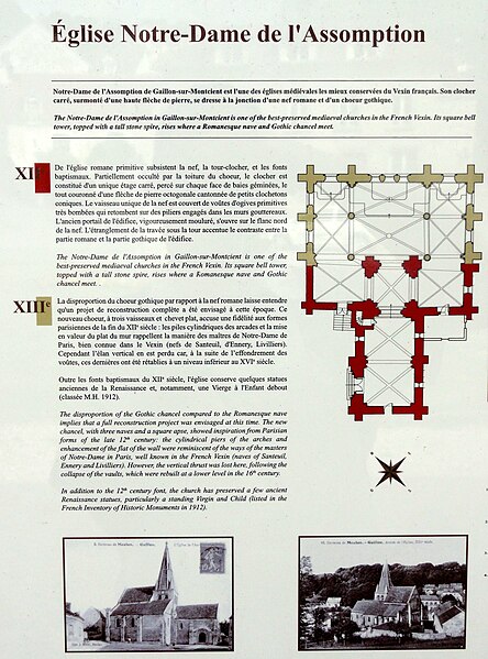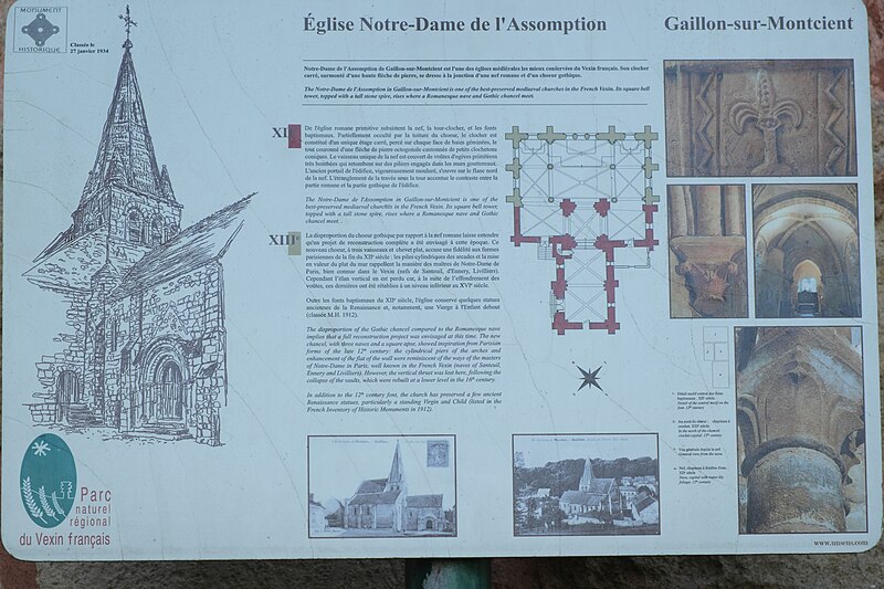 L'église Notre‑Dame‑de‑l'Assomption se situe à Gaillon‑sur‑Montcient (Yvelines) ; elle est de confession catholique paroissiale, dépend aujourd'hui du secteur pastoral de la rive droite de la Seine et a été classée monument historique par arrêté du 27 janvier 1934. La fondation du village et la présence d'une communauté monastique sont attribuées au XIIe siècle ; la construction de l'édifice se déroule en plusieurs campagnes entre le XIIe et le XIIIe siècle, les auteurs évoquant des phases romanes anciennes puis un important réaménagement gothique à l'est. Le plan témoigne de cette évolution : une tour‑clocher ancienne occupe la croisée du transept, à laquelle se raccorde une nef à vaisseau unique de deux travées, et un chevet plat tripartite achève l'ensemble ; le chœur, bordé de deux collatéraux, correspond à la reconstruction gothique qui succède à un chevet antérieur. Des traces de décors peints subsistent dans les combles du chœur et du bas‑côté sud. La silhouette de l'église est compacte du fait du clocher roman en grande partie noyé dans les combles, mais dominée par une flèche de pierre octogonale cantonnée de quatre petits clochetons coniques. La nef, de faible volume et dépourvue de bas‑côtés, est voûtée d'ogives dès la fin de la période romane ; elle sert aujourd'hui de vestibule et de chapelle baptismale et conserve un appareil régulier en pierre de taille ainsi qu'un portail nord à triple archivolte. La base du clocher, voûtée d'ogives et marquée par un arc triomphal en tiers‑point, présente des profils de nervures et des chapiteaux pour la plupart inspirés de l'ordre corinthien ou sculptés de feuilles d'acanthe, tandis que quelques chapiteaux portent des feuilles plates ou des motifs polylobés. Les croisillons du transept, de plan allongé nord‑sud, ont conservé des formerets toriques et des raccords provisoires vers les collatéraux, qui se font par de courtes sections voûtées en berceau ; la lecture des supports révèle plusieurs interventions et reprises entre les XIIe et XIIIe siècles. Le chœur, formé de deux travées, se caractérise par des voûtes flamboyantes très basses remontant au premier XVIe siècle, qui ont remplacé des voûtes hautes antérieures ; il conserve néanmoins un ancien niveau de fenêtres hautes au‑dessus des voûtes actuelles et une composition extérieure riche, notamment la superposition exceptionnelle de deux triplets au chevet. Les grandes arcades et la modénature intérieure reflètent l'évolution des styles ; les ogives du XVIe siècle, les clés de voûte ornées et certaines sculptures évoquent des inspirations Renaissance et flamboyantes, tandis que les collatéraux nord et sud, construits autour de 1210–1230, présentent des proportions soignées, des lancettes intactes et des clés de voûte sculptées antérieures au XVIe siècle. À l'extérieur, l'église est irrégulièrement orientée et son accès principal se fait par la façade nord donnant sur la place de la Mairie ; le chevet et la façade méridionale sont partiellement masqués par l'urbanisme et les propriétés voisines, alors que l'élévation septentrionale est dégagée. Le clocher, dont l'étage de beffroi n'apparaît nettement que du côté ouest, conserve des éléments archaïques de facture romane et une flèche octogonale gothique établie sur trompes à l'intérieur et cantonnée de cônes extérieurs. Le mobilier compte des pièces remarquables inscrites ou classées : les fonts baptismaux en pierre calcaire du XIIe siècle, en forme de navette et décorés de cordons ornés, sont classés depuis novembre 1908 ; la Vierge à l'Enfant polychrome, attribuée à la première moitié du XVIe siècle et tenant une étoile singulière, est classée depuis juillet 1912 ; la cloche en bronze, d'époque moderne, est classée depuis avril 1944. D'autres statues et éléments de retable signalent la diversité du décor liturgique, parmi lesquels une Sainte‑Marie‑Madeleine, un retable dédié à saint Roch avec les statues de saint Roch et sainte Barbe, et une statuette de saint Jean‑Baptiste dans une piscine liturgique gothique. L'intérieur est particulièrement intéressant pour ses voûtes d'ogives romanes dans la nef et la base du clocher, qui montrent deux approches architecturales proches des années 1130–1140, ainsi que pour la conception du chœur gothique dont les grandes arcades débutent sur des piliers libres dans l'attente d'une reconstruction vers l'ouest. Enfin, l'église a servi de décor au tournage de Maigret et l'Affaire Saint‑Fiacre en 1959, où l'on reconnaît notamment le portail principal nord et certains éléments du mobilier.