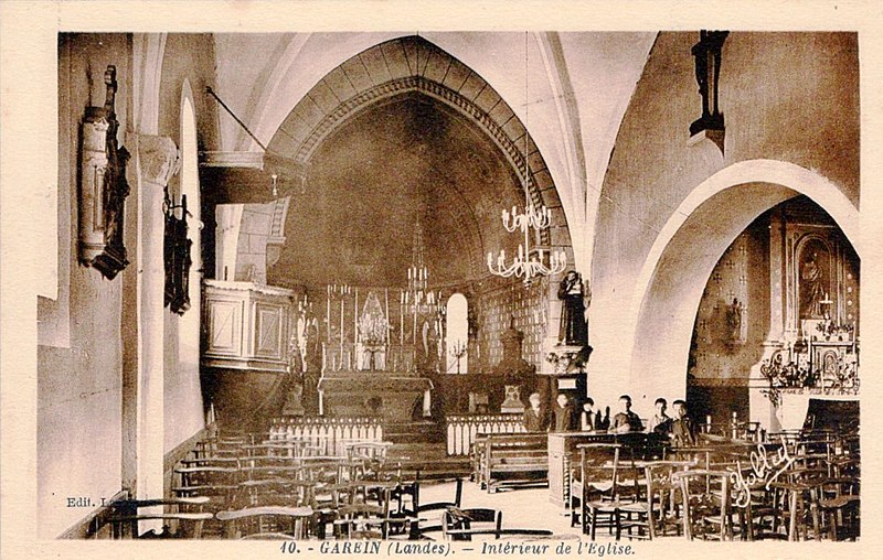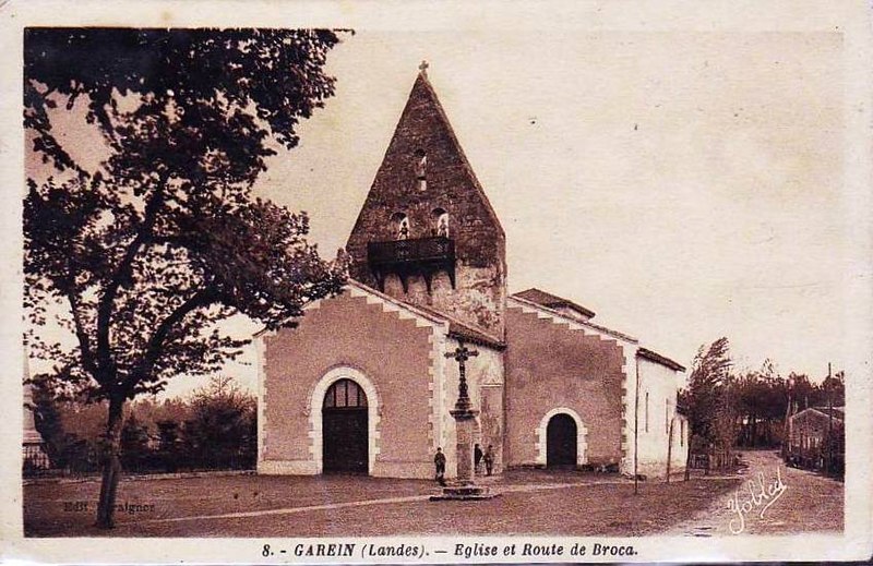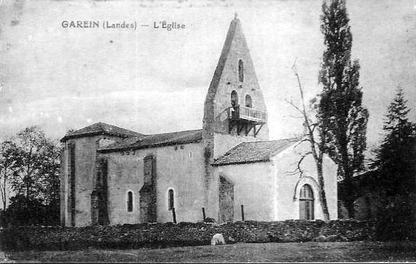 L’église Notre-Dame de Garein, parfois désignée sous le vocable de saint Antoine, se situe dans la commune de Garein, dans les Landes ; elle est inscrite au titre des monuments historiques par arrêté du 30 juillet 1968. Placée sous un triple patronage — la Vierge, saint Antoine et saint Jacques en raison de sa situation sur une voie parallèle de Compostelle — elle reste peu documentée et son histoire est mal connue. La nef, la partie apparemment la plus ancienne, est à deux travées voûtées d’ogives ; les arcs et le doubleau retombent sur des chapiteaux sculptés de motifs végétaux et sur des culots à figures humaines et animales. Un bas-côté a été ajouté au sud à une époque tardive et une petite entrée de chœur sépare celui-ci de la nef ; l’arc de cette entrée et l’arc triomphal en tiers-point reposent sur des consoles dont la partie supérieure se prolonge en corniche autour de l’abside. Le chœur est à trois pans et le chevet semi‑circulaire, plus élevé que la nef, paraît avoir pu servir de réduit défensif. La face nord de la nef conserve des corbeaux qui supportaient l’ancienne toiture, sous lesquels se remarquent deux petites meurtrières. Le clocher est un mur triangulaire à trois baies campanaires, précédé d’un avant‑porche moderne sous lequel s’ouvre un porche à trois archivoltes, dont l’une repose sur des colonnes à chapiteaux sculptés. L’église a reçu divers aménagements défensifs : une chambre forte a été construite au‑dessus du chœur lors de la Guerre de Cent Ans et des éléments de fortification sont perceptibles, sans datation précise. La datation repose principalement sur l’analyse stylistique, rendue difficile par la présence d’enduits sur la quasi‑totalité des élévations. Le décor de la porte occidentale, sans doute contemporain du vaisseau, permet de situer la nef dans les dernières décennies du XIIe siècle, tandis que les murs et la voûte d’arêtes du chœur polygonal et le clocher‑mur occidental relèvent probablement du début de l’époque gothique, au cours du XIIIe siècle. Le chœur a reçu des peintures au tournant des XIIIe et XIVe siècles. Le voûtement d’ogives de la nef paraît avoir été réalisé après le retour de la paix, peut‑être même après la fin des Guerres de Religion, autour de 1600. Un collatéral sud et sans doute la sacristie ont été ajoutés vers la transition entre les XVIIe et XVIIIe siècles. Le porche, incendié lors des Guerres de Religion, a été remanié ou reconstruit en 1889. Une importante restauration a été menée en 2008‑2009. Enfin, on relève qu’une seule visite épiscopale a été répertoriée au XVIIIe siècle et que, jusqu’au XIXe siècle, l’église formait avec seulement deux maisons le centre du village.