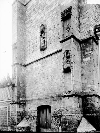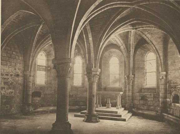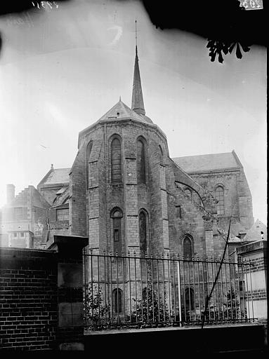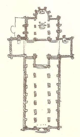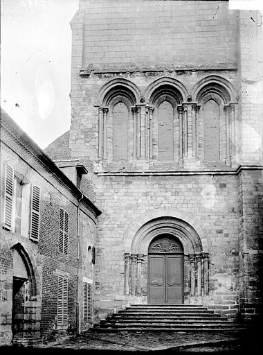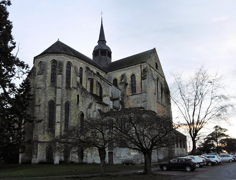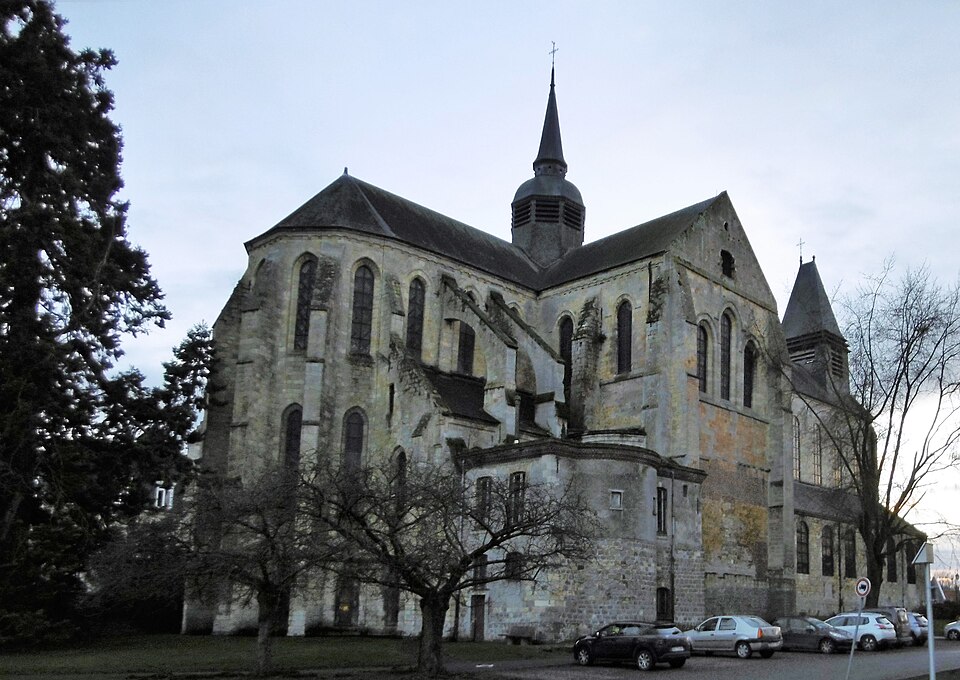 L'église présente un plan en croix latine avec nef centrale, deux bas‑côtés, transept et chœur surélevé, conforme à un ordonnancement bénédictin. Les parties romanes visibles comprennent les assises basses, la façade occidentale et un porche roman sobre surmonté de trois baies hautes. Le chœur et le transept, de construction gothique (1180‑1220), sont couverts de voûtes barlongues et reposent sur des piliers à colonnettes engagées couronnés de chapiteaux à crochets ornés de palmettes stylisées. Le chevet, élancé, s'élève sur trois niveaux correspondant à la crypte et à l'église et est percé de fenêtres en tiers‑point soutenues par des contreforts.
