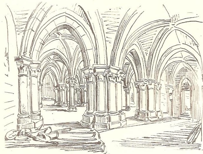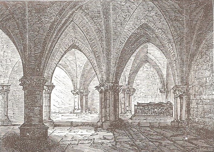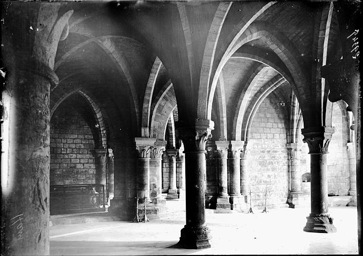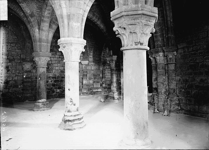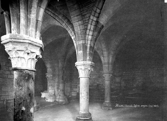 La crypte, la partie la plus remarquable de l'édifice, date de la fin du XIIe‑début du XIIIe siècle ; située sous le chœur, elle en reprend le plan et son vaisseau central est composé de deux nefs jumelles. Un épi de trois colonnes monolithes forme une voûte triangulaire à nervures reposant sur des chapiteaux à crochets ou à feuillage, et la colonne centrale devant l'autel supporte un faisceau de neuf nervures. Dans les nefs latérales ont été déposées les pierres tombales d'Odon IV, seigneur de Ham, et d'Isabelle de Béthencourt, classées monuments historiques en 1888 : l'effigie d'Odon IV en demi‑relief le montre en cotte de mailles, la main droite sur la poignée d'épée, la gauche sur un bouclier aux trois croissants, un chien à ses pieds, accompagnée d'une inscription latine ; Isabelle est représentée en longue robe ceinturée, les mains jointes, avec, de part et d'autre, deux anges soutenant un agneau nimbé tenant un étendard, et sa dalle porte également une inscription latine mentionnant son identité.