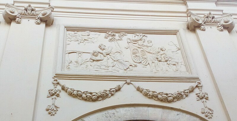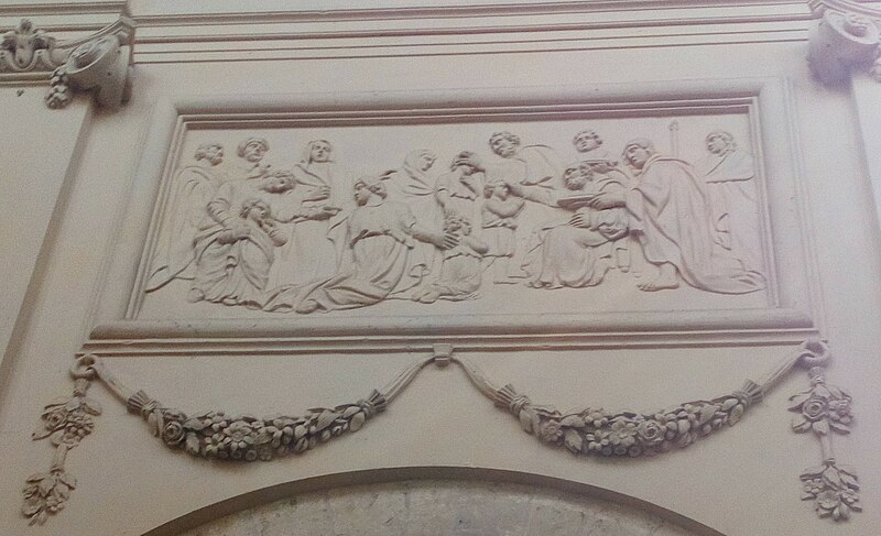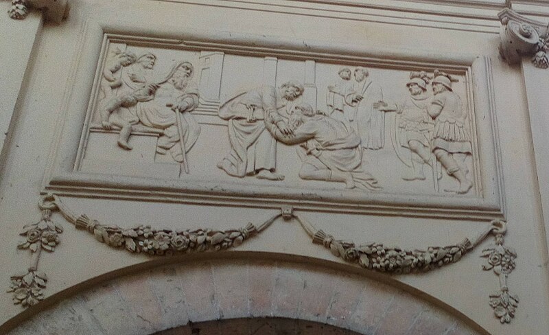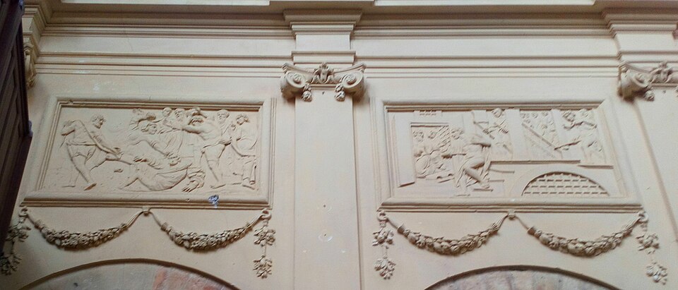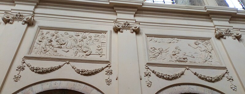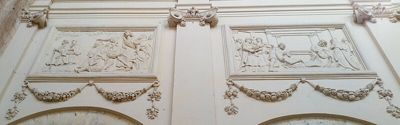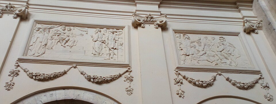 L'intérieur est décoré de trente‑deux bas‑reliefs en stuc illustrant des scènes des Évangiles et des Actes des Apôtres, répartis sur le pourtour du chœur, dans les bras du transept, dans les chapelles et sous les fenêtres de la nef au‑dessus des grandes arcades. Le pourtour du chœur présente, au sud, l'Annonciation et la Visitation, et au nord le Baptême de Jésus et la Tentation ; à l'intérieur du chœur figurent la Nativité, la Circoncision, l'Adoration des Mages et la Cène au sud, et au nord la Présentation au Temple, la Fuite en Égypte, Jésus enfant disputant avec les docteurs et le Lavement des pieds. Les bras du transept comportent, dans le bras sud, les Noces de Cana et l'entretien avec la Samaritaine, et dans le bras nord la Femme adultère et la Dation des clefs ; la chapelle de la Vierge montre Jésus au Jardin des Oliviers et la chapelle Saint‑Vaneng la Résurrection. Sous les fenêtres de la nef figurent, côté sud, des scènes liées aux missions apostoliques et à des conversions (sépulture chrétienne, sacrement de confirmation, baptême de l'eunuque de la reine de Candace, conversion de Corneille, arrivée de Paul et Barnabé à Lystre) ; côté nord se lisent des épisodes liés au martyr de saint Étienne, à la prédication et aux voyages de saint Paul, à sa rencontre avec Agrippa et à son naufrage à Malte. Les bas‑côtés présentent la Pentecôte au sud et l'Extrême‑onction au nord, et l'abside est ornée de cinq médaillons sculptés représentant au centre Jésus entouré des évangélistes.