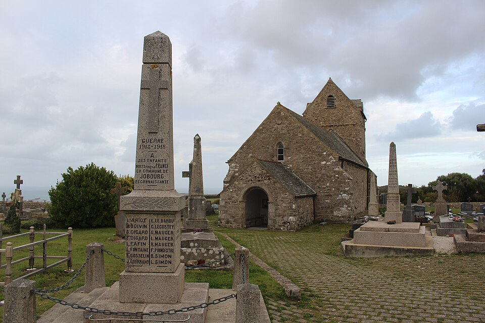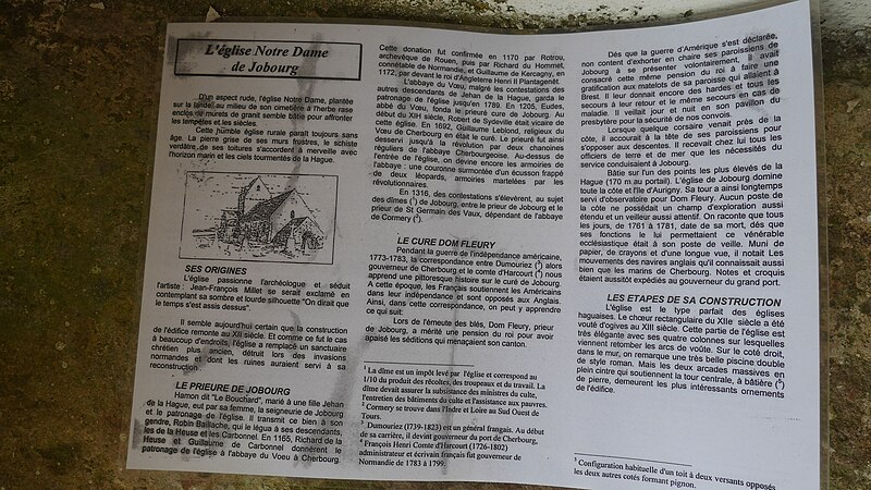 L'église Notre-Dame de Jobourg est un édifice catholique de la fin du XIIe siècle, situé dans le bourg de Jobourg, commune déléguée de La Hague, dans le département de la Manche (Normandie). De style roman, elle présente un chevet plat, une nef lambrissée et un chœur voûté d'ogives ; le clocher, placé à la croisée, s'élève au-dessus d'une travée carrée. La tour-clocher, datée du XVIe siècle et coiffée en bâtière, appartient à l'école de Lessay. Une chapelle édifiée par la famille Lucas vers 1636 comporte, sur sa clé de voûte en pierre grise sculptée, le blason des Lucas de La Haye (de gueules à trois chevrons d'argent). Selon une légende locale, l'église aurait été bâtie sur l'emplacement d'un temple de Jupiter. En 1165, Richard de La Haye et Guillaume de Carbonnel la donnèrent à l'abbaye Notre-Dame du Vœu de Cherbourg ; Jean Lucas, sieur de La Haye, y fit un don en 1637. Jean-François Millet a dit à son propos : « On dirait que le temps s'est assis dessus. » L'édifice est rattaché à la paroisse Bienheureux Thomas Hélye de la Hague, dans le doyenné de Cherbourg-Hague. Protégée au titre des monuments historiques, l'église a fait l'objet d'un arrêté de classement le 26 juin 1972. Parmi le mobilier, on relève un calice et sa patène classés au titre des objets aux monuments historiques ; sont également conservés un bénitier et un cadran solaire daté du XVIIIe siècle. Des ressources en ligne (Clochers de France, Observatoire du patrimoine religieux, base Mérimée, ainsi que divers portails consacrés aux monuments historiques, au département de la Manche, à l'architecture chrétienne et au catholicisme) proposent des informations complémentaires.