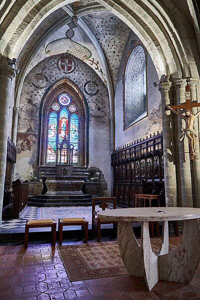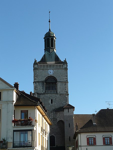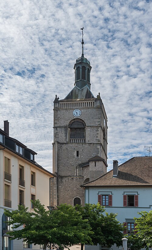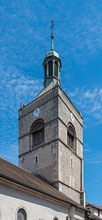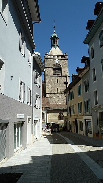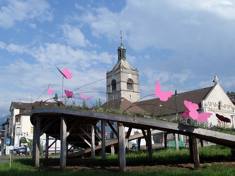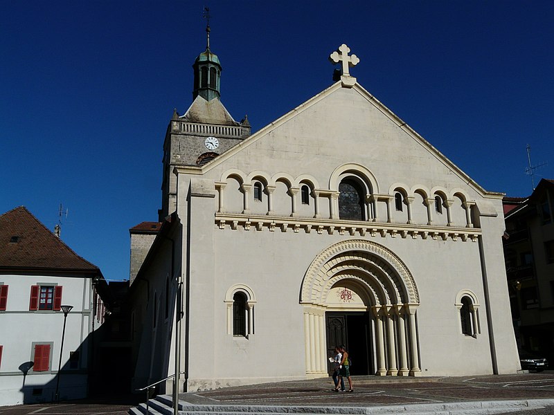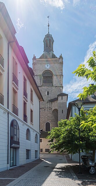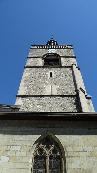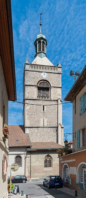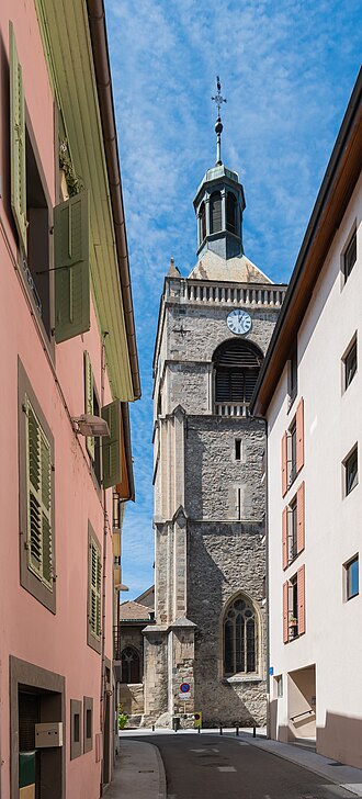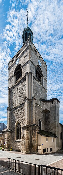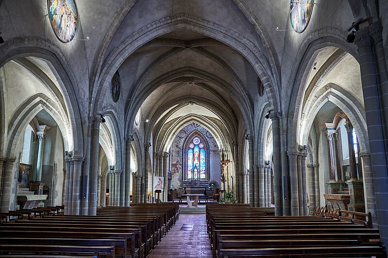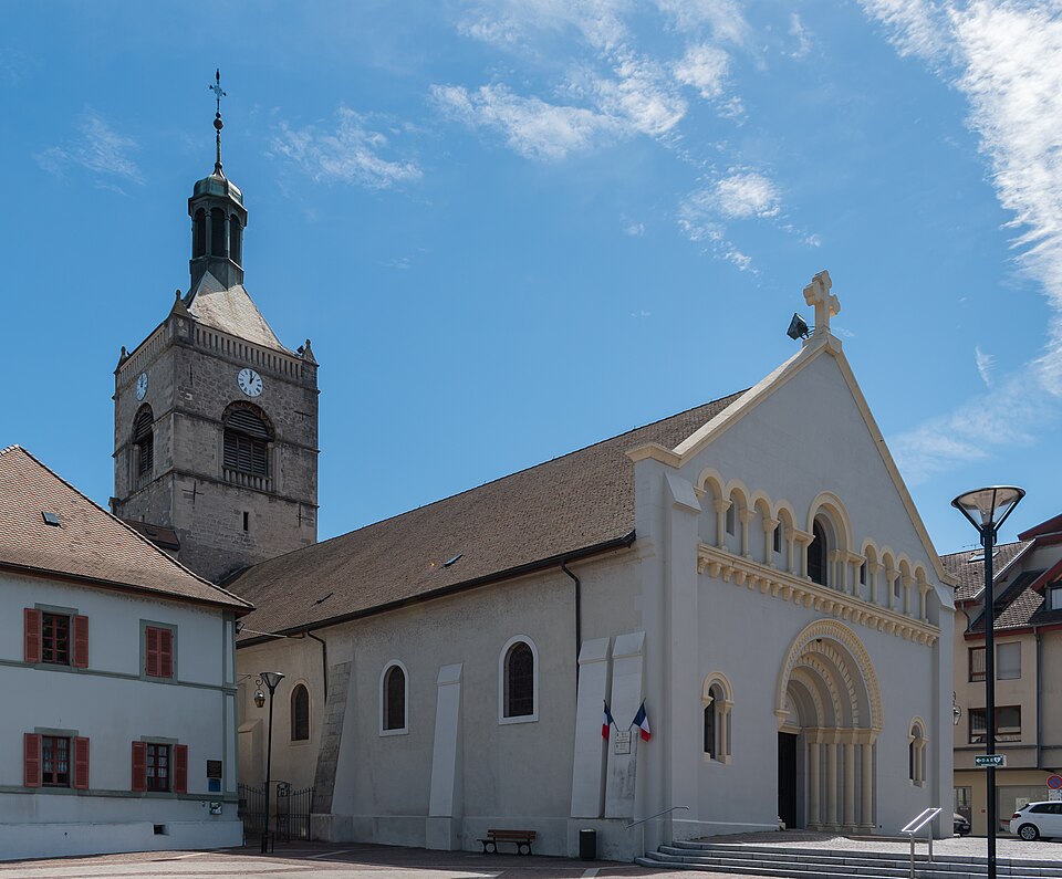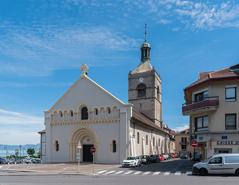 L'église d'Évian-les-Bains se situe dans la commune du même nom, en Haute-Savoie. Sa construction est traditionnellement datée entre 1260 et 1265, mais la présence du château de Pierre de Savoie et le choix d'Évian comme centre administratif suggèrent une origine peut‑être plus ancienne au cours du XIIIe siècle. Une bulle papale de 1250 mentionne un édifice sous le vocable "Bienheureuse Marie dans son Assomption" (Girod), et la présence de Jean, chapelain d'Éviant, lors d'une donation à l'abbé d'Aulps en 1218 permet de repousser encore la datation vers le premier quart du siècle. L'édifice est partiellement inscrit au titre des monuments historiques par arrêté du 1er juillet 1974. De plan rectangulaire, il présente une nef centrale flanquée de deux bas‑côtés, un transept non saillant et un chœur à chevet plat rectangulaire surmonté d'un clocher. Parmi ses œuvres figurent un tableau de Notre‑Dame de Grâce du XVIe siècle et un chemin de croix, placé au sommet de l'allée principale, dessiné par le peintre contemporain local Pierre Christin. Outre l'inscription au titre des monuments historiques, plusieurs objets sont classés : des stalles et un bas‑relief de la Vierge à l'Enfant du XVe siècle, ainsi que des sculptures identifiées comme la Vierge‑du‑Rosaire et sainte Catherine. Pour approfondir, on peut se référer notamment à Raymond Oursel (Les chemins du sacré : L'art sacré en Savoie) et aux travaux de Louis Girod.
