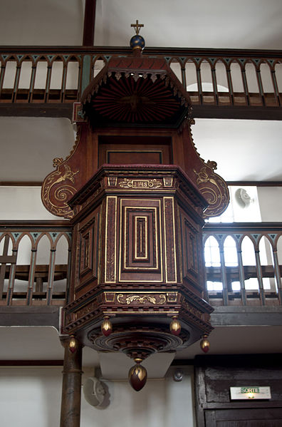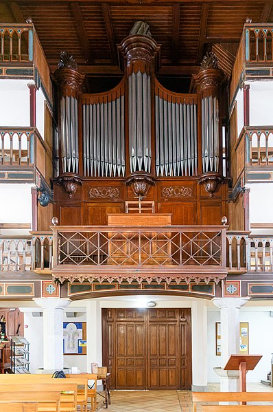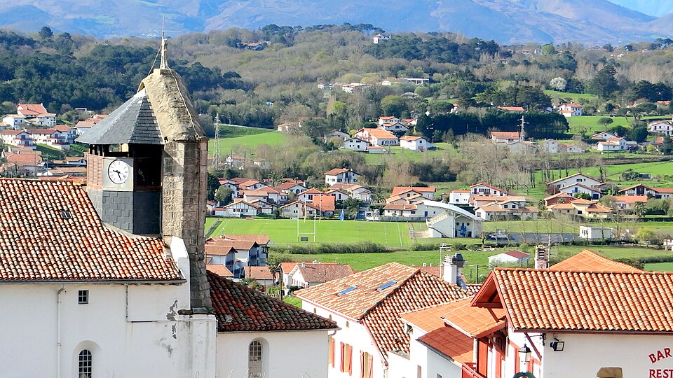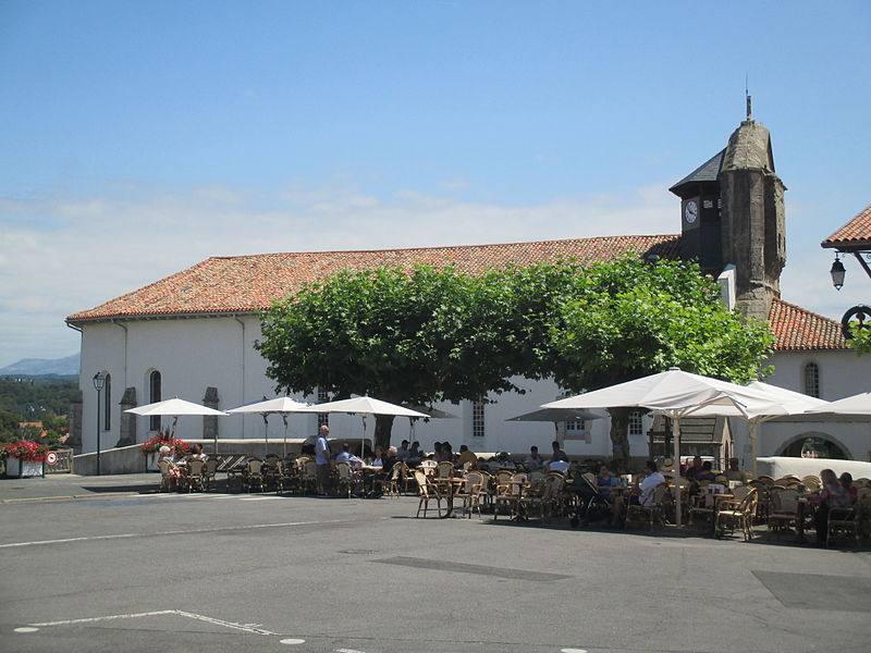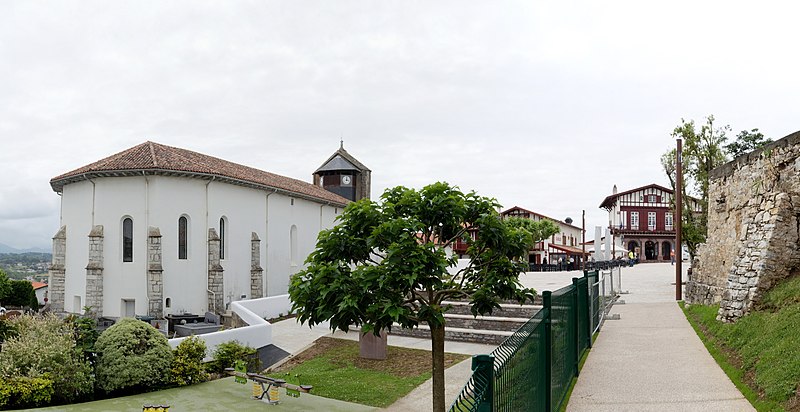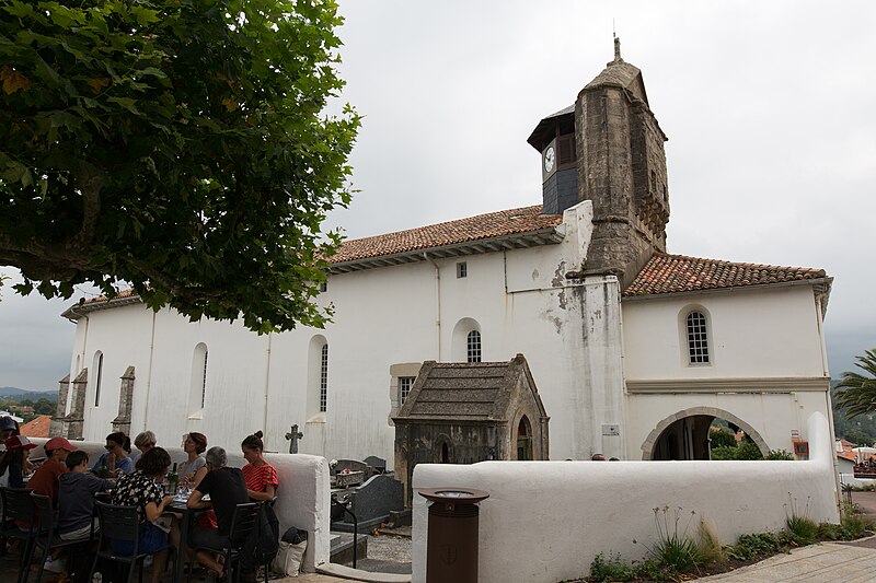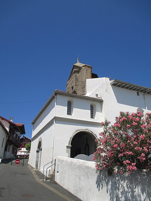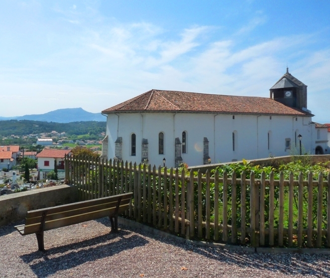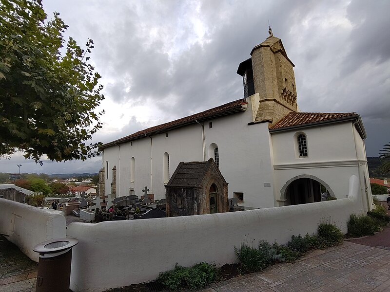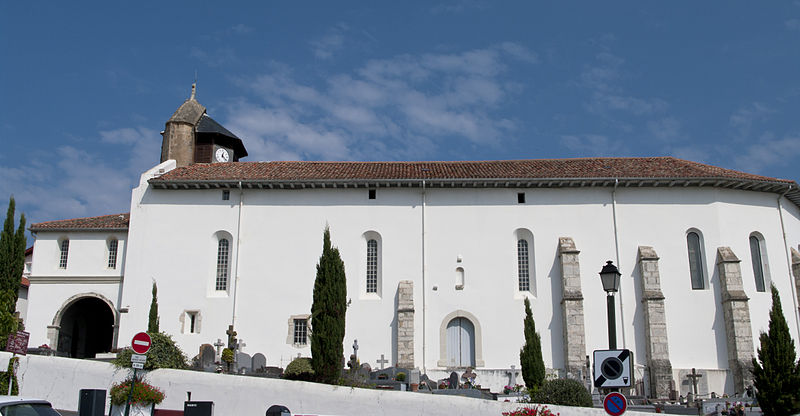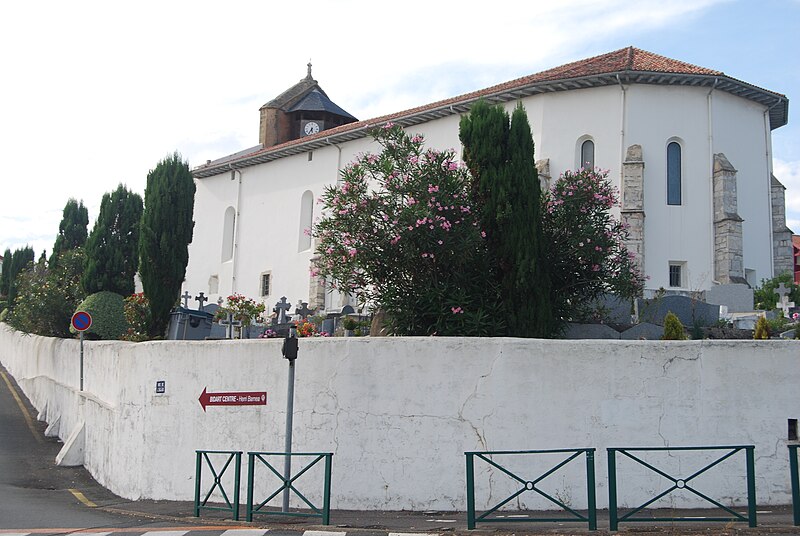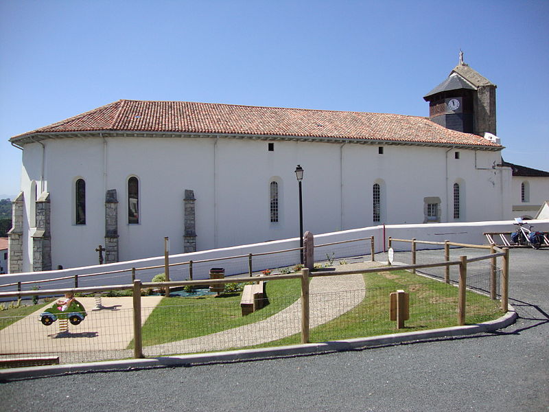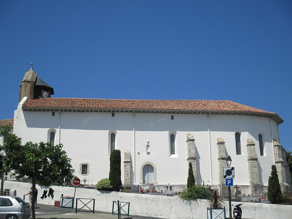 L'église Notre‑Dame‑de‑l'Assomption, située à Bidart (Pyrénées‑Atlantiques), présente un plan à nef unique prolongée à l'est par une abside pentagonale, sans transept ni chapelles latérales. La façade ouest est animée par un clocher‑mur, contre lequel s'adosse un porche à étage daté du XVIIe siècle. L'édifice actuel a été construit ou reconstruit au XVIe siècle dans un souci défensif, avec murs épais et bretèche. Des documents et un linteau de fenêtre daté de 1610 portant les noms de Bertran de Lafargue et Simon de Larregui attestent l'ancienneté et l'évolution du bâtiment ; une donation datée de 1578 est également conservée. D'après des études, une église primitive rectangulaire fut progressivement agrandie : le mur‑clocher fut bâti contre ou en remplacement du pignon ouest, le mur sud abattu pour permettre un élargissement, et un porche élevé pour masquer la dissymétrie. L'abside paraît avoir été ajoutée ultérieurement et les principales transformations se situent aux XVIe et XVIIe siècles, le dernier agrandissement étant attesté en 1610. Au XVIIe siècle, une tribune et des galeries latérales furent implantées pour répondre à l'accroissement de la population ; la tribune du fond fut abattue en 1883 pour faire place à l'orgue. L'église fut pillée et réquisitionnée comme magasin de subsistances pendant la Révolution. Un incendie au début du XXe siècle détruisit les galeries et les plafonds ; des travaux de restauration restituèrent un plafond remarquable en charpente et menuiserie. Huit colonnes en bois soutiennent les galeries encore en place.