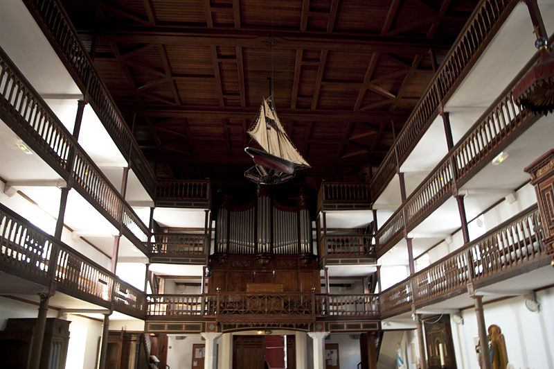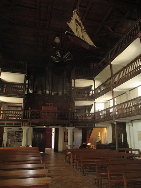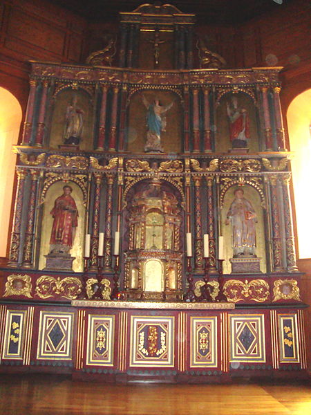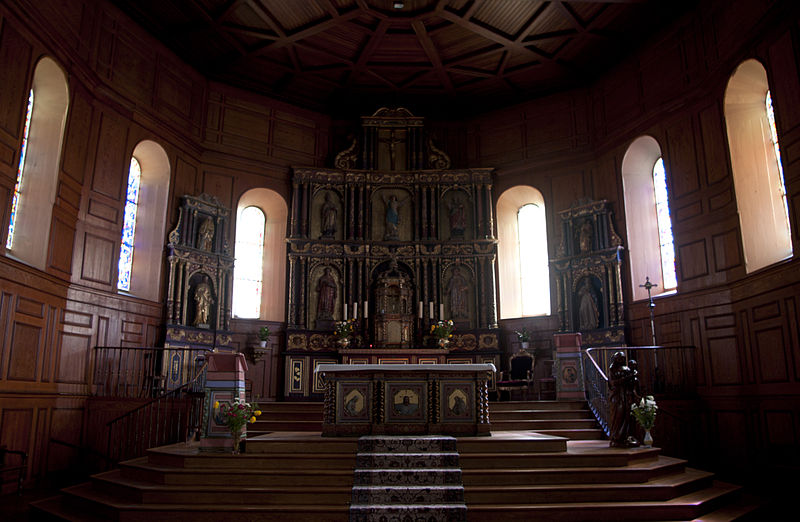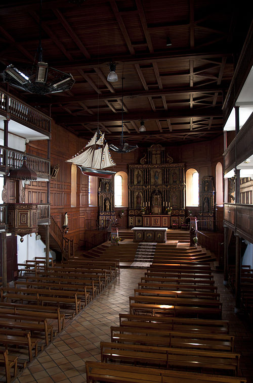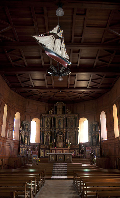 L'autel, surélevé et en bois massif, date du XVIIIe siècle ; le retable central, installé entre 1747 et 1750, porte la croix du Christ au sommet. Une statue en fonte de Notre‑Dame‑de‑l'Assomption, qui a remplacé la statue d'origine, occupe la partie centrale du retable tandis que l'ancienne statue figure au bas du retable secondaire de droite ; la statue en fonte est entourée à gauche par saint Augustin et à droite par saint Irénée. Sous cet ensemble se trouve un tabernacle monumental encadré par les martyrs Étienne et Vincent. En face de la chaire, la nef conserve un Christ en croix du XVIe siècle, et un ex‑voto suspendu représente une goélette morutière de 1900. L'église a fait l'objet de restaurations aux XIXe et début du XXe siècles et est inscrite au titre des monuments historiques depuis le 3 août 2001.