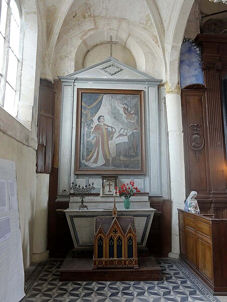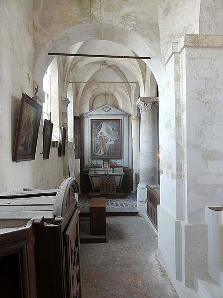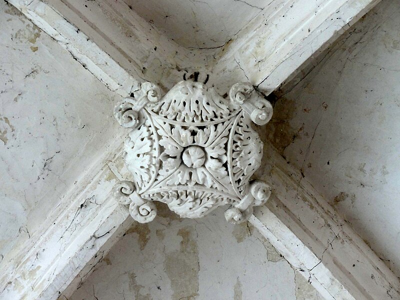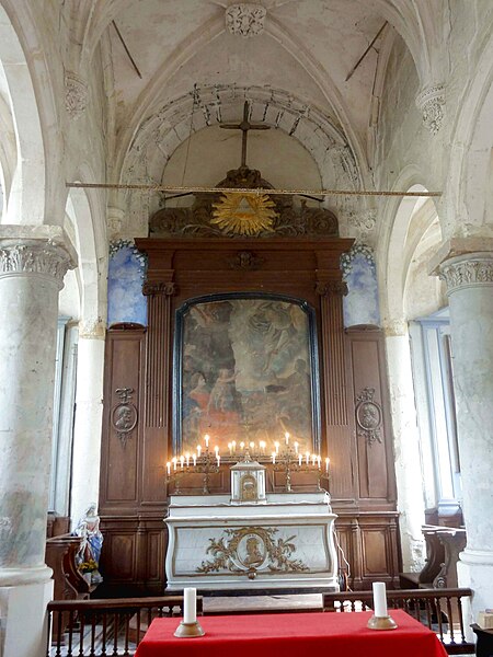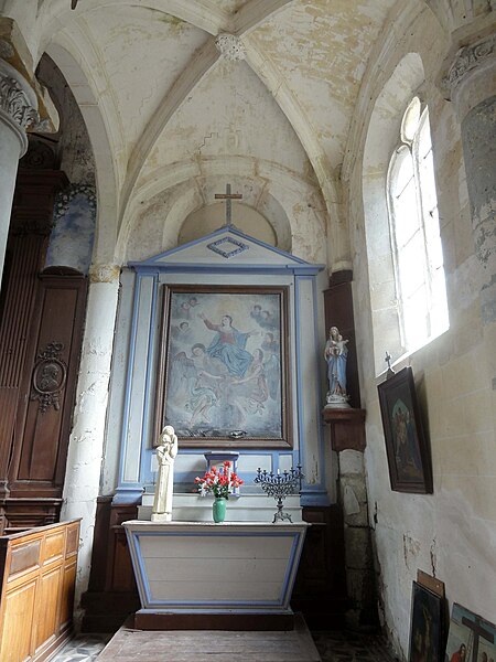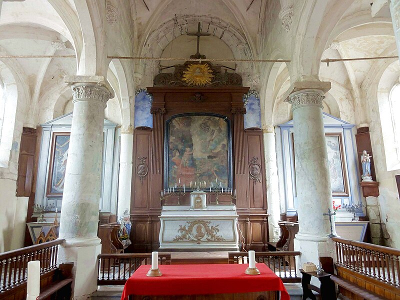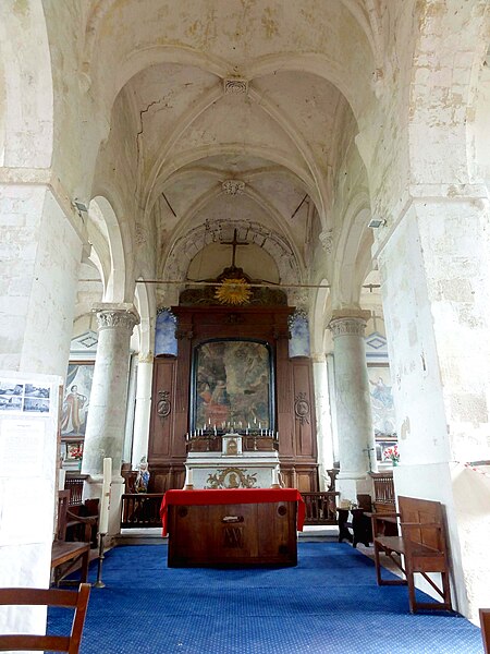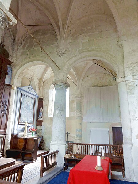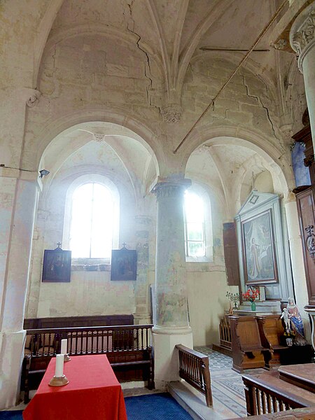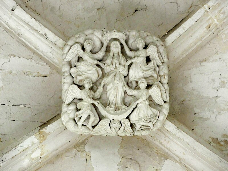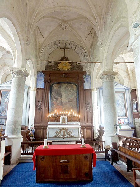 Le chœur se distingue par des proportions soignées et une structure relativement légère : grandes arcades en cintre surbaissé, vaisseau central largement ouvert sur les collatéraux et voûtes en plein cintre dont les clés sont richement sculptées ; l'une représente un cartouche encadré d'une guirlande et une rosace, une autre le Couronnement de la Vierge par des anges, et les clés des chapelles latérales montrent des variations de motifs végétaux et figurés qui soulignent une originalité stylistique. Les ogives et doubleaux présentent des profils mêlant des traits flamboyants et des signes de Renaissance, et certaines retombées s'appuient sur des culs-de-lampe ornés de têtes de chérubin, d'oves ou de rinceaux ; les tailloirs sont pour la plupart de simples dalles non moulurées. Quelques consolidations modernes, comme une barre de fer sur une ogive, sont visibles.