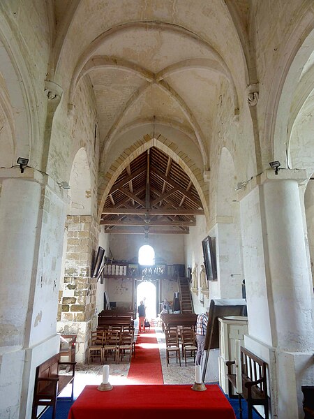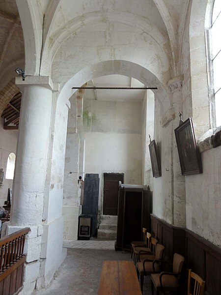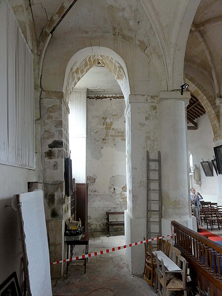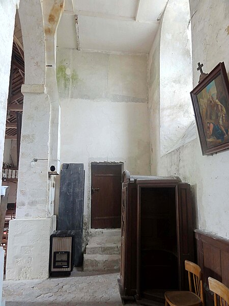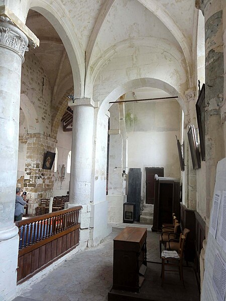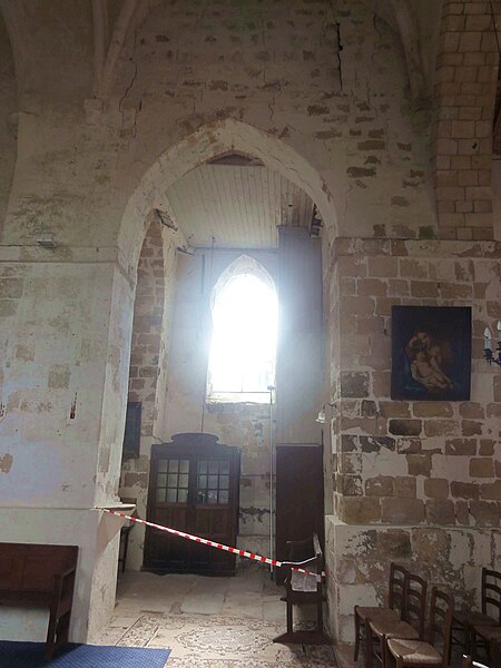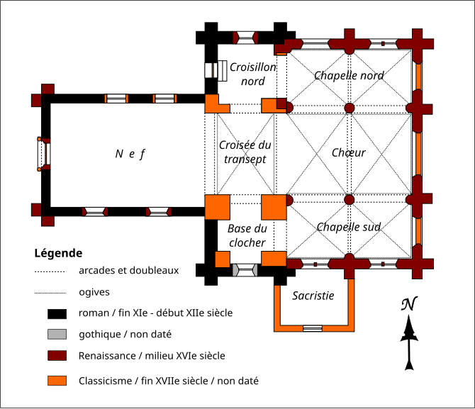 La croisée du transept repose sur quatre piles carrées et se présente comme une sorte de base de clocher, même si la structure n'en a pas toujours été une ; les arcades en tiers-point entre la croisée et les croisillons témoignent de reprises et empêchent une datation précise des aménagements. La voûte d'ogives du carré du transept présente des ogives au profil chanfreiné rustique retombant sur des culs-de-lampe simples, sans éléments formels permettant de fixer une date précise entre le XIIIe et la première moitié du XVIe siècle. Les croisillons sont sobres et dépourvus d'ornement religieux manifeste.