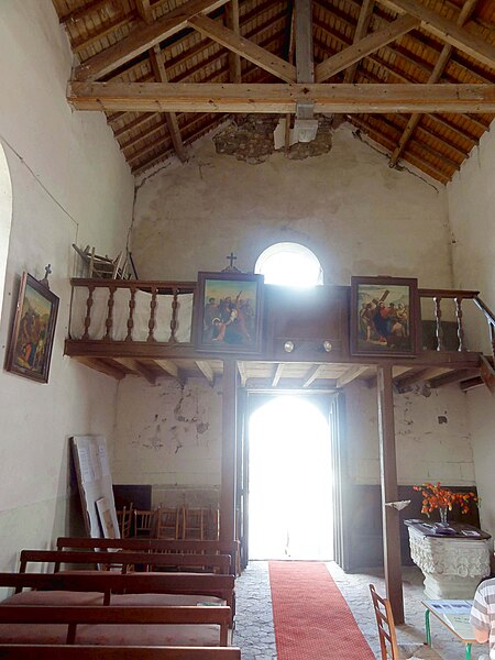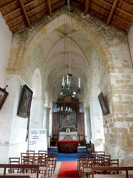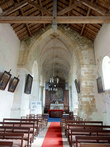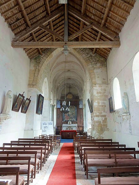 L'église suit un plan orienté et symétrique : une nef unique non voûtée, un transept dont le croisillon sud sert d'assise au clocher, et un chœur de deux travées à chevet plat flanqué de deux collatéraux de même longueur ; une petite sacristie jouxte le collatéral sud. Les voûtes d'ogives couvrent le carré du transept, le chœur et ses collatéraux, tandis que les croisillons sont plafonnés. La nef, typique de la nef-grange rurale, est une salle rectangulaire à charpente apparente et sans décor architectural ; le sol associe dalles anciennes réalisées partiellement à partir de pierres tombales retournées et tomettes. Les fenêtres latérales, en nombre limité, sont de dimensions et d'ébrasements variables, certains ouvrant possiblement au XVIe siècle et d'autres remaniés autour de 1700.