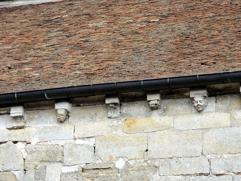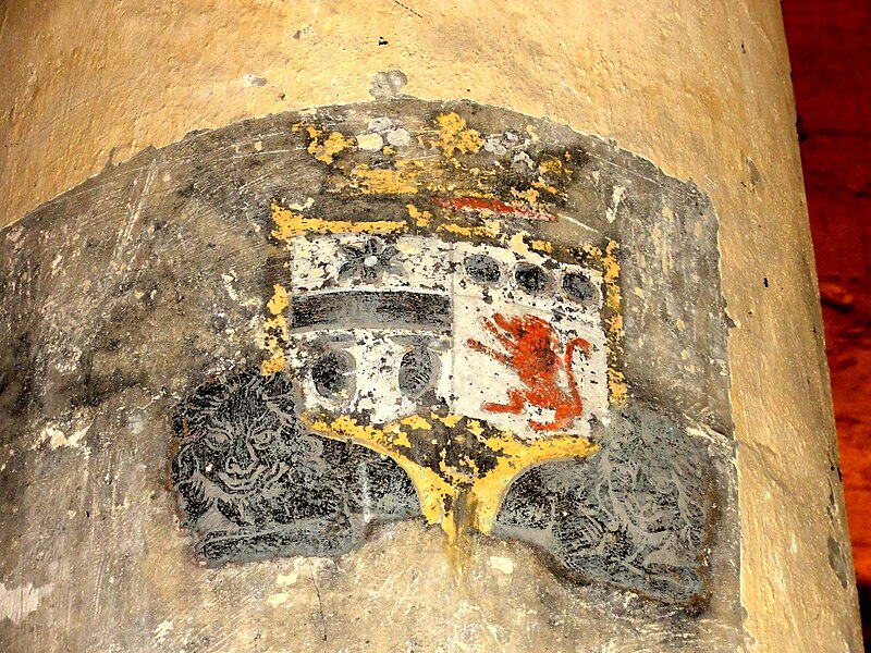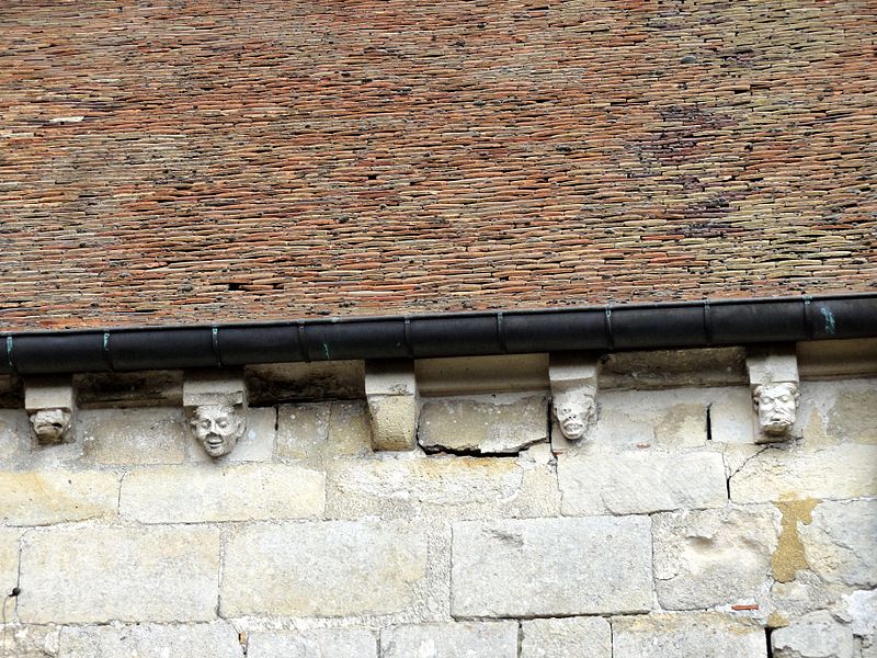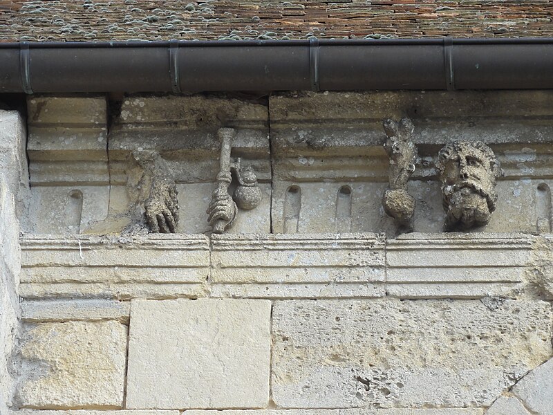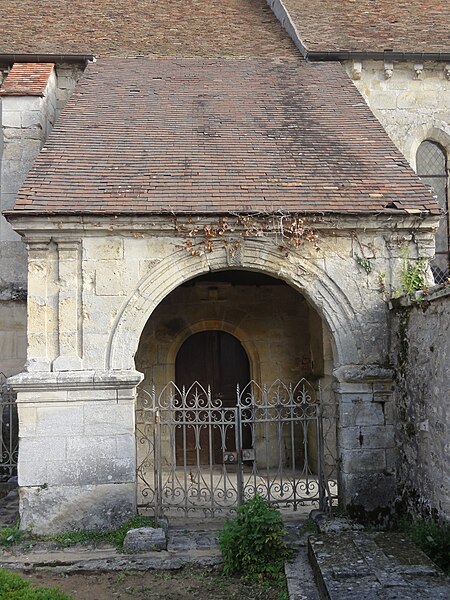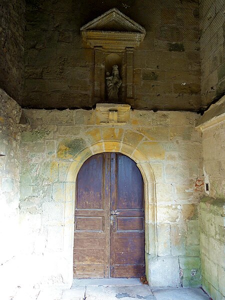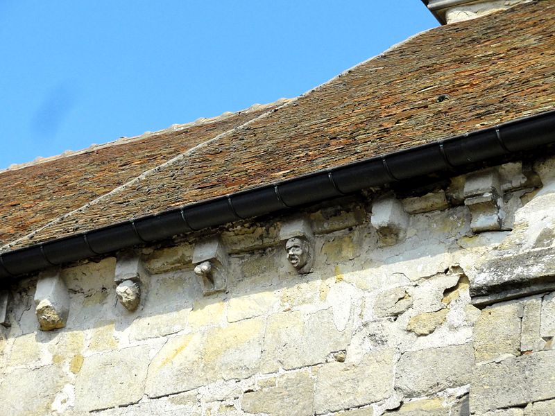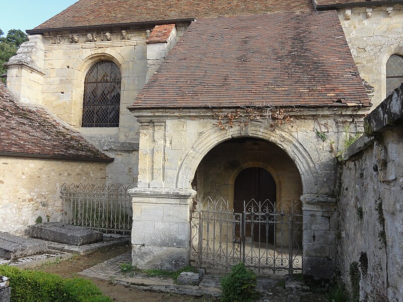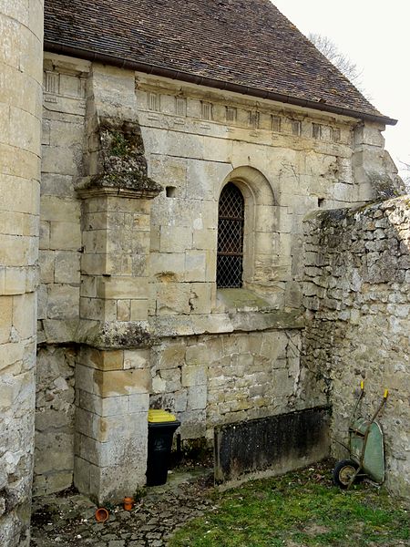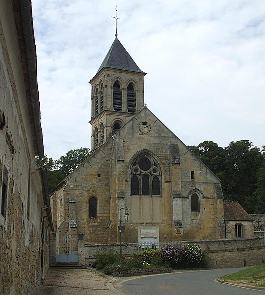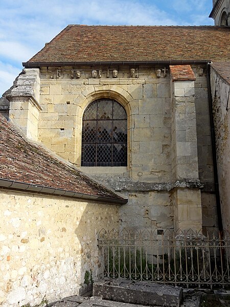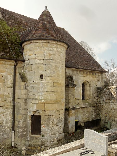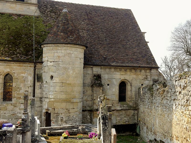 Extérieurement, l'église est bâtie en pierre de taille d'une carrière locale ; le chevet plat révèle deux campagnes de construction et est animé par contreforts et corniches. Les parties Renaissance se lisent dans la tourelle d'escalier ronde et dans la frise extérieure des Apôtres et Évangélistes, éléments extérieurs de facture tardive liés aux aménagements seigneuriaux. L'enclos et l'environnement immédiat ont été affectés par l'emprise du château : la façade occidentale ouvre sur le parc seigneurial et n'est pas visible depuis la voie publique, le cimetière ancien s'étend essentiellement au nord de l'église et une partie du terrain au sud est enclavée entre communs et chapelle.