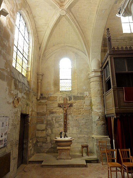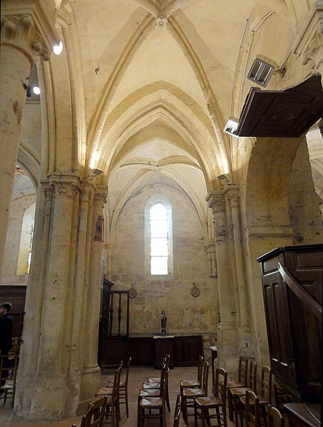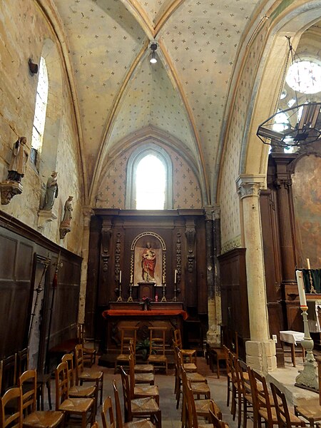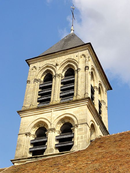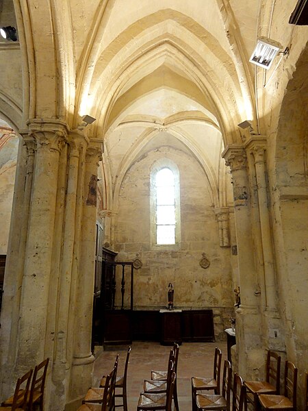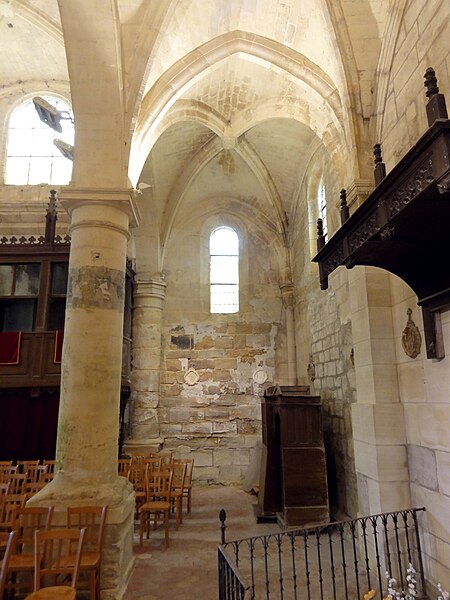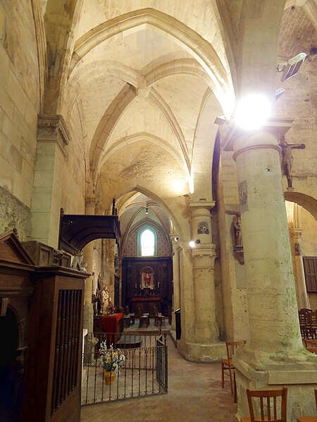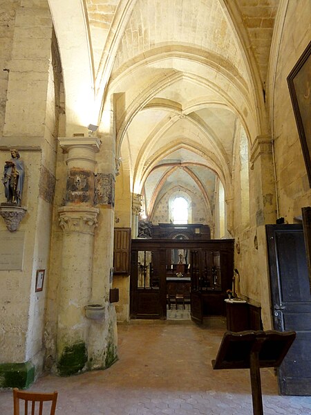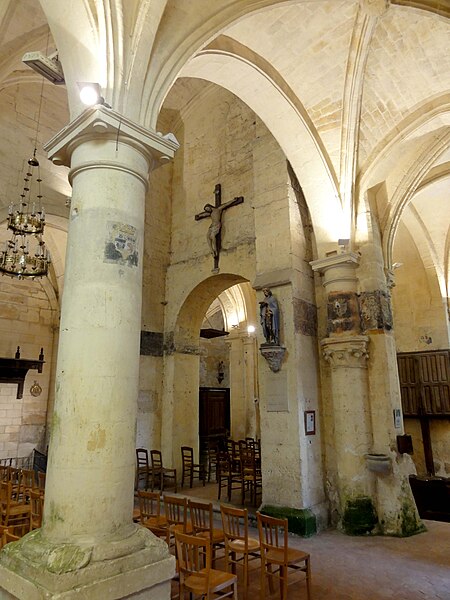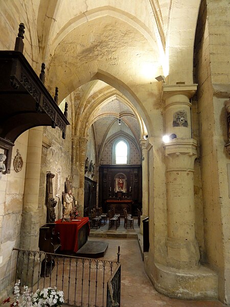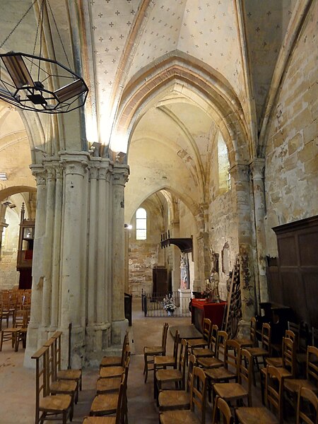 L'édifice, orienté selon un plan cruciforme inscrit dans un rectangle, se compose d'une nef de deux travées voûtées d'ogives, de bas-côtés, d'une base de clocher servant de croisée du transept, d'un chœur d'une vaste travée flanqué d'une chapelle nord et d'une chapelle sud de deux travées. L'intérieur présente deux niveaux d'élévation : grandes arcades et niveau supérieur aveugle dans la nef, et anciennes galeries ouvertes sur combles dans le chœur. La nef, malgré son voûtement tardif, paraît homogène ; les grandes arcades retombent sur des tailloirs carrés et des supports de types distincts selon la règle de la superposition des ordres. Les bas-côtés mêlent réminiscences gothiques et motifs de la Renaissance, et conservent quelques fenêtres en plein cintre et lancettes. Les croisillons et les chapelles orientales présentent des profils d'ogives et des tailloirs caractéristiques de la première période gothique, tandis que la base du clocher montre un remaniement gothique à l'instar des croisillons. Le clocher central comprend trois étages : la base romane remaniée et deux étages de beffroi gothiques, l'étage supérieur présentant des traits du style rayonnant tels que des arcatures et des colonnettes à chapiteaux aux profils élancés.