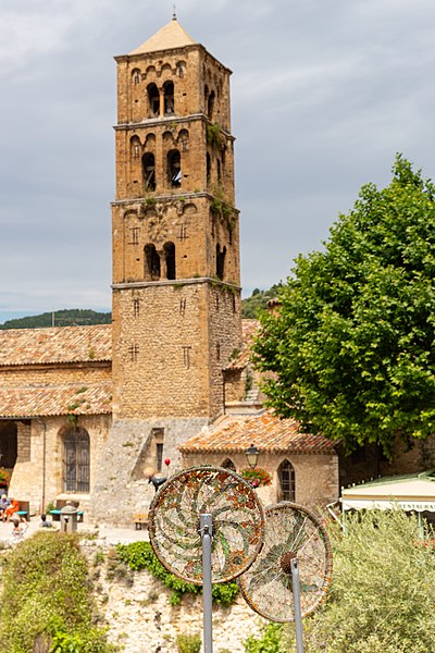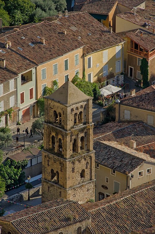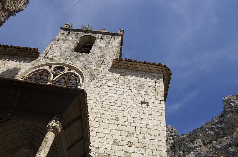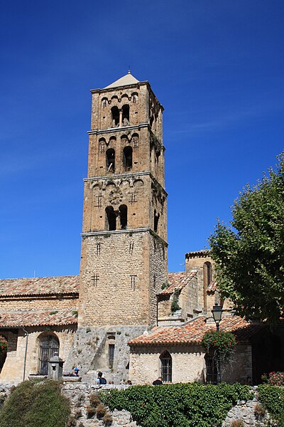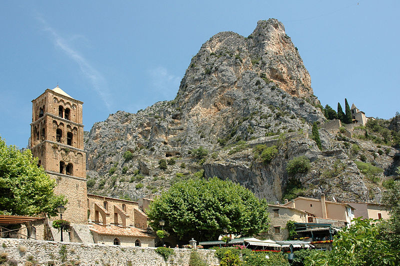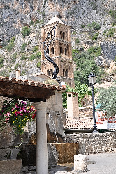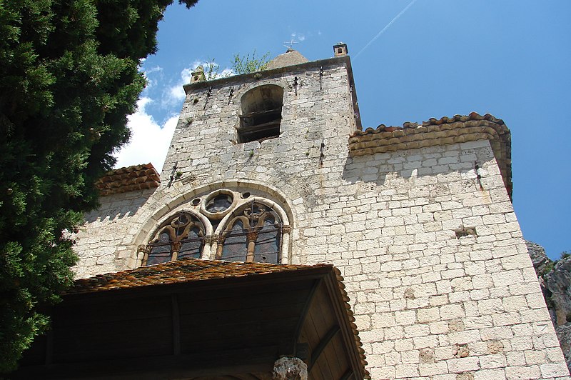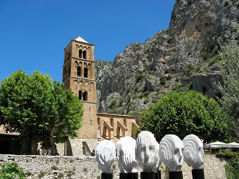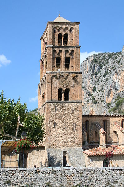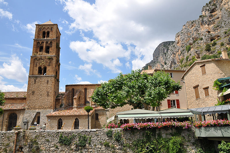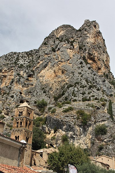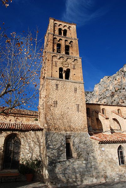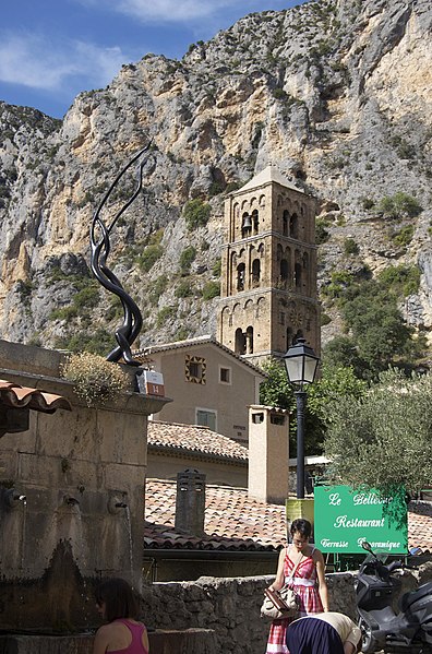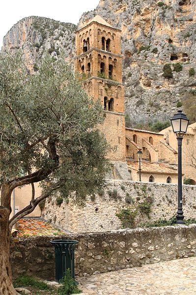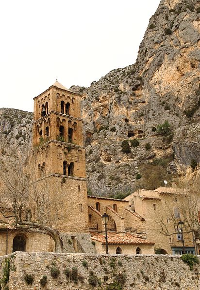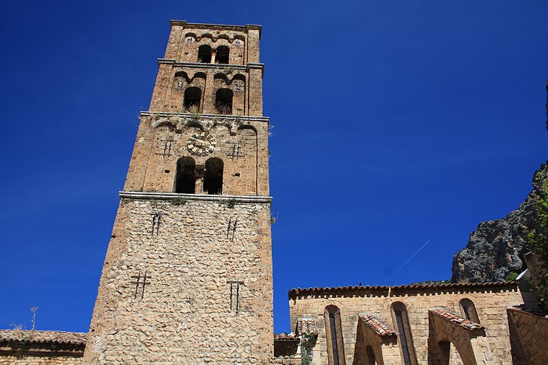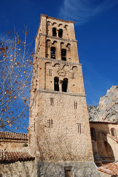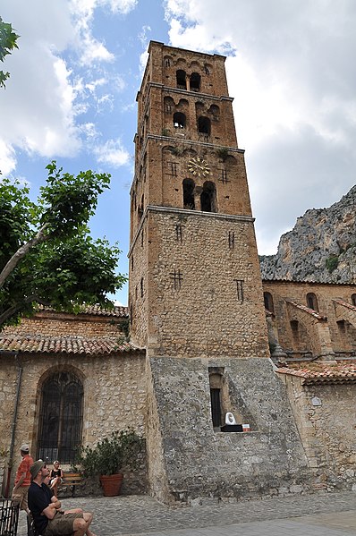 Le clocher, élément le plus remarquable, est de style roman lombard et bâti en tuf calcaire. Il comporte cinq niveaux : un premier niveau renforcé par de puissants contreforts, un niveau aveugle et trois étages ornés de baies géminées et de bandes lombardes. Les baies sont séparées par des colonnettes, sauf à l'avant-dernier étage où des piliers les séparent. Autrefois le clocher oscillait sous l'effet des cloches ; au XVIIe siècle le prieur Jean de Bertet le fit barder de fer et lui adjoignit de solides contreforts pour le consolider. Le clocher s'érige sur le site rocheux qui caractérise Moustiers, en contraste avec les rochers escarpés environnants.