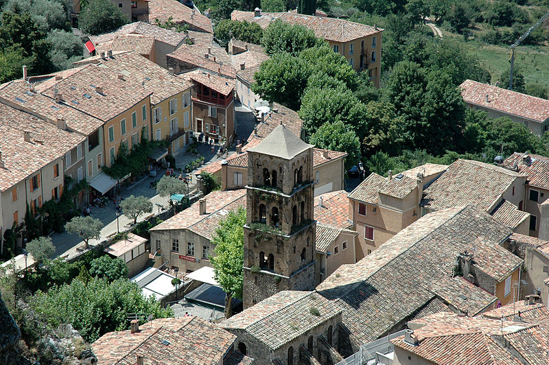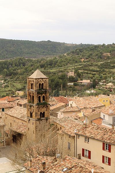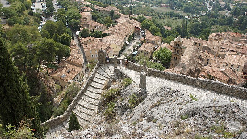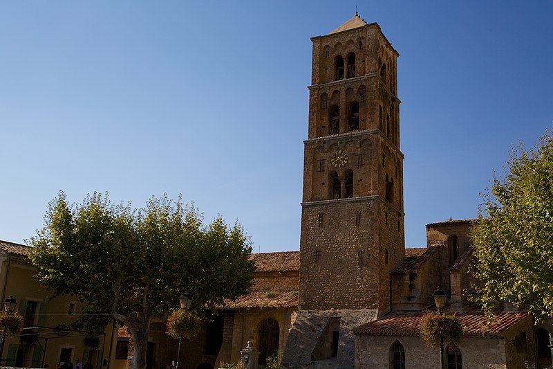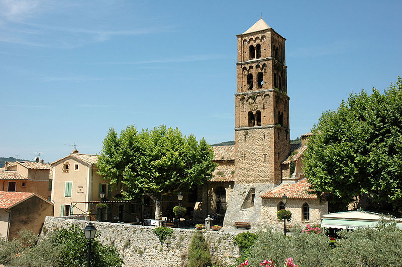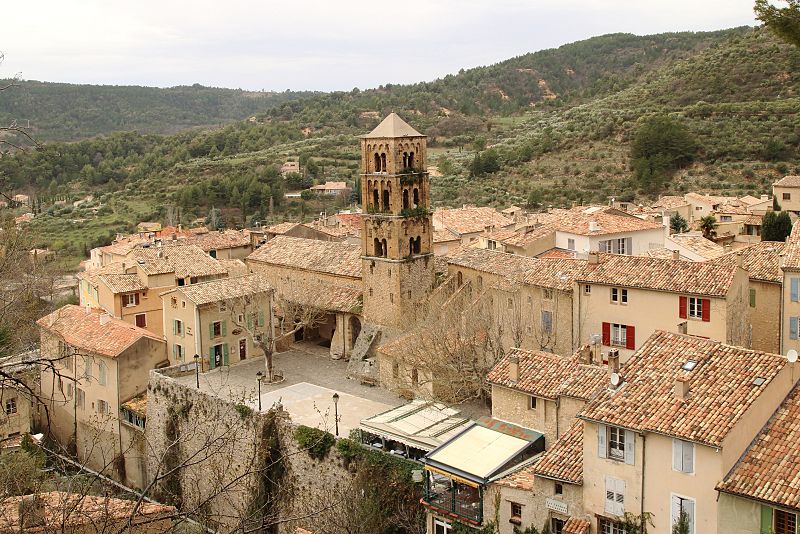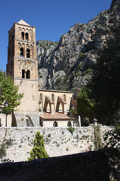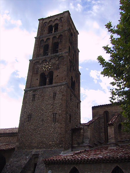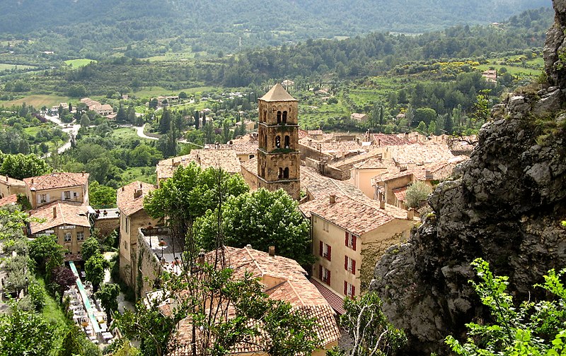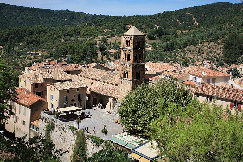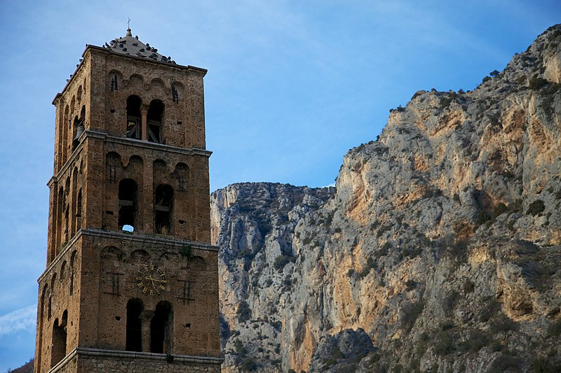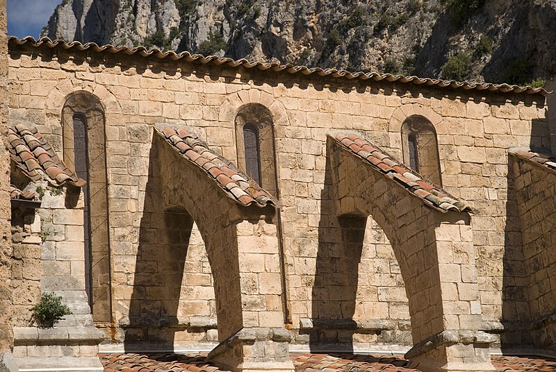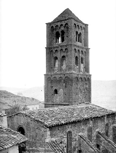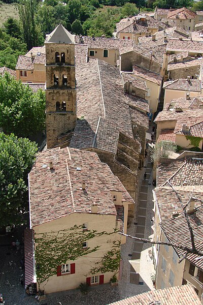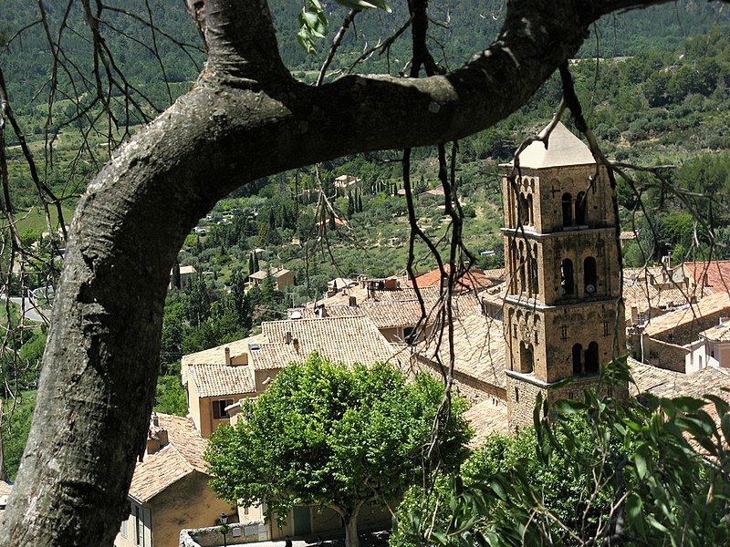 Le clocher, élément le plus remarquable, est de style roman lombard et bâti en tuf calcaire. Il comporte cinq niveaux : un premier niveau renforcé par de puissants contreforts, un niveau aveugle et trois étages ornés de baies géminées et de bandes lombardes. Les baies sont séparées par des colonnettes, sauf à l'avant-dernier étage où des piliers les séparent. Autrefois le clocher oscillait sous l'effet des cloches ; au XVIIe siècle le prieur Jean de Bertet le fit barder de fer et lui adjoignit de solides contreforts pour le consolider. Le clocher s'érige sur le site rocheux qui caractérise Moustiers, en contraste avec les rochers escarpés environnants.