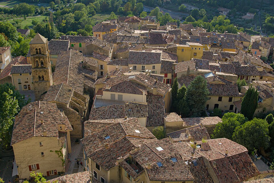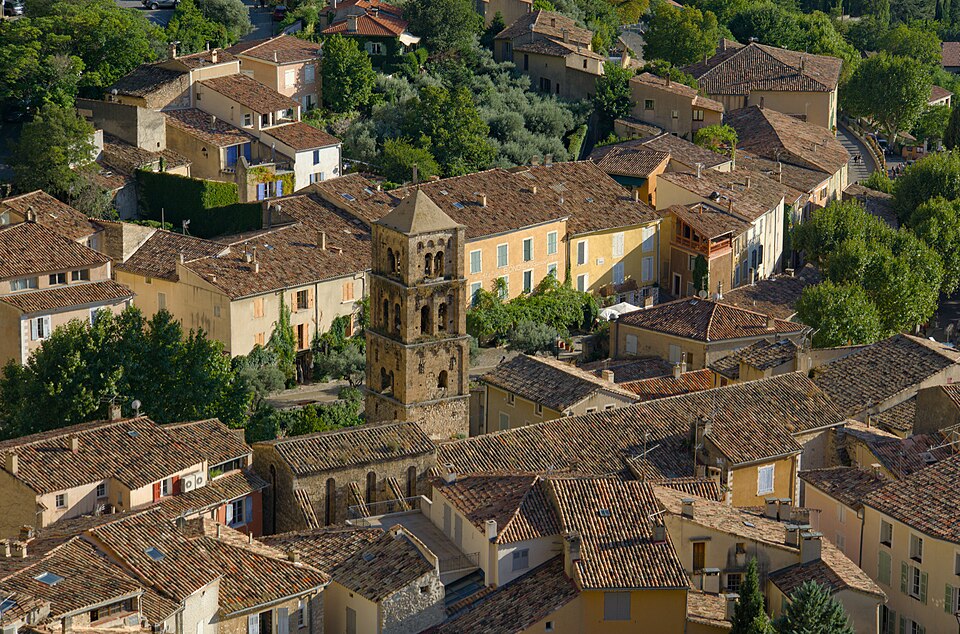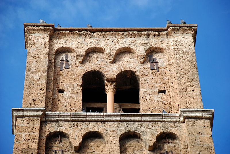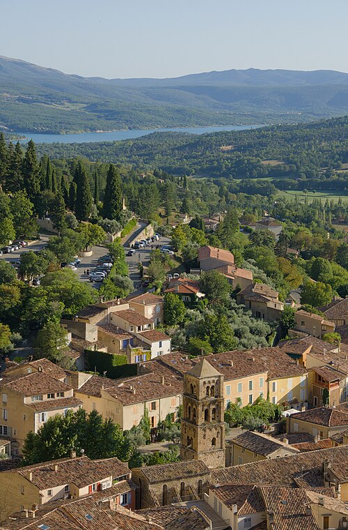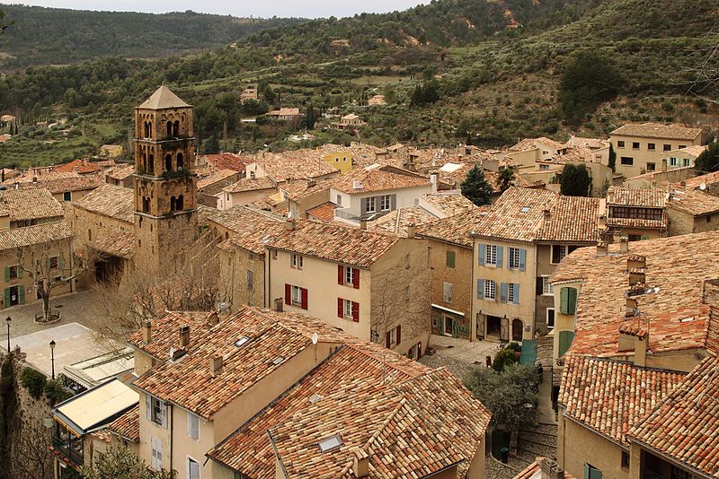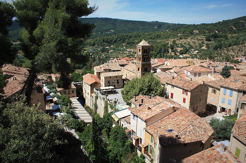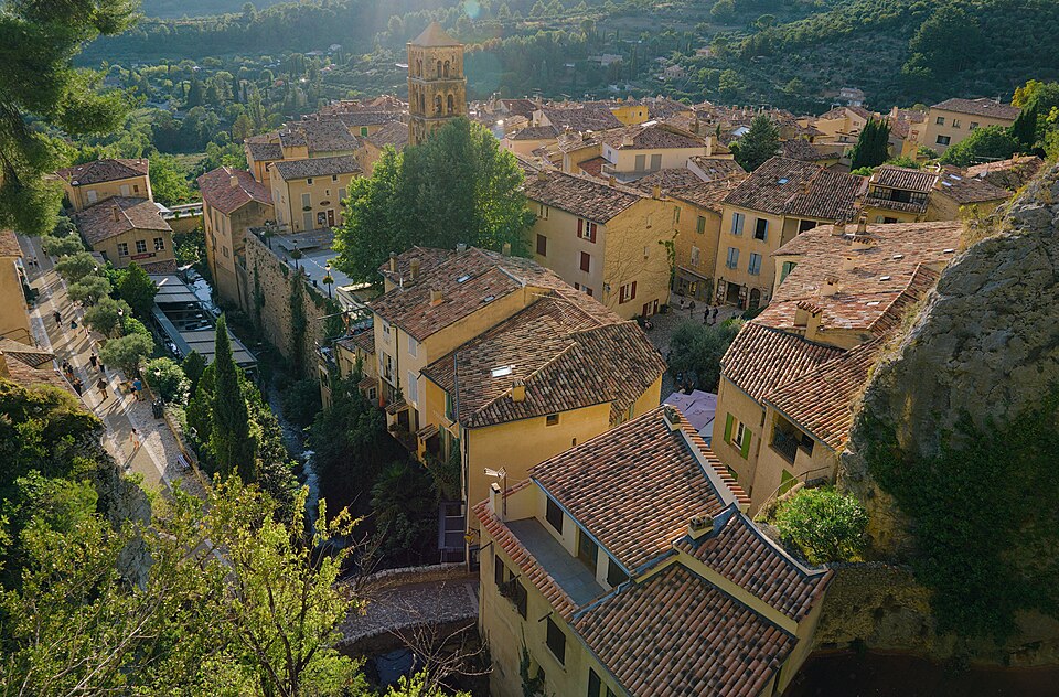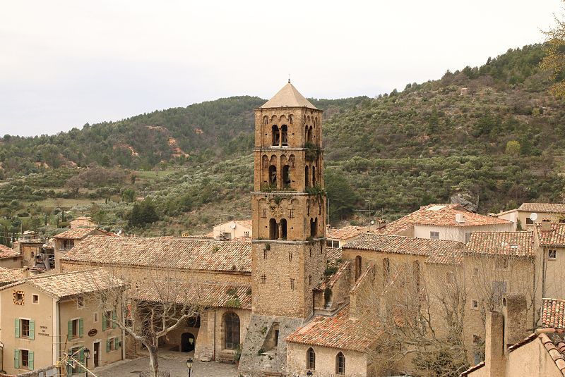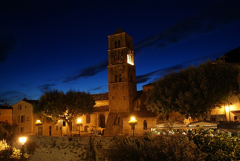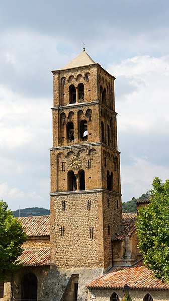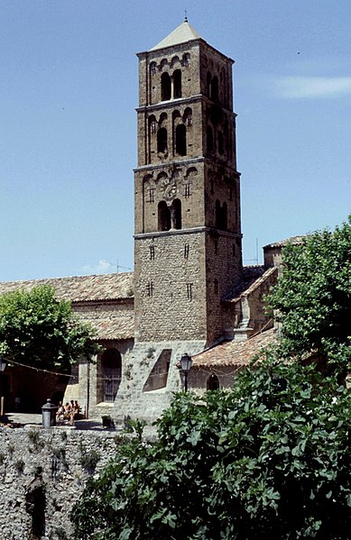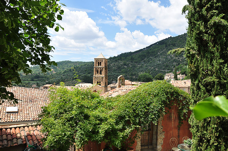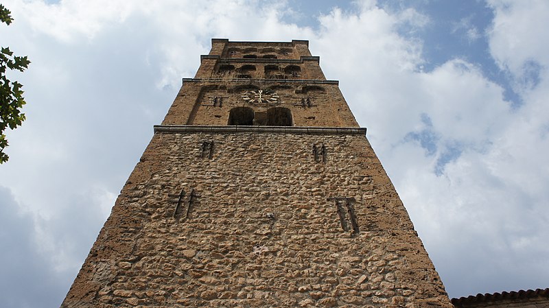 Le clocher, élément le plus remarquable, est de style roman lombard et bâti en tuf calcaire. Il comporte cinq niveaux : un premier niveau renforcé par de puissants contreforts, un niveau aveugle et trois étages ornés de baies géminées et de bandes lombardes. Les baies sont séparées par des colonnettes, sauf à l'avant-dernier étage où des piliers les séparent. Autrefois le clocher oscillait sous l'effet des cloches ; au XVIIe siècle le prieur Jean de Bertet le fit barder de fer et lui adjoignit de solides contreforts pour le consolider. Le clocher s'érige sur le site rocheux qui caractérise Moustiers, en contraste avec les rochers escarpés environnants.
