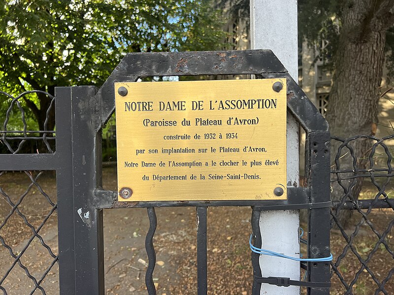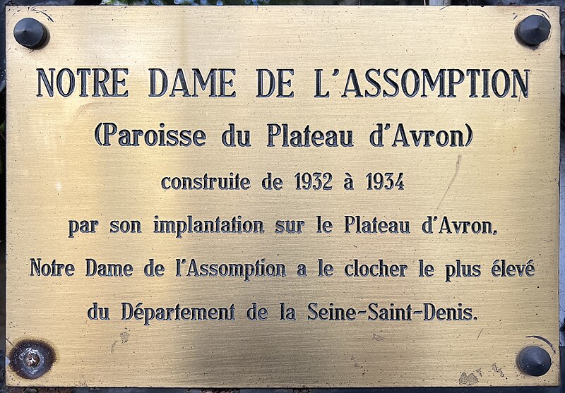 L'église Notre‑Dame de l'Assomption, dite Notre‑Dame d'Avron, est l'église paroissiale de Neuilly‑Plaisance, en Seine‑Saint‑Denis; elle est dédiée à l'Assomption et dépend du diocèse de Saint‑Denis, bâtie sur le plateau d'Avron. Au début du XXe siècle il n'y avait pas d'église sur ce plateau, lieu voué à sainte Marie depuis le XVIIe siècle, où un hameau avait disparu lors de la construction d'un château entre 1634 et 1649. En 1926 l'abbé Ernest Laforge convainquit Mgr Gibier, évêque de Versailles, d'ériger une église à cet emplacement, décision soutenue par des intellectuels catholiques de l'époque tels que François Mauriac, Paul Claudel et André Maurois. En 1928 un terrain boisé avec mare fut cédé à l'évêché pour une somme quasi symbolique et une souscription locale permit de réunir les fonds nécessaires; les travaux, confiés à l'architecte Henri Cornus, furent entrepris en 1932 et l'édifice y fut construit la même année. Dans les années 1930, alors que la « ceinture rouge » s'étendait autour de Paris, l'Église cherchait à renforcer sa présence en banlieue; cet ouvrage, sans faire partie des Chantiers du Cardinal, s'inscrit dans cette dynamique. L'église devint paroissiale le 14 décembre 1958. Le bâtiment, de plan allongé orienté nord‑est, est construit en béton bouchardé à remplissage de briques et son style architectural est proche de celui de l'église Notre‑Dame du Raincy. En raison de la nature du sous‑sol, l'édifice repose sur une trentaine de pieux en béton enfoncés jusqu'au gypse. La façade est percée d'une baie tripartite en arc brisé ornée d'une résille de béton destinée à recevoir les vitraux; les verrières comprennent 26 vitraux exécutés par le maître‑verrier Louis Barillet, composés de claustras en béton et de vitraux en plomb enchâssés dans le ciment. Le clocher, de base carrée formée de trois parties superposées et relié par une passerelle à une tourelle d'accès, est flanqué de deux clochetons et surmonté d'une flèche de base quadrangulaire. L'intérieur offre une nef unique de quatre travées séparées par des arcs engagés qui supportent des arcs de béton. Le chemin de croix, les fonts baptismaux et le bénitier sont réalisés en mosaïque par Léon Guillemaind; la statue de la Vierge est due à Georges Serraz, et les statues de saint‑Joseph et du Sacré‑Cœur à Charles Jacob, cette dernière étant inscrite à l'inventaire des monuments historiques. Devant l'église se trouve un chêne planté en 1880 en souvenir d'une bataille survenue pendant la guerre de 1870.