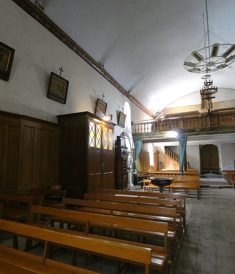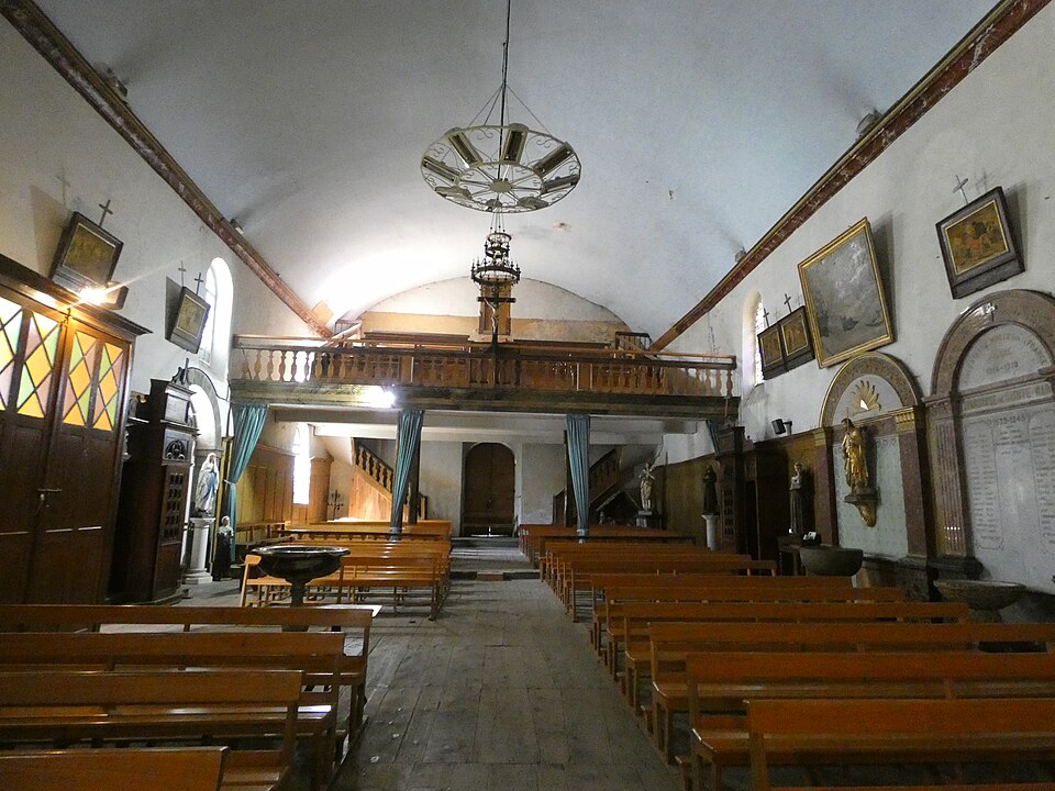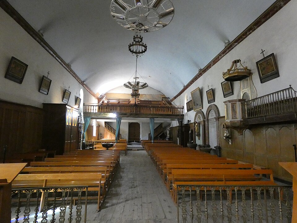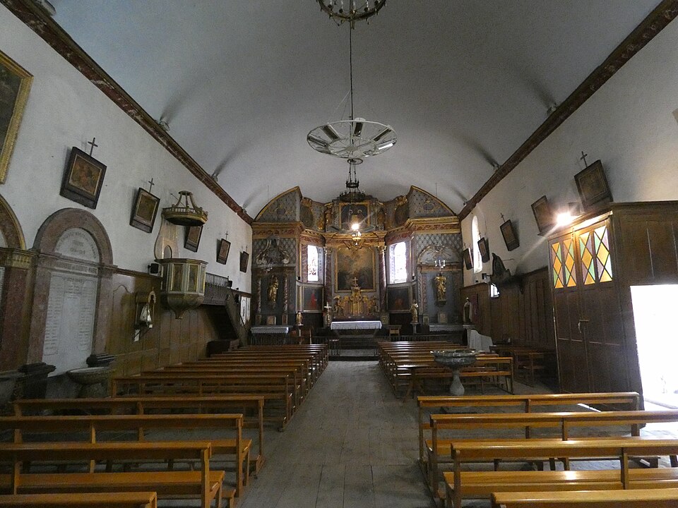 L'église présente une nef unique qui se prolonge par un chevet pentagonal, contre lequel s'appuient la sacristie, le porche et le massif du clocher. Le porche, élevé au XVIIIe siècle, est formé d'une série d'arcades en plein cintre en marbre et, adossé à la nef, abrite une porte de bois cloutée encadrée de marbre. Le clocher, de plan carré, s'adosse également à la nef. Dans la seconde moitié du XVIIIe siècle, l'édifice a été agrandi à partir du massif occidental (1769-1778). L'intérieur est décoré de lambris et le fond est occupé par une tribune de bois accessible par deux escaliers latéraux.