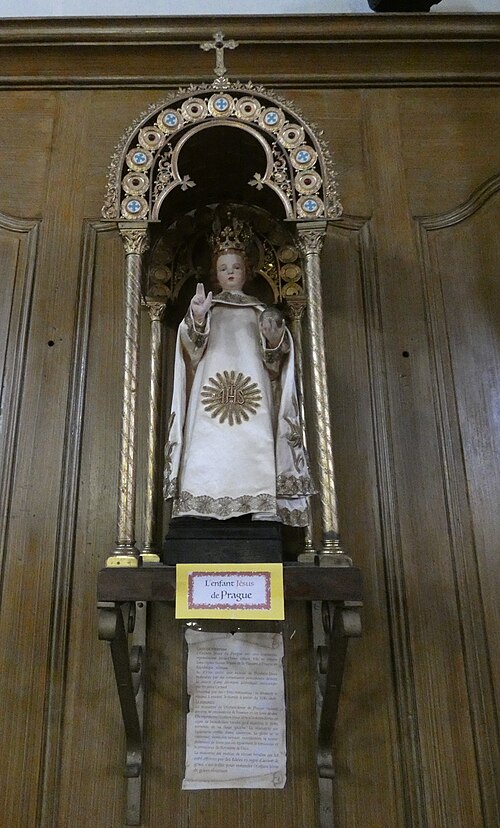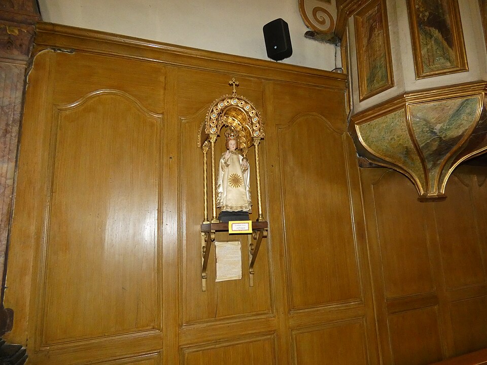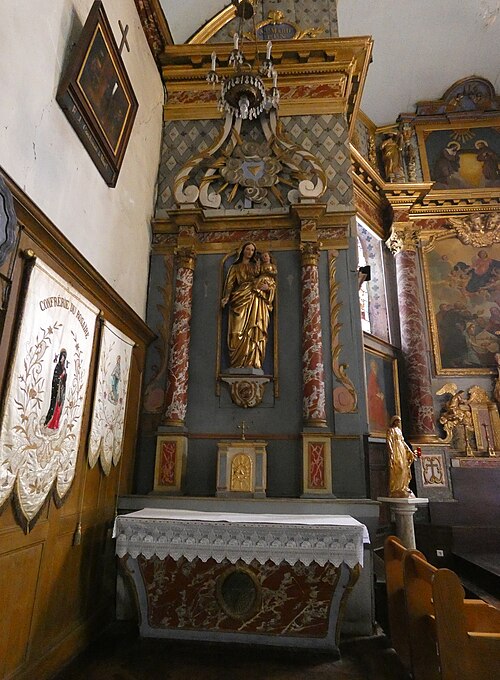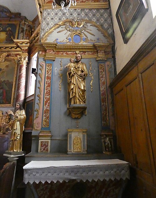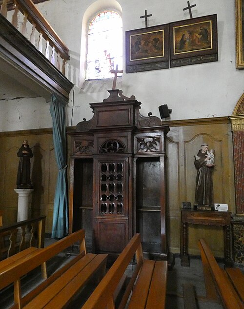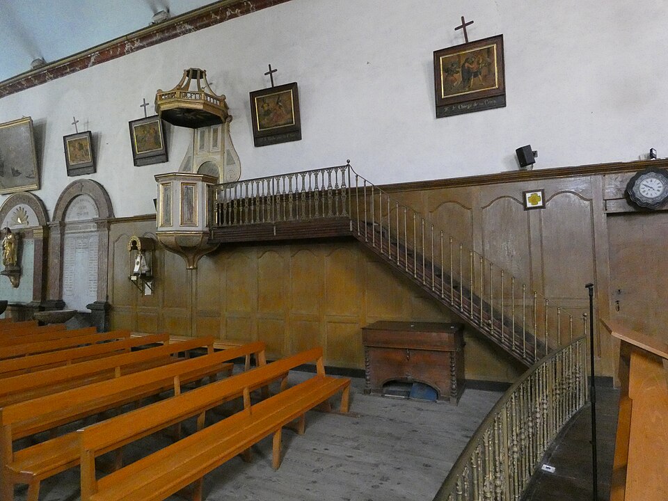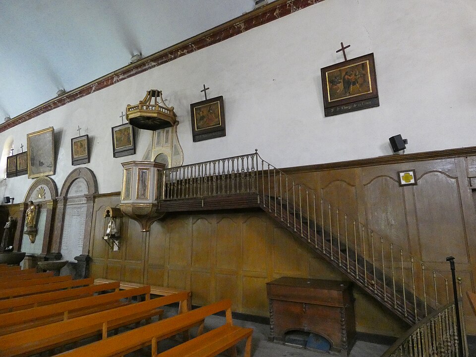 L'église présente une nef unique qui se prolonge par un chevet pentagonal, contre lequel s'appuient la sacristie, le porche et le massif du clocher. Le porche, élevé au XVIIIe siècle, est formé d'une série d'arcades en plein cintre en marbre et, adossé à la nef, abrite une porte de bois cloutée encadrée de marbre. Le clocher, de plan carré, s'adosse également à la nef. Dans la seconde moitié du XVIIIe siècle, l'édifice a été agrandi à partir du massif occidental (1769-1778). L'intérieur est décoré de lambris et le fond est occupé par une tribune de bois accessible par deux escaliers latéraux.