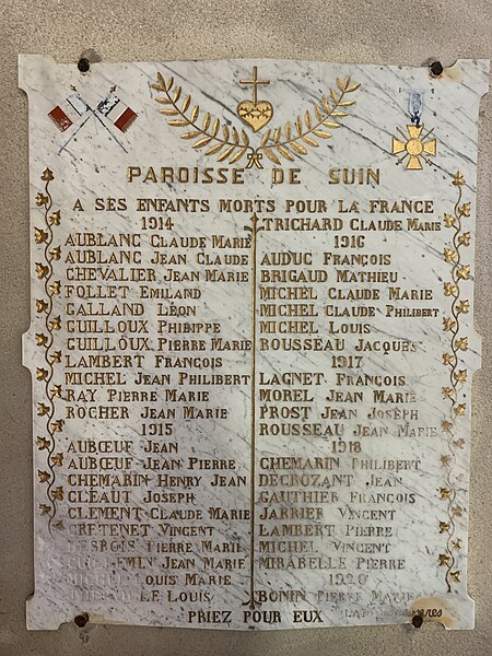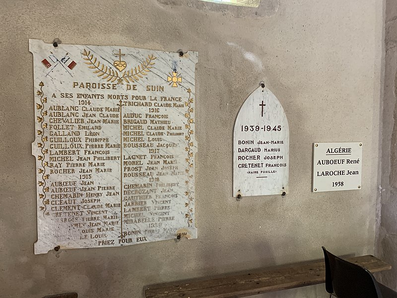 L'église Notre-Dame-de-l'Assomption est un édifice roman situé à Suin, en Saône-et-Loire (Bourgogne-Franche-Comté). Le clocher fait l'objet d'une inscription au titre des monuments historiques depuis le 11 mai 1932 et l'abside depuis le 13 mars 1950. Le chevet présente un bel abside semi-circulaire rythmé par des pilastres, percé de fenêtres et couvert de lauzes. Le clocher roman qui coiffe l'édifice comporte, aux deux étages supérieurs, des baies cintrées géminées : celles de l'avant-dernier étage sont séparées par un pilastre, tandis que celles du dernier étage sont séparées par une colonne et encadrées latéralement par des pilastres cannelés. L'église est répertoriée parmi les monuments historiques de Saône-et-Loire et fait l'objet de ressources documentaires en ligne, notamment sur Clochers de France, la base Mérimée et MusicBrainz.