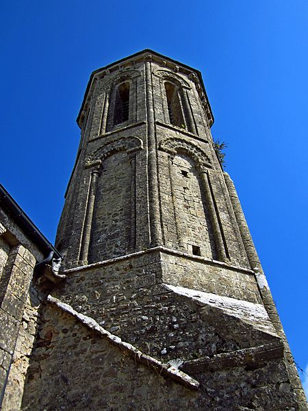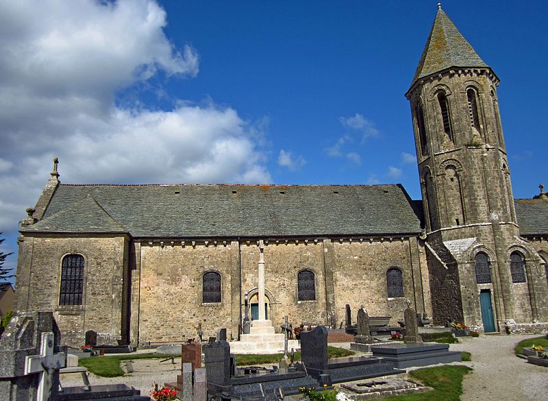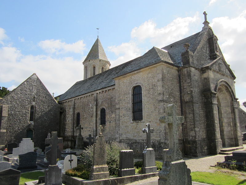 L'édifice présente une nef, un chœur et un clocher octogonal aux caractères romans, tandis que la façade a été remaniée au XVIIIe siècle; une chapelle latérale ajoutée au XIIIe siècle se trouve à gauche du chœur. La porte romane de la façade sud, aujourd'hui bouchée, est décorée de billettes, d'étoiles creuses et d'un tore et encadrée de deux colonnettes. Le clocher, à base carrée et accolé à la première travée sud du chœur, a reçu au XIIe siècle une tour octogonale à deux étages surmontée d'une courte flèche couverte de schiste; le premier étage présente sur quatre faces des fenêtres aveugles décorées de bâtons brisés, le second est ajouré de huit ouvertures ornées de frettes crénelées. Construit en pierre calcaire, probablement issue de la carrière d'Yvetot-Bocage, ses angles sont adoucis par des boudins. Dans la nef à quatre travées, l'arc triomphal repose sur deux chapiteaux, dont l'un représente une chasse au cerf, attribuée à la figure de saint Hubert.
