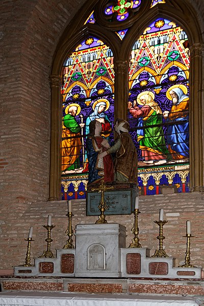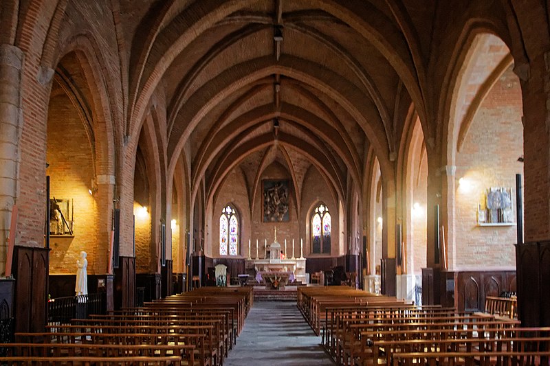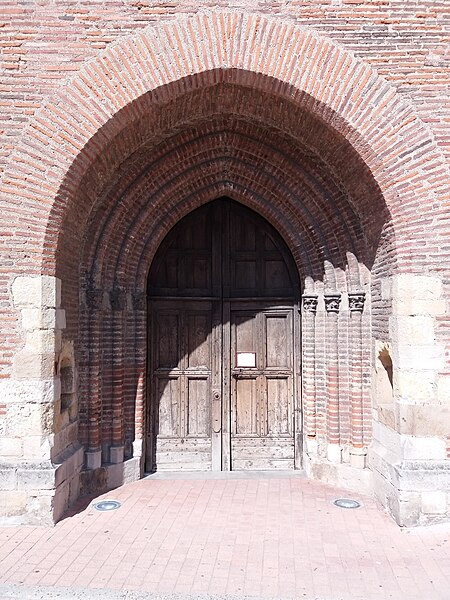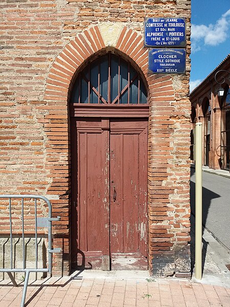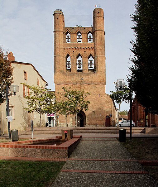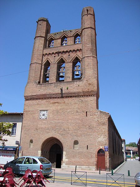 L'église Notre-Dame-de-l'Assomption de Villefranche-de-Lauragais (Haute-Garonne) présente un mur-clocher percé de deux étages de baies et encadré de deux tours aux angles abattus. La porte d'entrée, placée dans l'axe, est en tiers point et le portail a un profil ogival. L'archivolte comporte plusieurs voussures ornées de petits chapiteaux et les colonnes présentent des chapiteaux à deux niveaux de feuillages. Une bande en dents d'engrenage marque la séparation entre le niveau de la voûte et le premier étage du clocher. Chacun des deux étages du clocher est percé de trois baies aux arcatures en forme de mitre. L'intérieur offre des voûtes gothiques surbaissées et une vaste nef, tandis que l'abside contient un retable du XVe siècle. Une statue polychrome représentant la Visitation, attribuée au début du XVIe siècle, se trouve également dans l'église. L'édifice est construit en briques cuites dans la tuilerie seigneuriale de Villefranche; l'argile locale lui donne une teinte rosée appelée « chafrénad ». L'église fut bâtie au XIIIe siècle, en 1262, par Jeanne de Toulouse, qui mourut de la peste. Elle a été élevée devant la route royale, devenue après la Révolution la grande rue. En 1285, le roi Philippe III, la reine Marie de Brabant et leur suite firent halte à Villefranche et visitèrent l'église pour prier en mémoire de Jeanne de Toulouse. Au Moyen Âge, l'assemblée communautaire se réunissait dans l'église. Plusieurs visites pastorales au XVIe siècle ont permis de décrire l'agencement de l'édifice à différentes époques. Une Sainte-Trinité en grès, autrefois placée sur la façade droite, se trouve aujourd'hui à l'intérieur. Le clocher-mur abrite trois cloches; l'une date de 1548, une autre de 1584, la troisième n'est pas répertoriée. Après le concordat de 1801, un archiprêtre, gouvernant pour l'archevêque, officia à Villefranche-de-Lauragais au lieu de Gardouch. L'édification résulte d'un paréage entre Sicard Alamav et le chevalier Guillaume Pierre de Vasagne, seigneur de Gardouch, et les terrains furent bénis avant la construction. Les ouvriers du chantier étaient principalement des serfs en quête d'affranchissement et des vilains francs, et des bœufs servaient au transport des charges lourdes. L'église abrite un orgue construit en 1850 par Frédéric Jungk, remanié en 1920 par Théodore Puget, inauguré par Georges Débat-Ponsan et restauré en 2001 par Gérard Bancells. L'instrument compte dix-huit jeux répartis sur deux claviers et un pédalier; l'organiste titulaire est Emanuel Zozor. Le clocher a été inscrit au titre des monuments historiques en 1927. Parmi les représentations et vues connues figurent une image de Jeanne, comtesse de Toulouse, une aquarelle du XIXe siècle, le clocher-mur, la Sainte-Trinité, la Visitation et des vitraux. Une monographie intitulée Villefranche ; Bastide royale est conservée à la bibliothèque municipale de Villefranche-de-Lauragais.