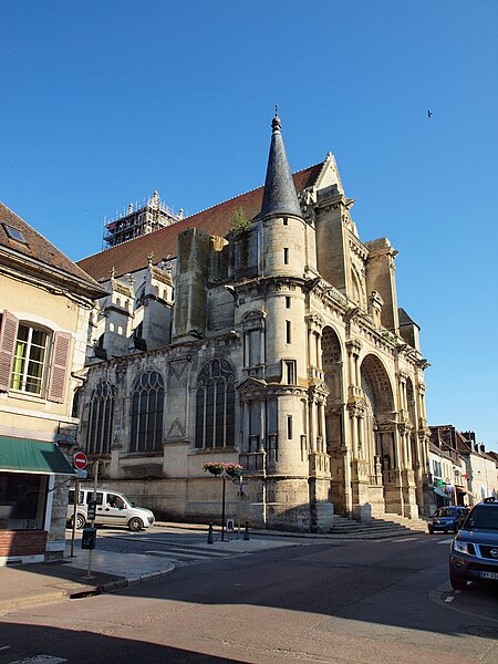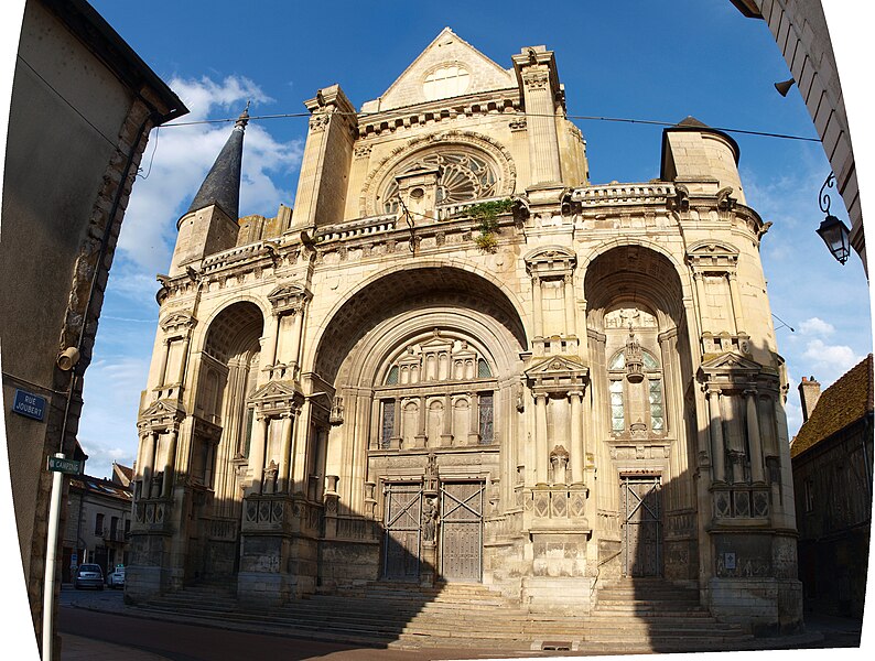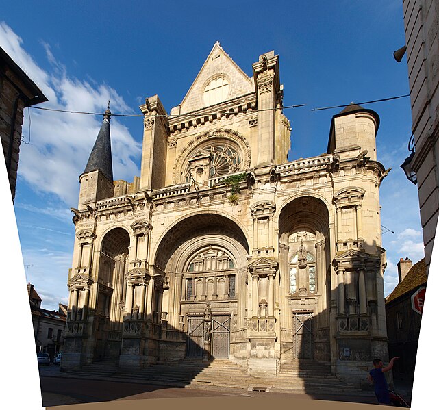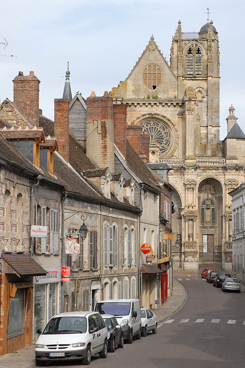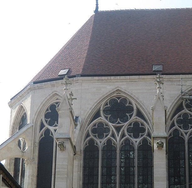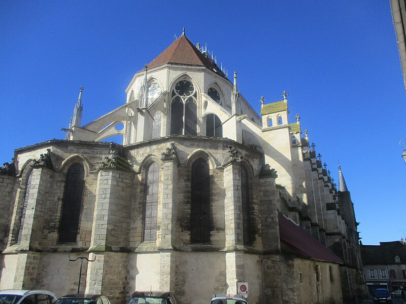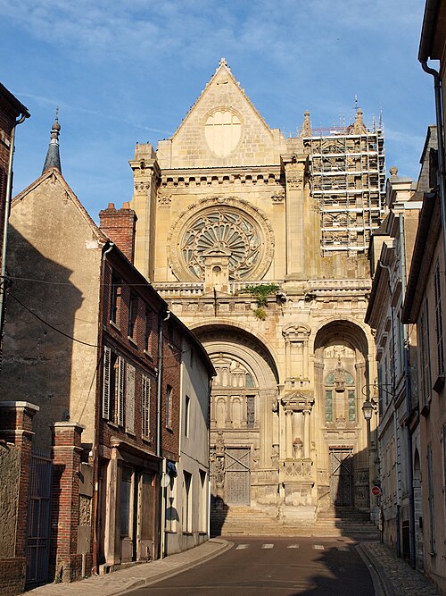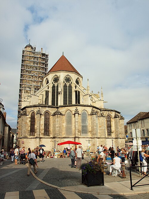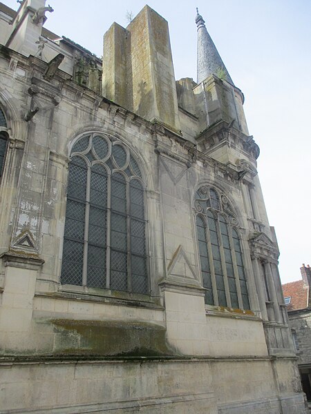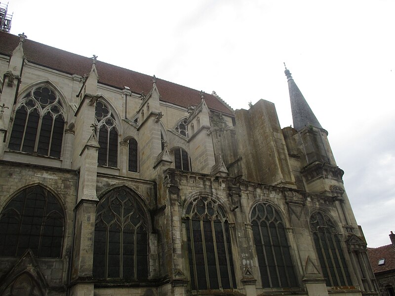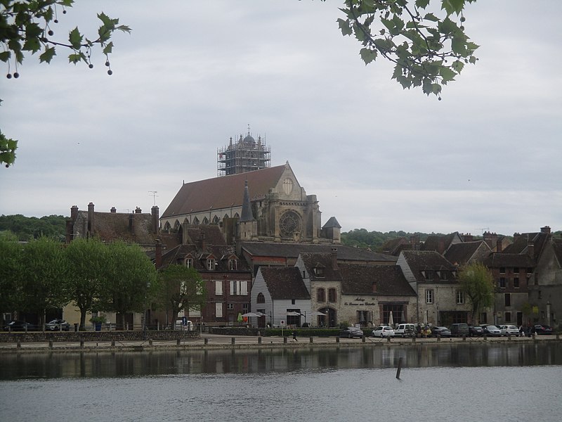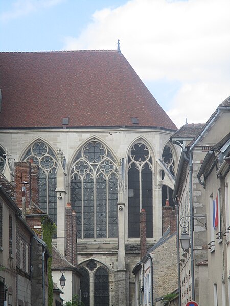 Les vitraux comptent vingt verrières des XIIIe, XIVe et XVIe siècles, classées aux Monuments historiques en 1992. Le vitrail de la chapelle Saint-Nicolas illustre la vie du saint, avec en bas à droite la Pêche miraculeuse, et le vitrail de la Crucifixion, donné en 1529 par le prévôt Claude Dindelle qui s'y représente avec sa femme, a vu son panneau central remplacé par une Pietà de la Renaissance encadrée par la Vierge et saint Jean, tandis que Dieu le Père apparaît entouré des symboles des évangélistes. Les verrières du Jugement dernier, à la cinquième travée, sont attribuées à Jean Cousin le Jeune et présentent des détails proches de ceux des vitraux de l'église Saint-Pierre de Saint-Julien-du-Sault, en particulier la légende de saint Julien. Le grand vitrail Renaissance de la chapelle Notre-Dame-des-Vertus montre la Nativité de la Vierge, la Mort de la Vierge et l'Assomption et comporte le rare détail d'un homme portant des lunettes lisant devant le lit de la Vierge.