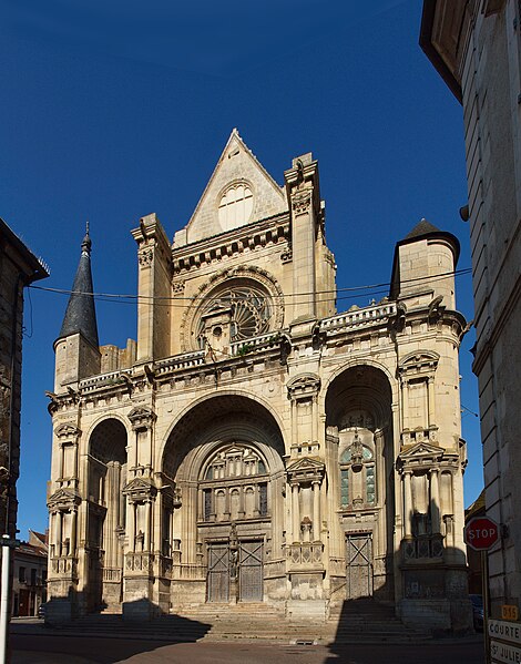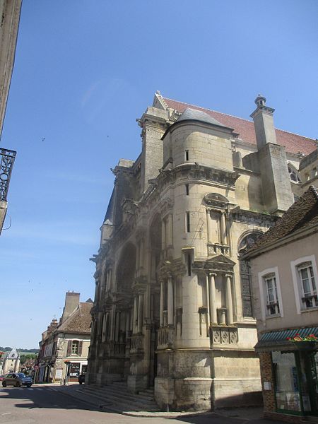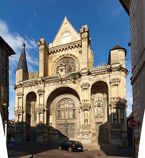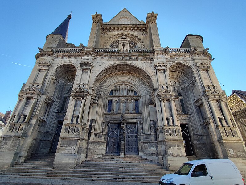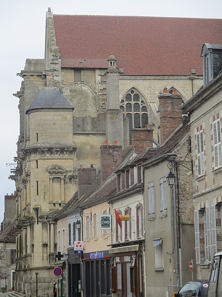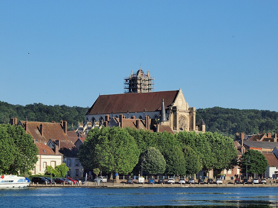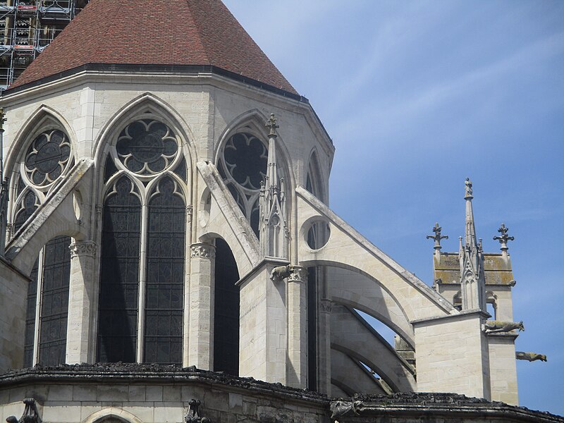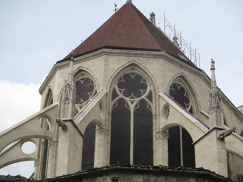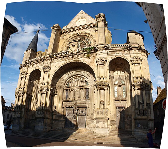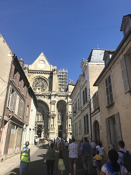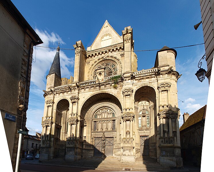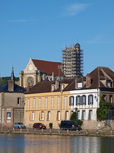 Les vitraux comptent vingt verrières des XIIIe, XIVe et XVIe siècles, classées aux Monuments historiques en 1992. Le vitrail de la chapelle Saint-Nicolas illustre la vie du saint, avec en bas à droite la Pêche miraculeuse, et le vitrail de la Crucifixion, donné en 1529 par le prévôt Claude Dindelle qui s'y représente avec sa femme, a vu son panneau central remplacé par une Pietà de la Renaissance encadrée par la Vierge et saint Jean, tandis que Dieu le Père apparaît entouré des symboles des évangélistes. Les verrières du Jugement dernier, à la cinquième travée, sont attribuées à Jean Cousin le Jeune et présentent des détails proches de ceux des vitraux de l'église Saint-Pierre de Saint-Julien-du-Sault, en particulier la légende de saint Julien. Le grand vitrail Renaissance de la chapelle Notre-Dame-des-Vertus montre la Nativité de la Vierge, la Mort de la Vierge et l'Assomption et comporte le rare détail d'un homme portant des lunettes lisant devant le lit de la Vierge.