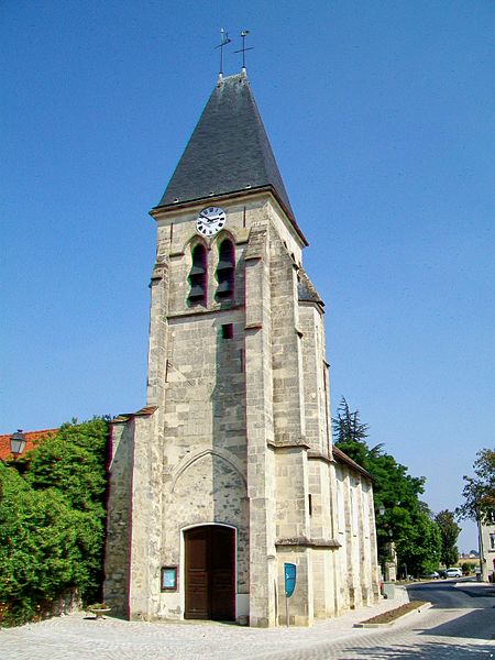 Au milieu du XIVe siècle, une église est mentionnée au nord de l'emplacement actuel, le clocher occupant déjà la position qu'il conserve aujourd'hui. Des reprises sont visibles dans ce clocher aux XVe et XVIe siècles, notamment des moulures à pénétration. L'édifice est dédié en 1531. Au début du XIXe siècle, l'église est en ruine. Entre 1845 et 1850, la nef actuelle est reconstruite en conservant l'entrée sous le clocher.